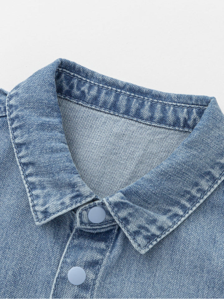 قميص جينز عملي بقصة مريحة وأزرار كبس أمامية وجيب على الصدر، يمنح إطلالة كاجوال عصرية.