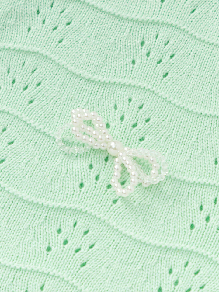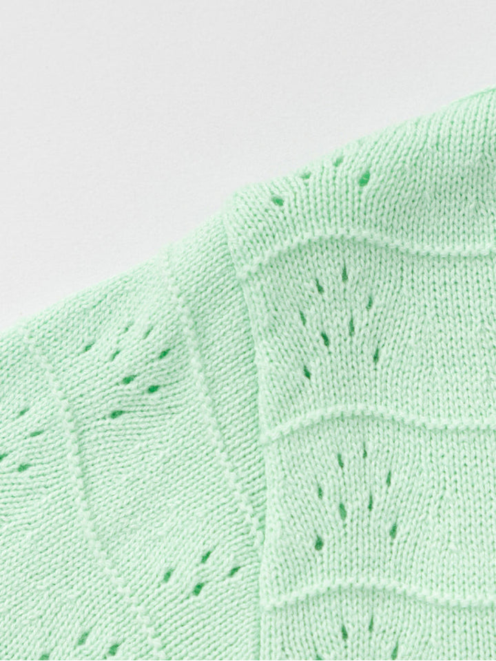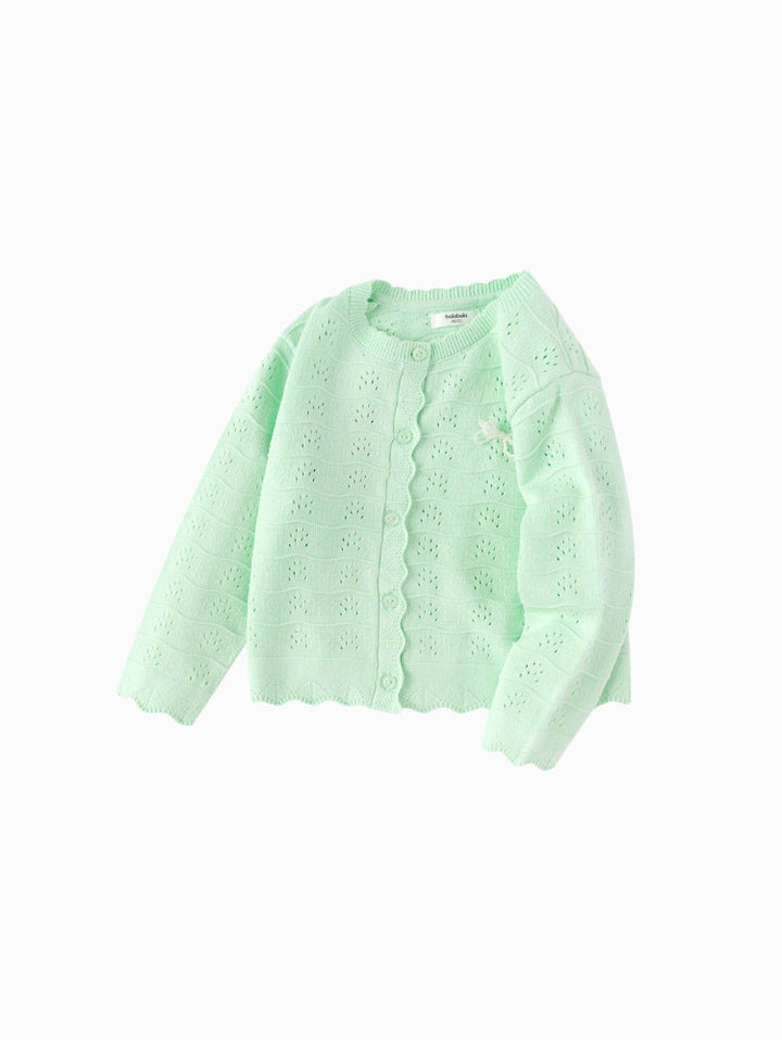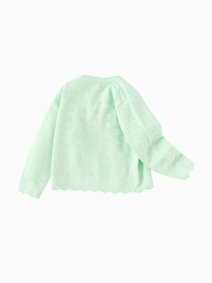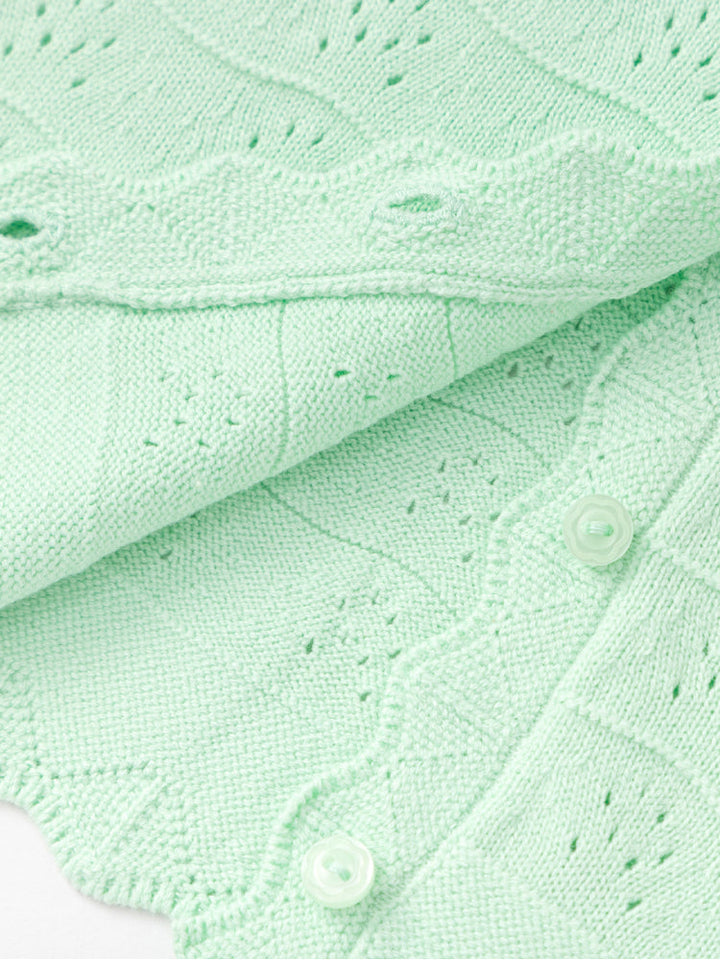 كارديغان محبوك ناعم بقصة مريحة وإغلاق بأزرار أمامية، مزين بتفاصيل منسوجة أنيقة تضفي لمسة جاذبية، مما يجعله خيارًا مثاليًا للارتداء كطبقة إضافية مع مختلف الإطلالات.