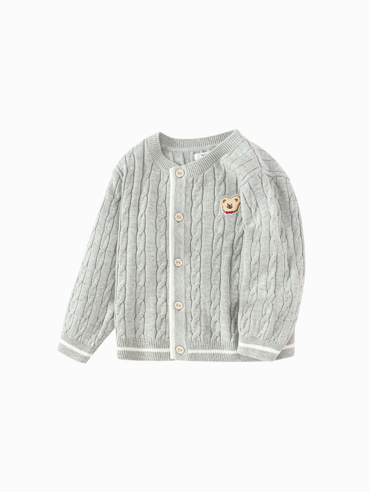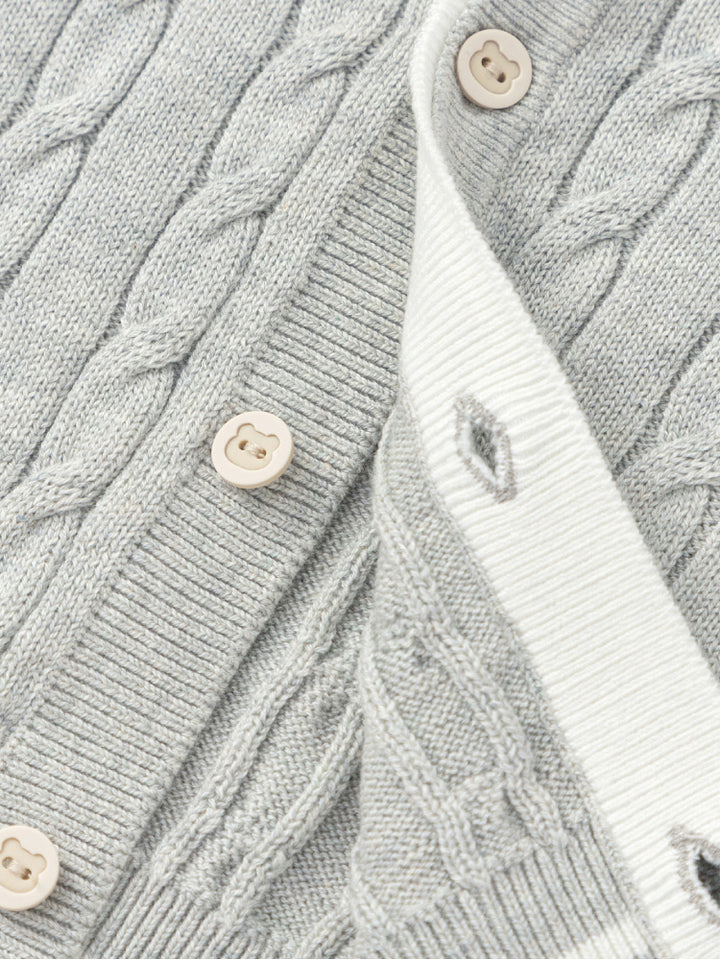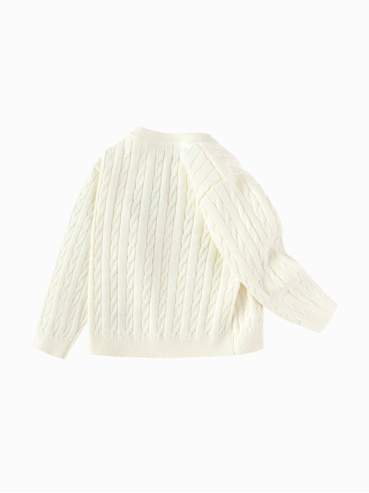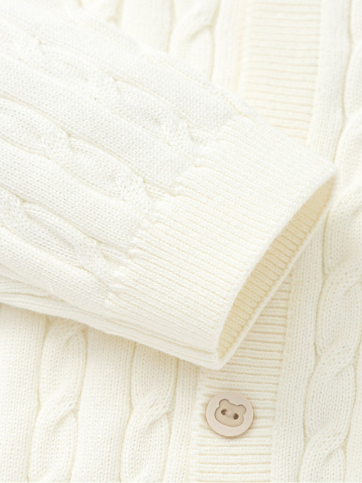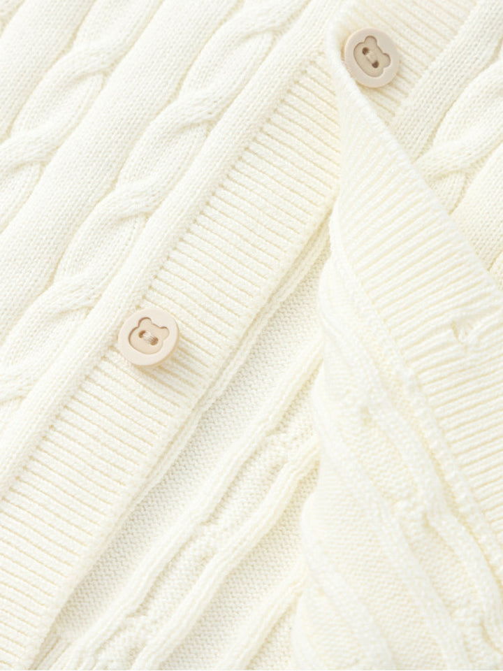 كارديغان محبوك ناعم بقصة مريحة وإغلاق بأزرار أمامية، مزين بتفاصيل منسوجة أنيقة تضفي لمسة جاذبية، مما يجعله خيارًا مثاليًا للارتداء كطبقة إضافية مع مختلف الإطلالات.