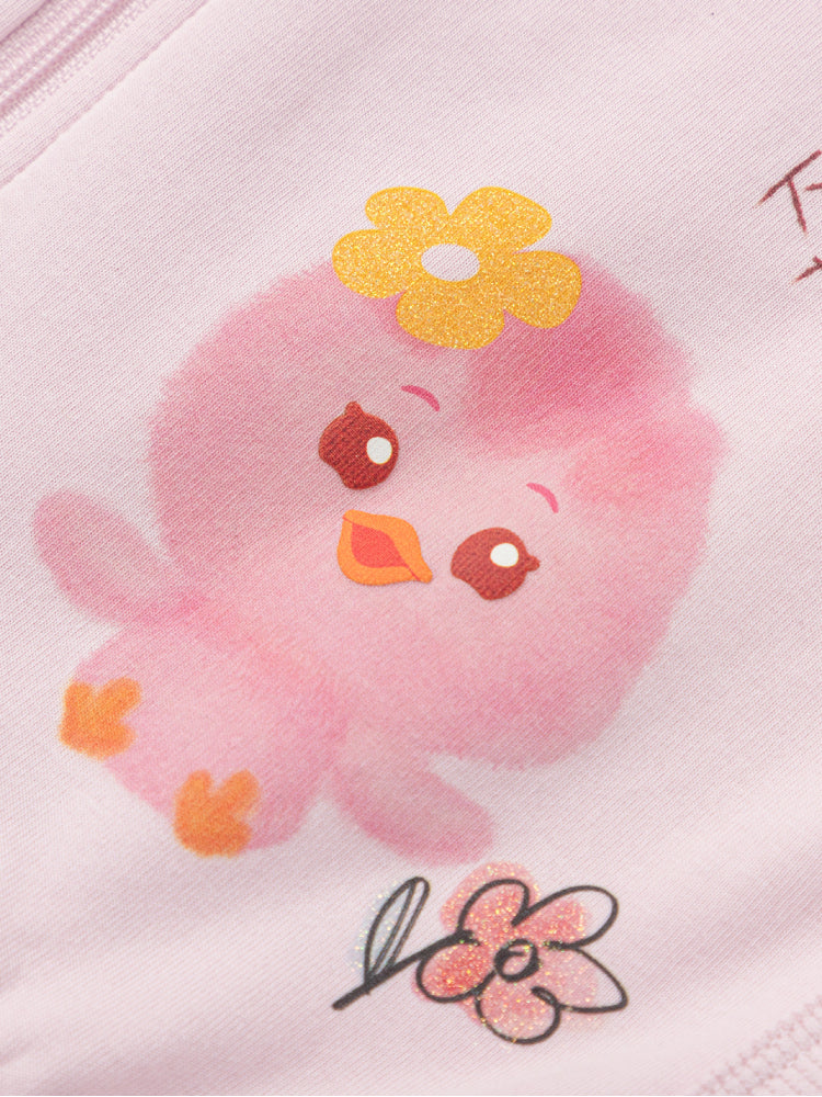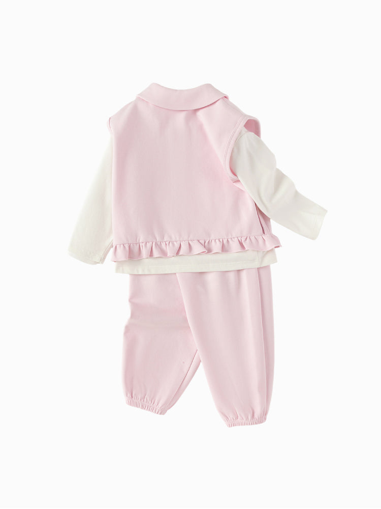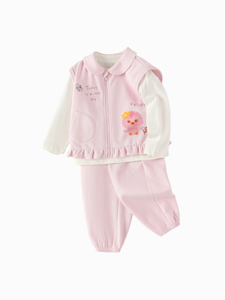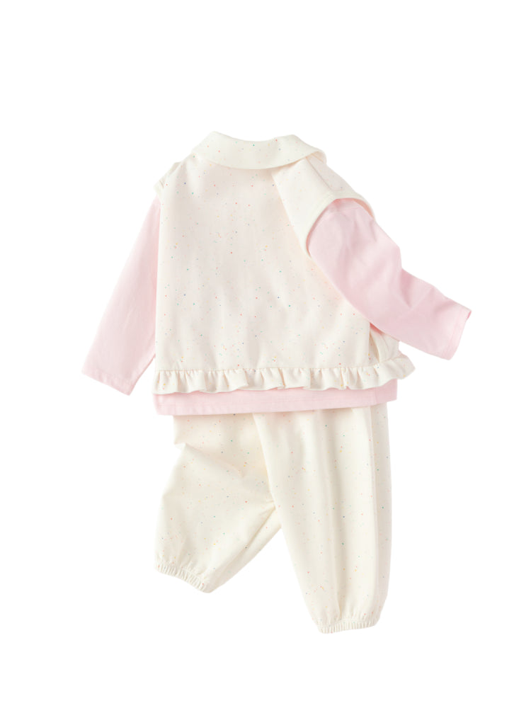 طقم مكون من ثلاث قطع متناسقة يشمل بلوزة وسروال وقطعة إضافية، مصمم بطبعات مرحة وخامات مريحة، مثالي للاستخدام اليومي.