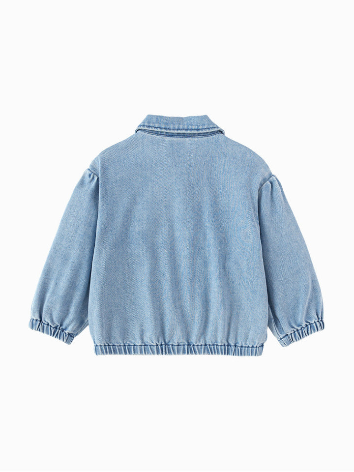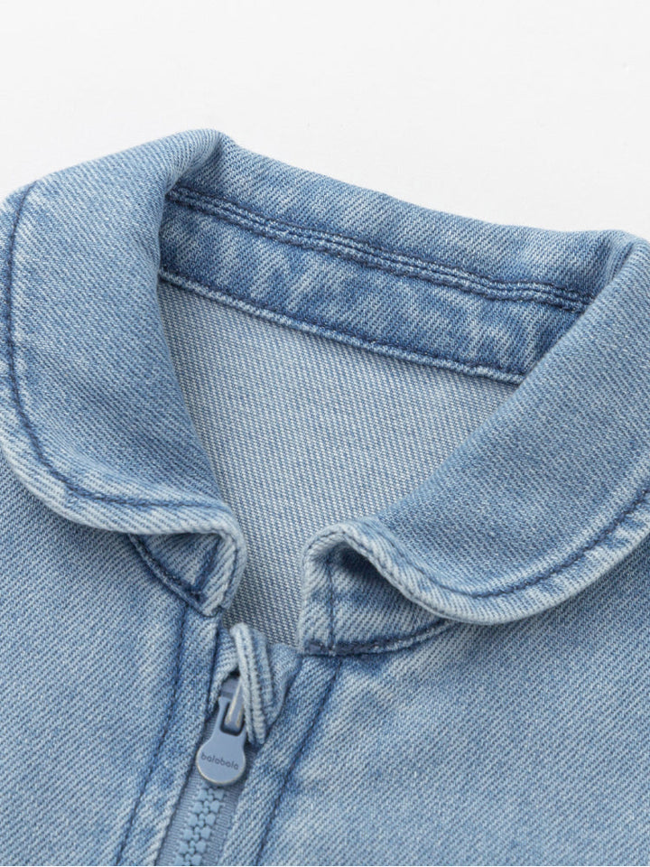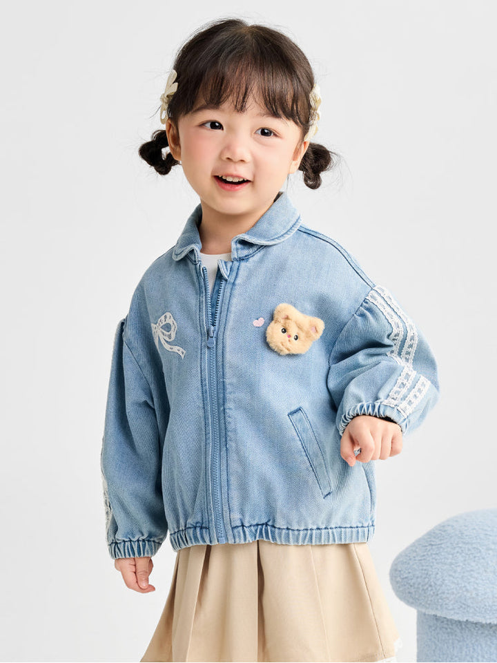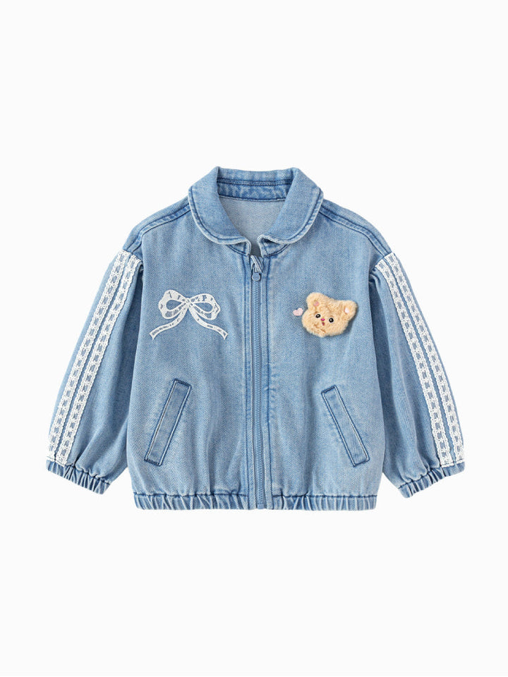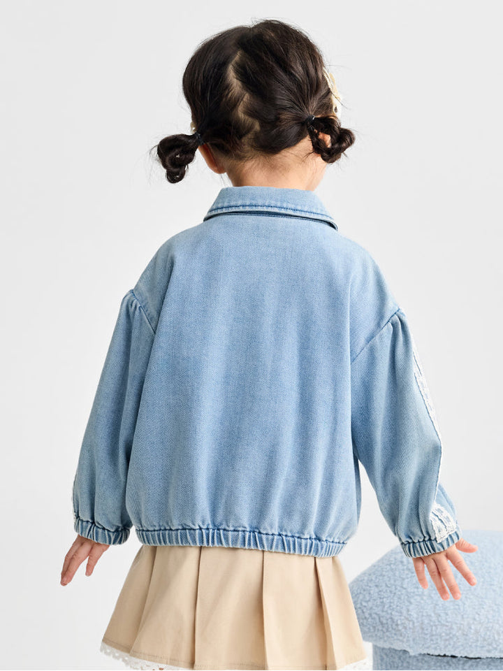 جاكيت جينز بسحّاب أمامي مع أكمام وحافة سفلية مطاطية، يزينه شريط دانتيل على الأكمام وتطريزات جذابة في الأمام.