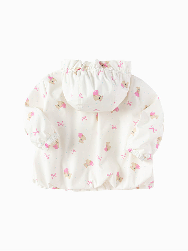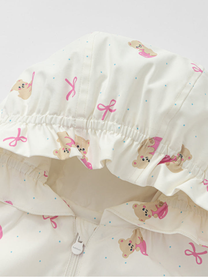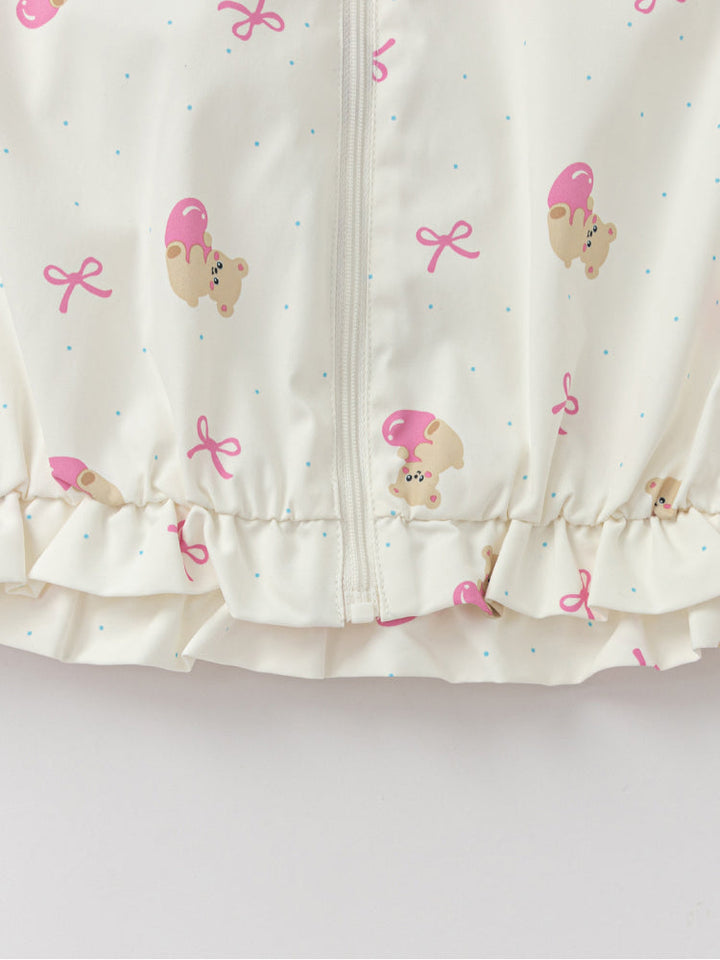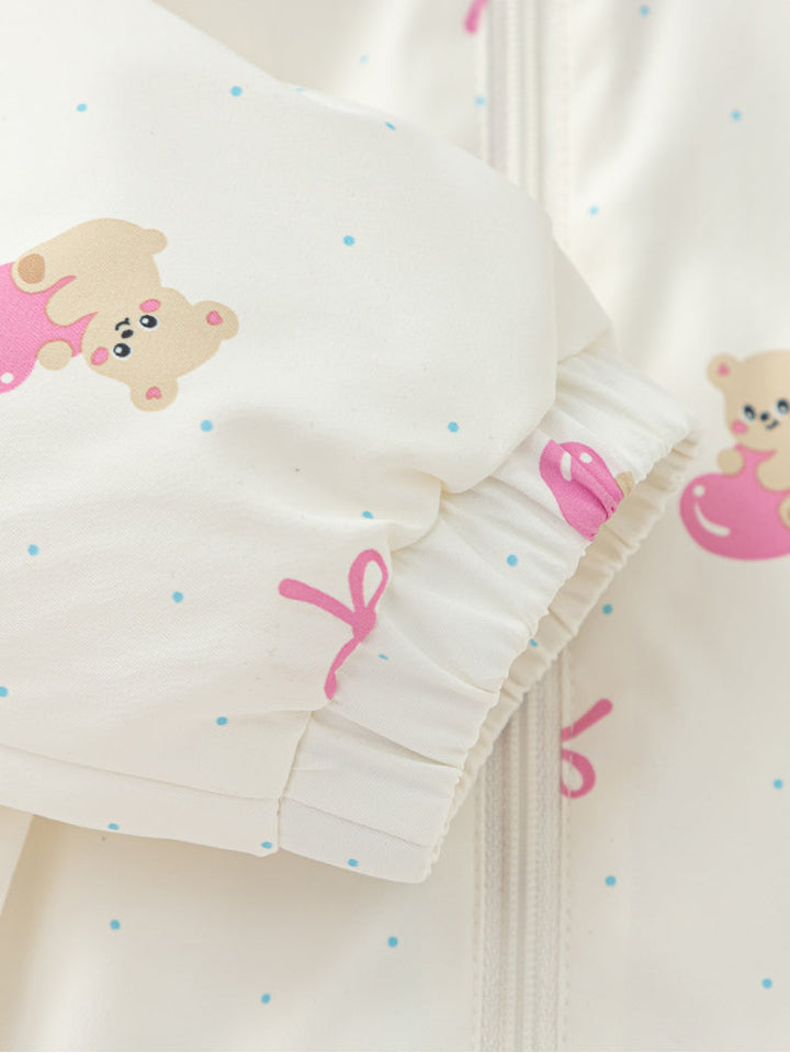 جاكيت خفيف بسحّاب أمامي وهودي، مزين بطبعات مرحة بألوان ناعمة، مع حواف مطاطية لثبات مريح وقصة عملية واسعة.