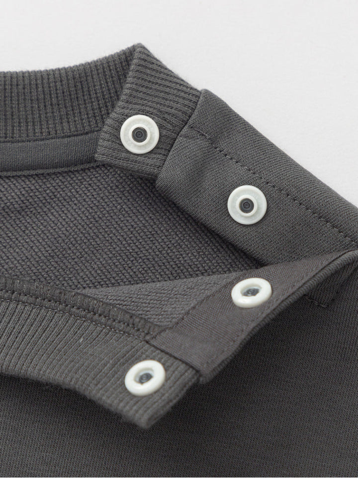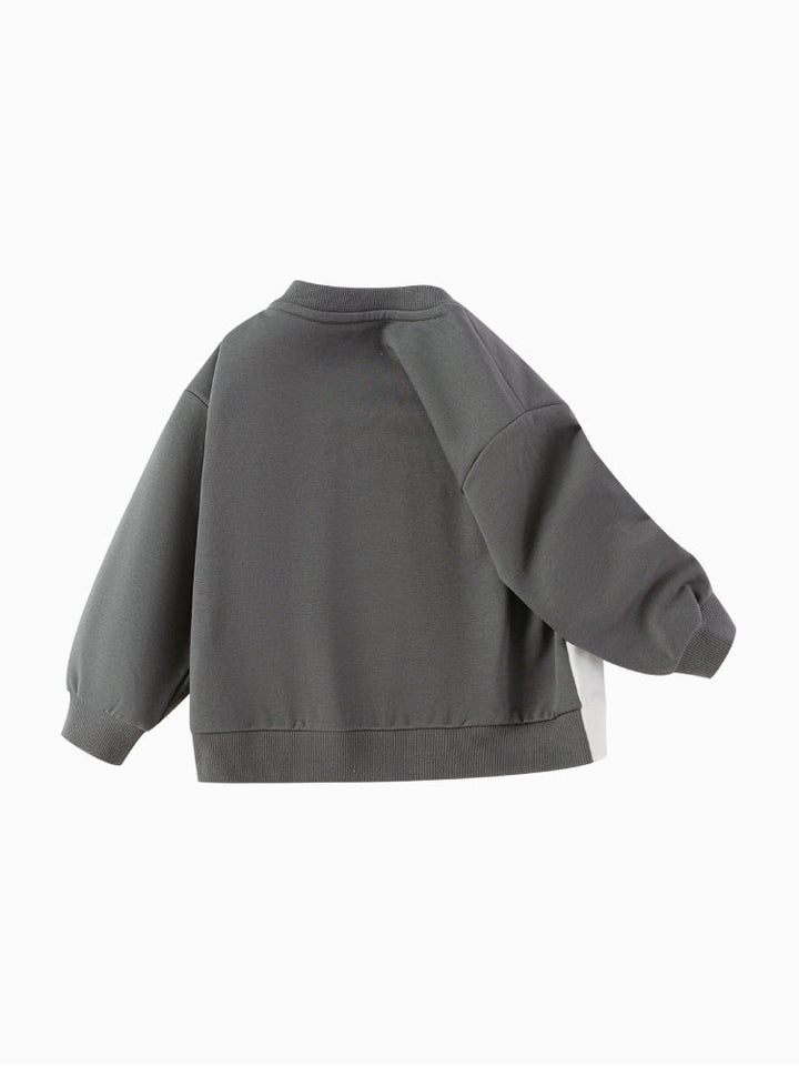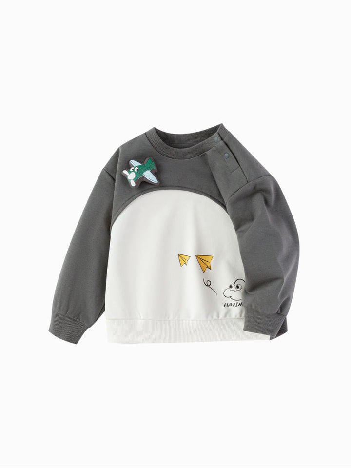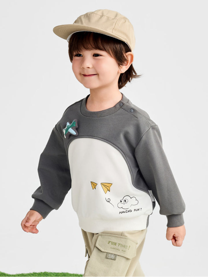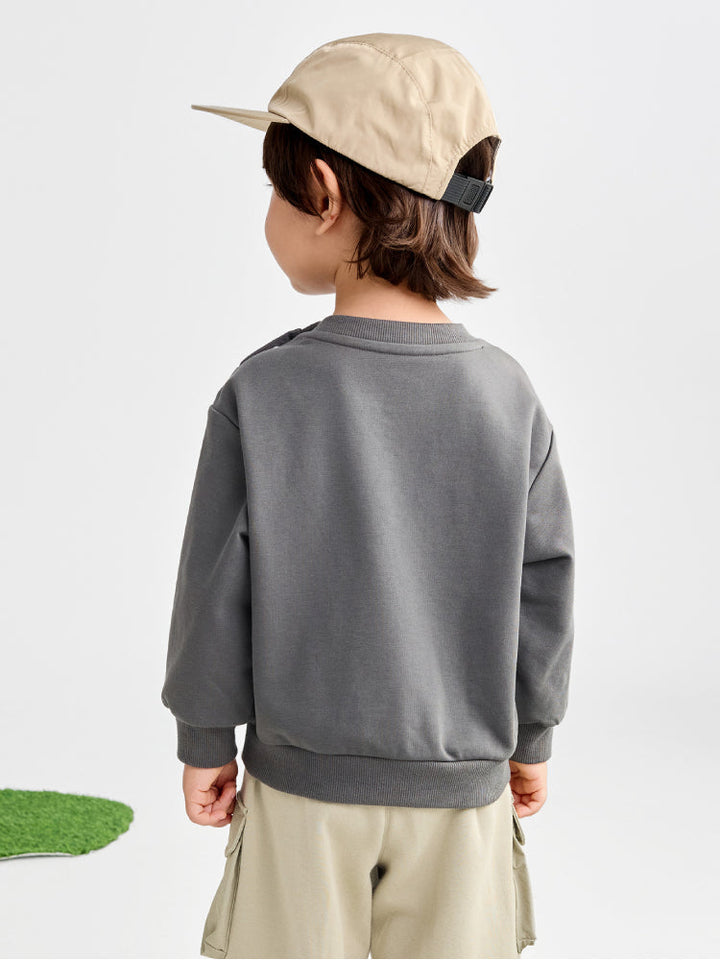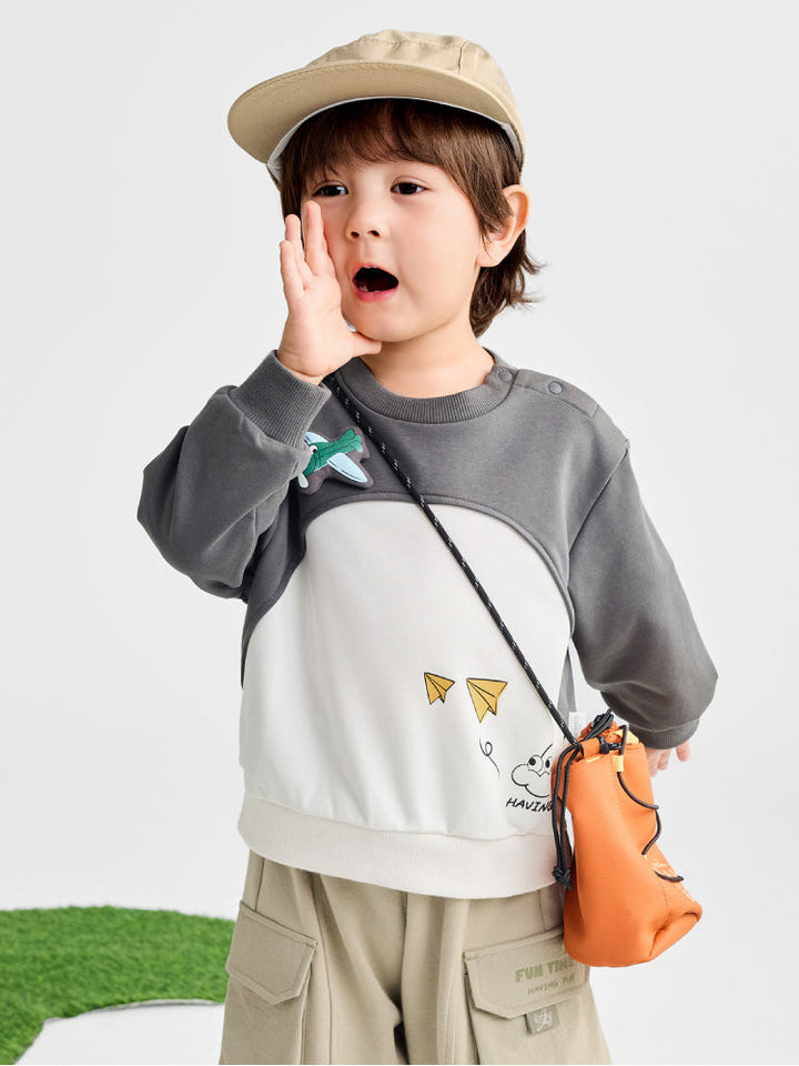 سويت شيرت عملي بأكمام طويلة مع أطراف مضلعة، مزين بطباعة مرحة في الأمام. تصميم مريح مثالي للاستخدام اليومي.
