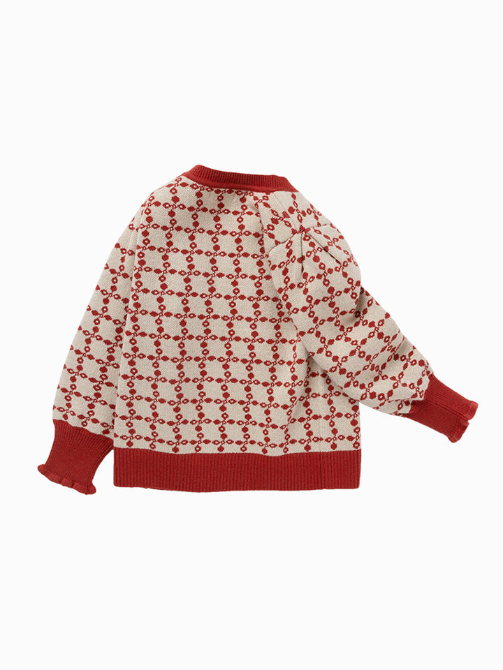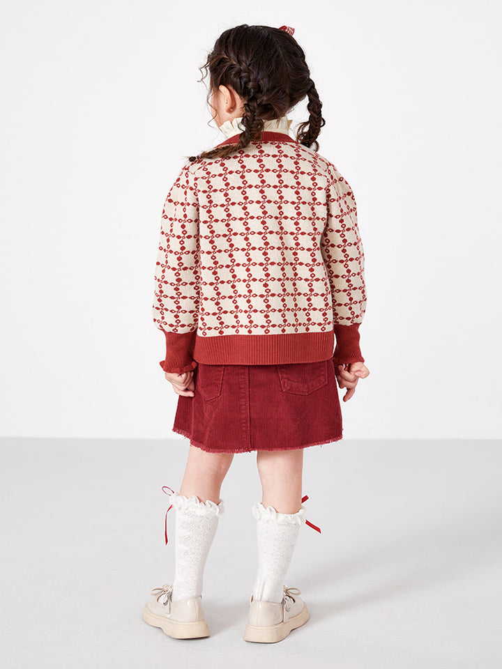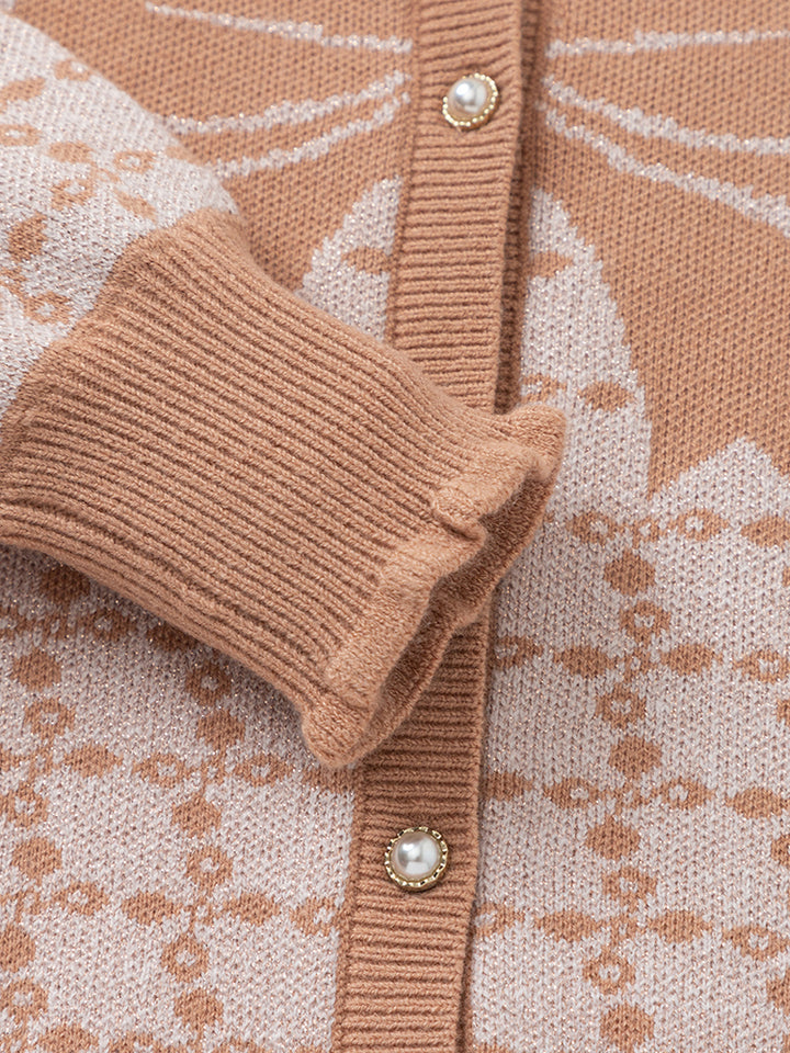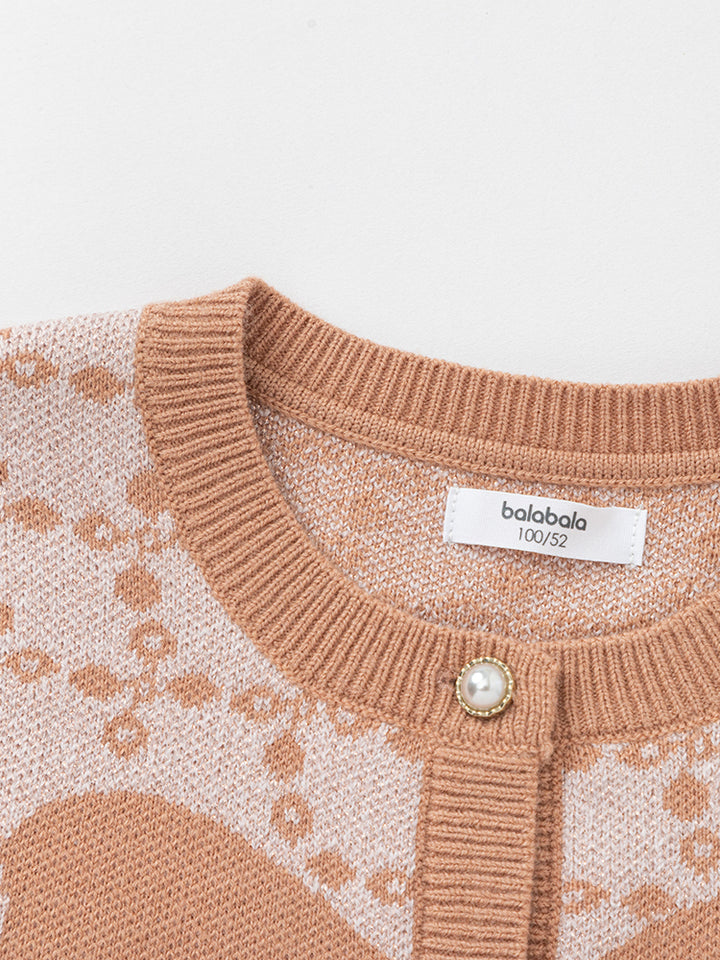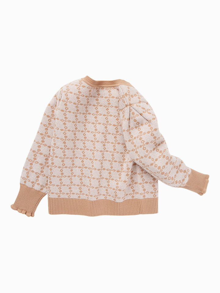 جاكيت كارديغان صوف بناتي بأكمام طويلة، مزين بنمط طبعات على كامل التصميم، يأتي بأزرار للإغلاق من الجهة الأمامية وبياقة مدورة الشكل