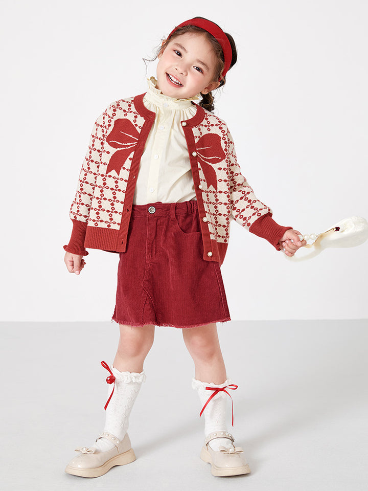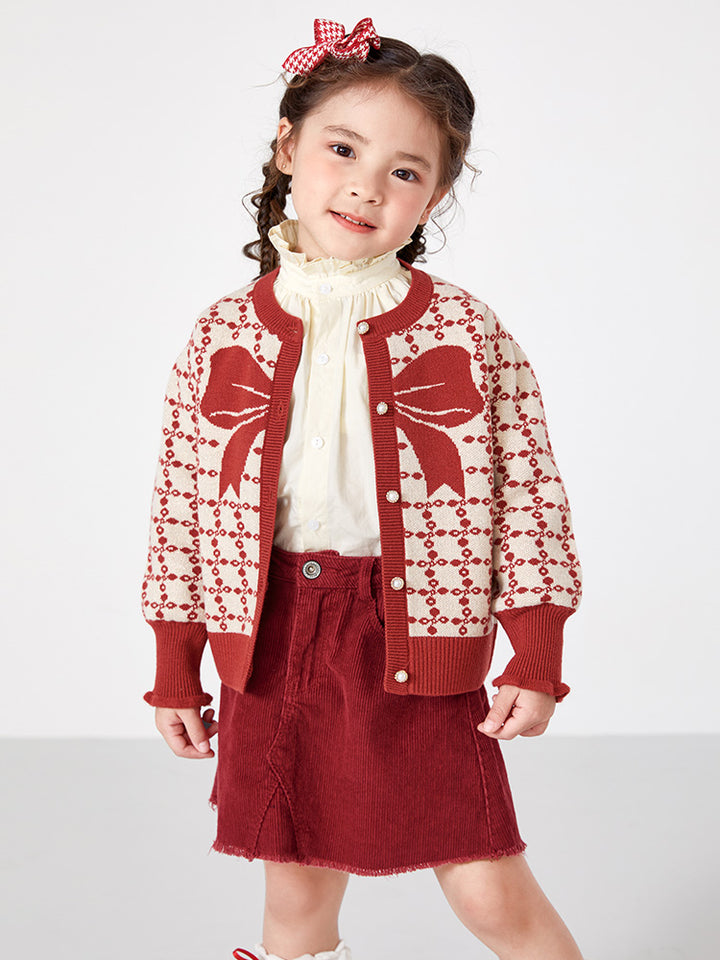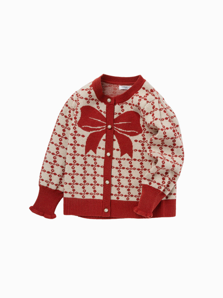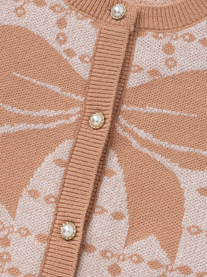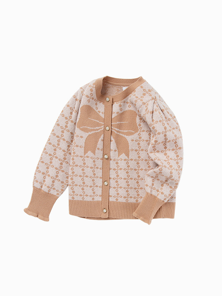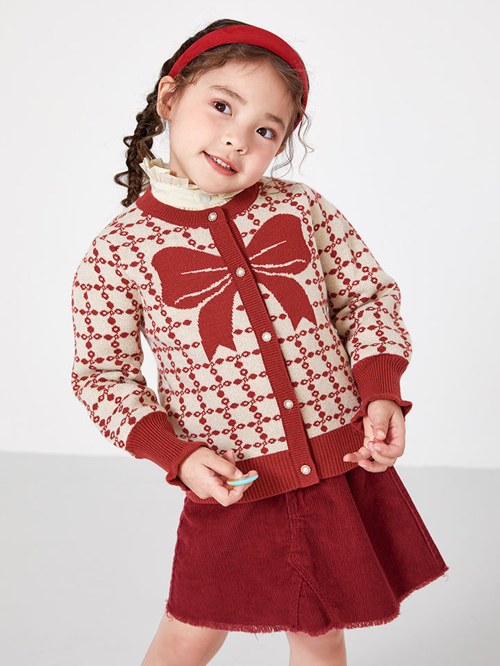 جاكيت كارديغان صوف بناتي بأكمام طويلة، مزين بنمط طبعات على كامل التصميم، يأتي بأزرار للإغلاق من الجهة الأمامية وبياقة مدورة الشكل