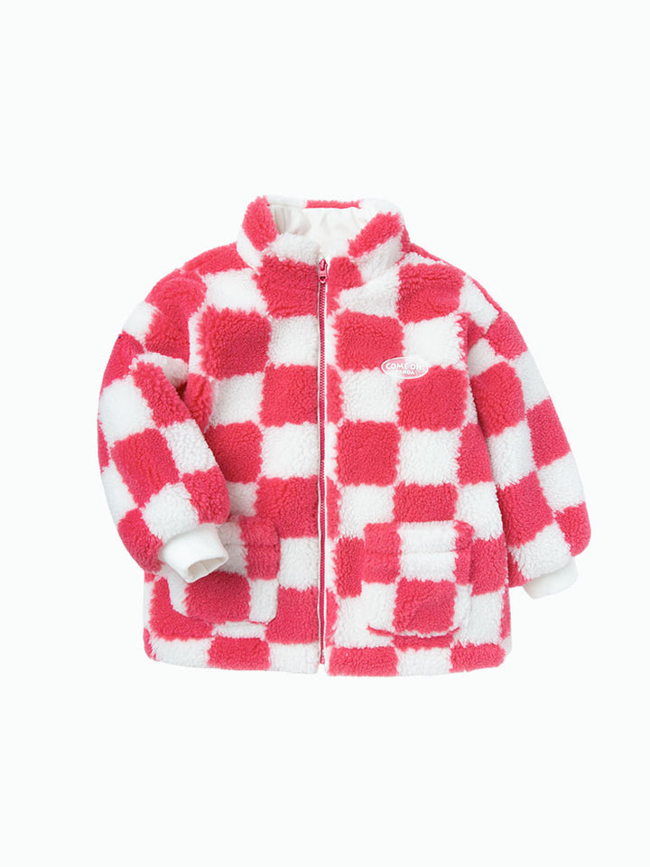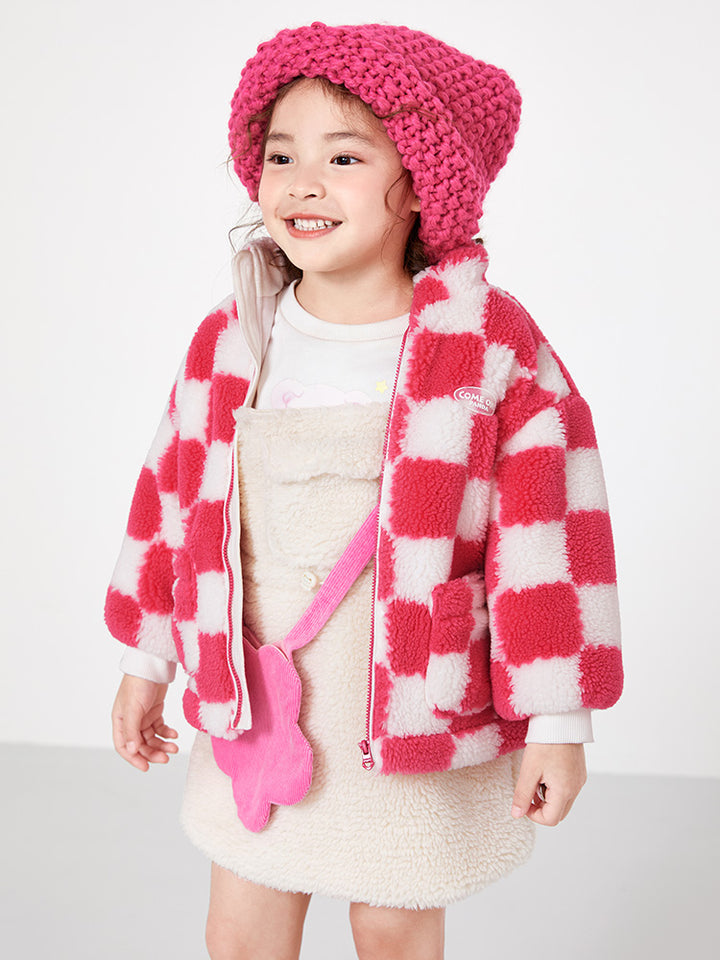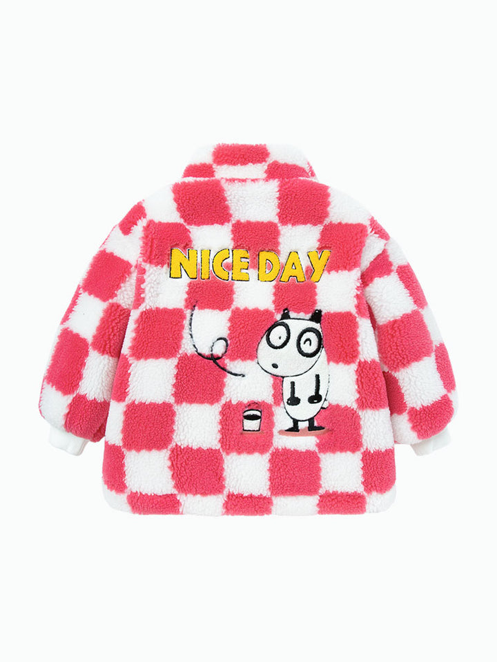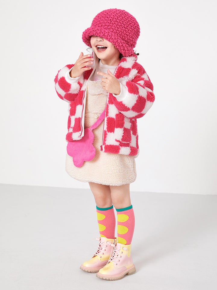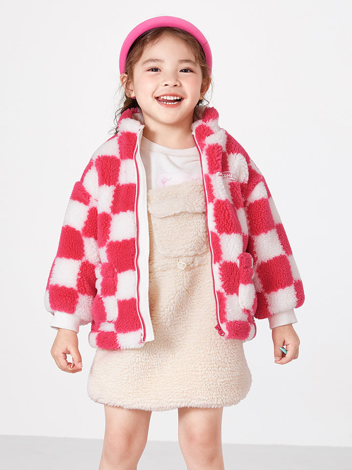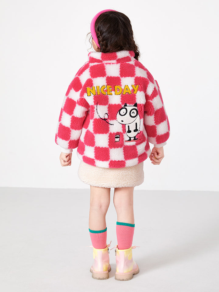 جاكيت بناتي بأكمام طويلة وبخامة صوف شيربا ناعمة، مزين بنمط طبعات على كامل التصميم وطبعة تطريز من الجهة الخلفية، يأتي بجيوب من الجهة الأمامية، سحاب للإغلاق من الجهة الأمامية وبياقة مرتفعة