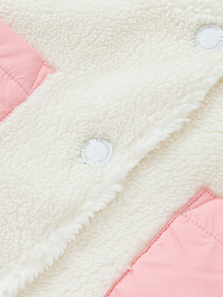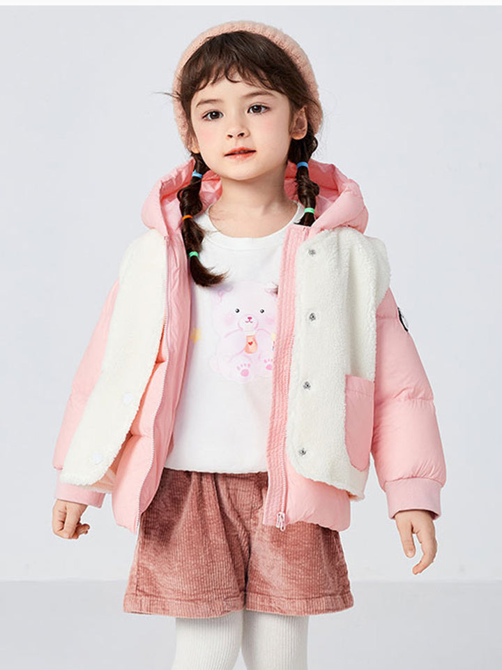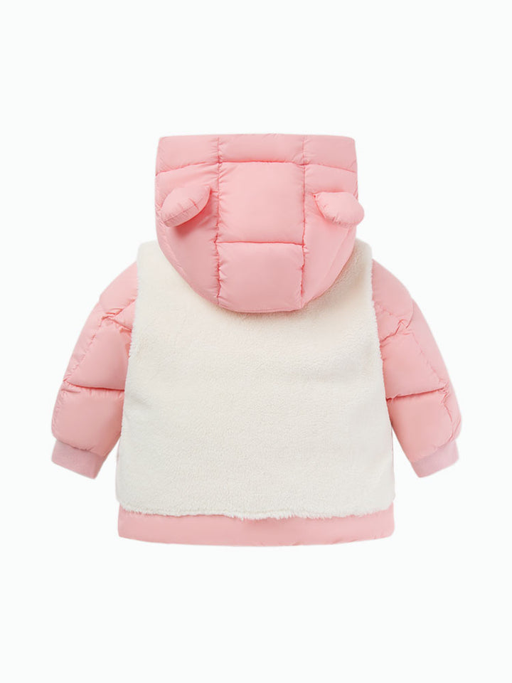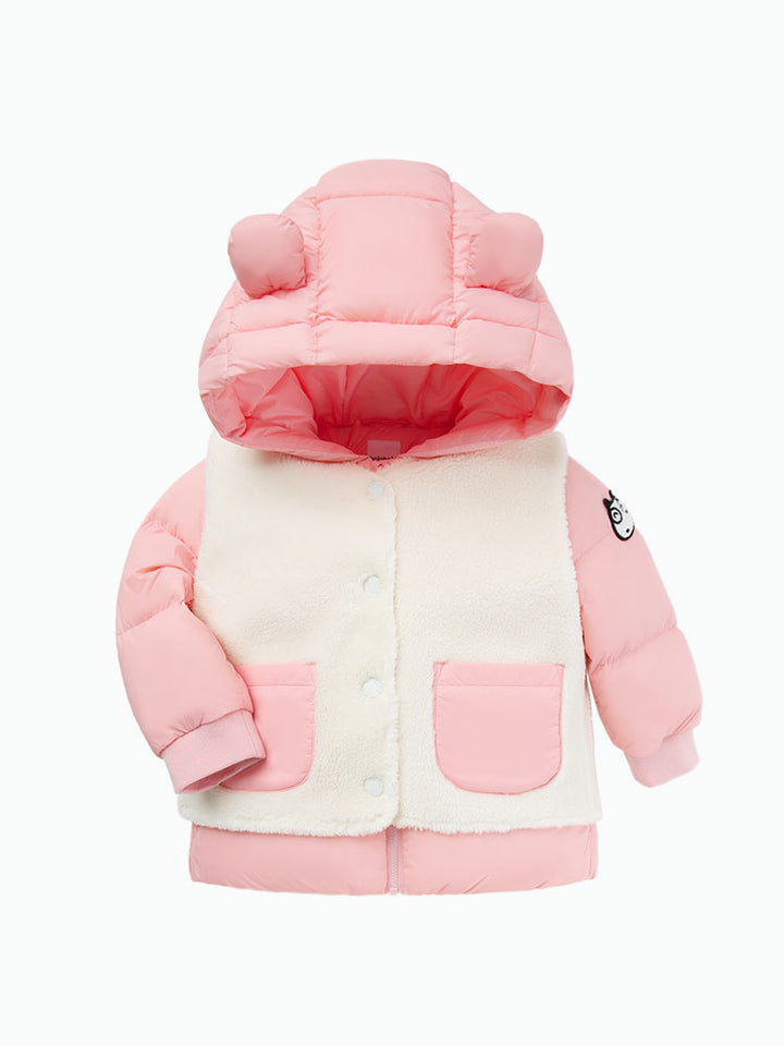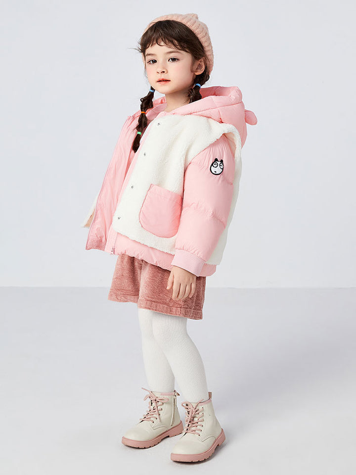 جاكيت بناتي كاجوال بأكمام طويلة، بستايل متباين اللون والخامة، مزين برقعة على أحد الأكمام، يأتي بجيوب أمامية، أزرار كبس وسحاب للإغلاق من الجهة الأمامية وبياقة هودي متصلة