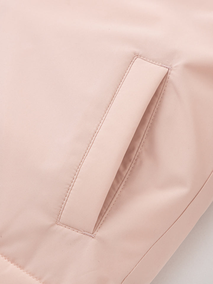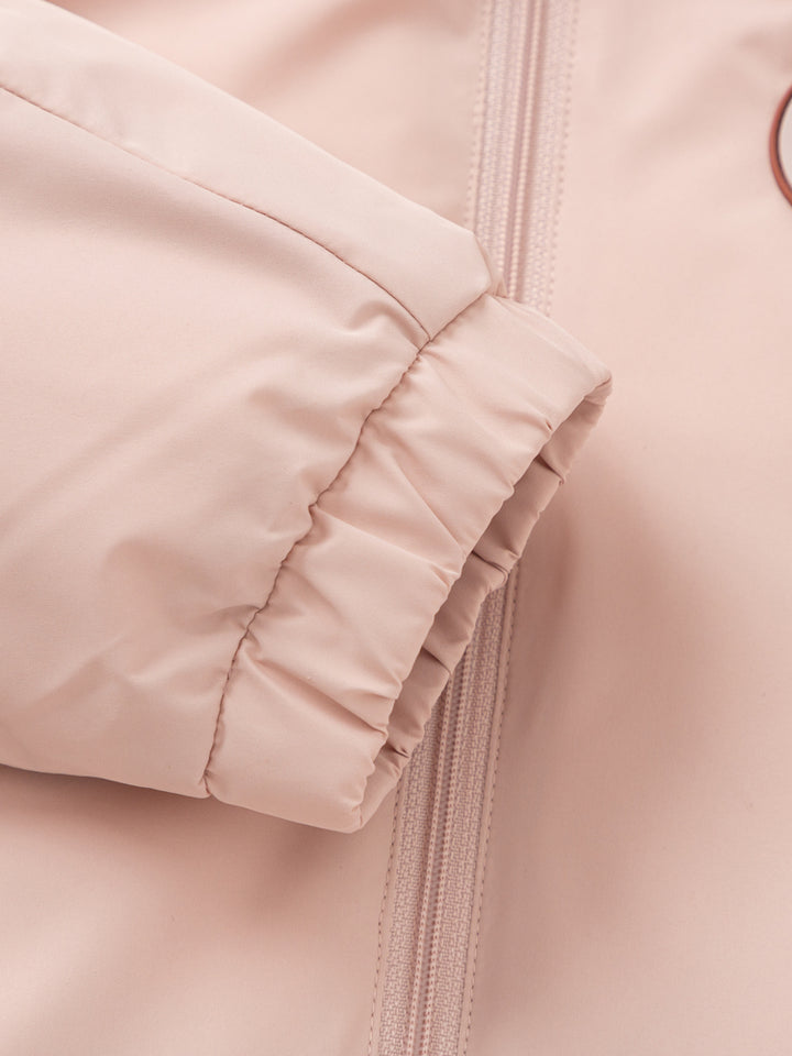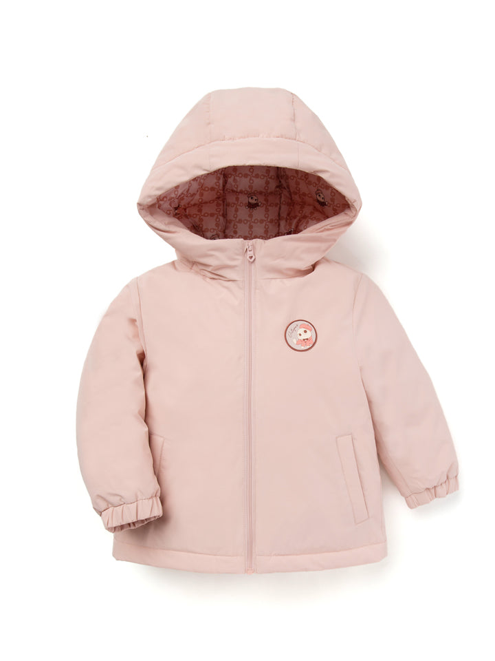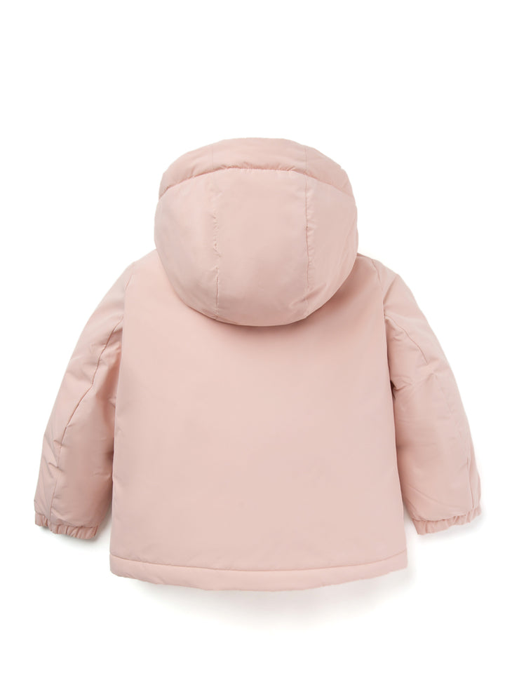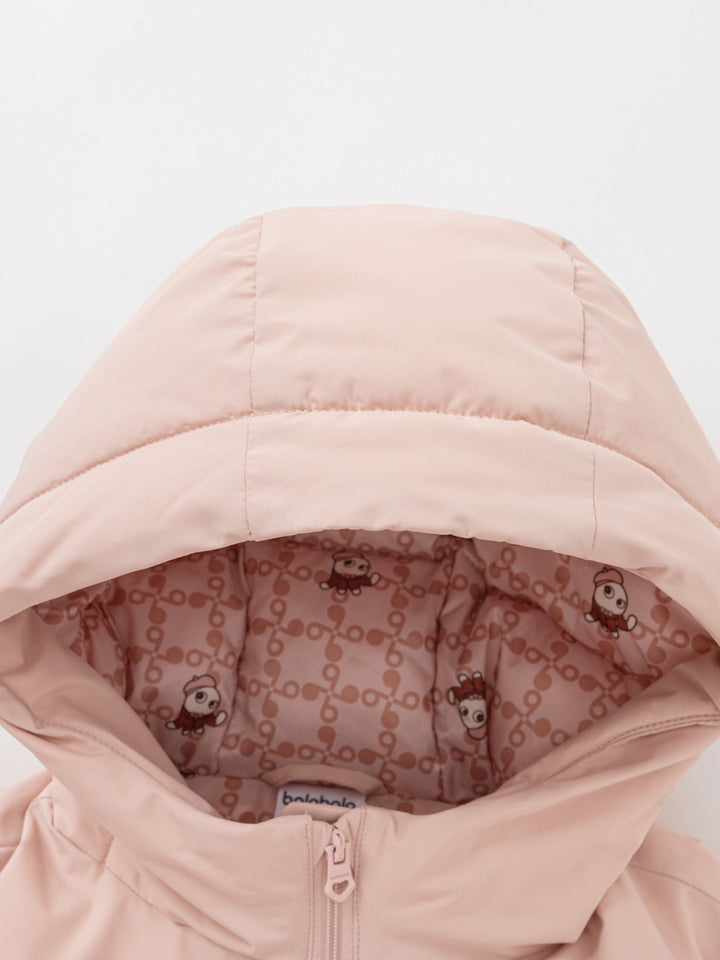 جاكيت بافر بناتي منفوخ بأكمام طويلة، خامة دافئة للشتاء، مزين برقعة صغيرة من الجهة الأمامية، يأتي بجيوب من الجهة الأمامية، سحاب للإغلاق من الجهة الأمامية وبياقة هودي متصلة