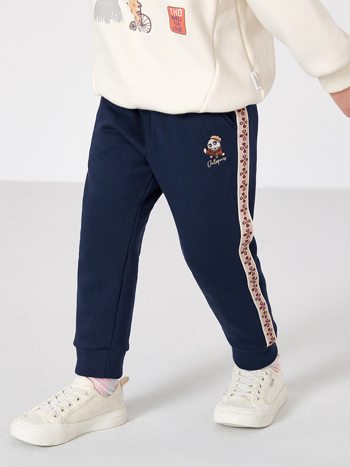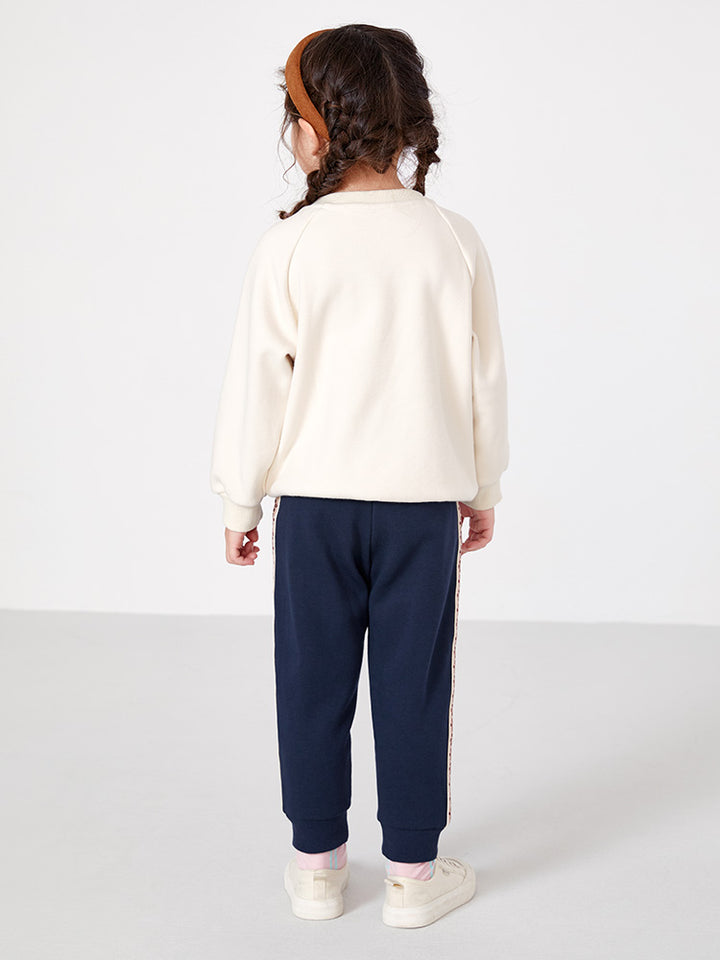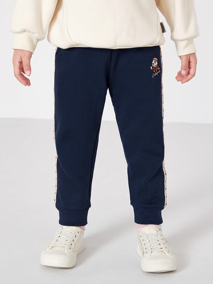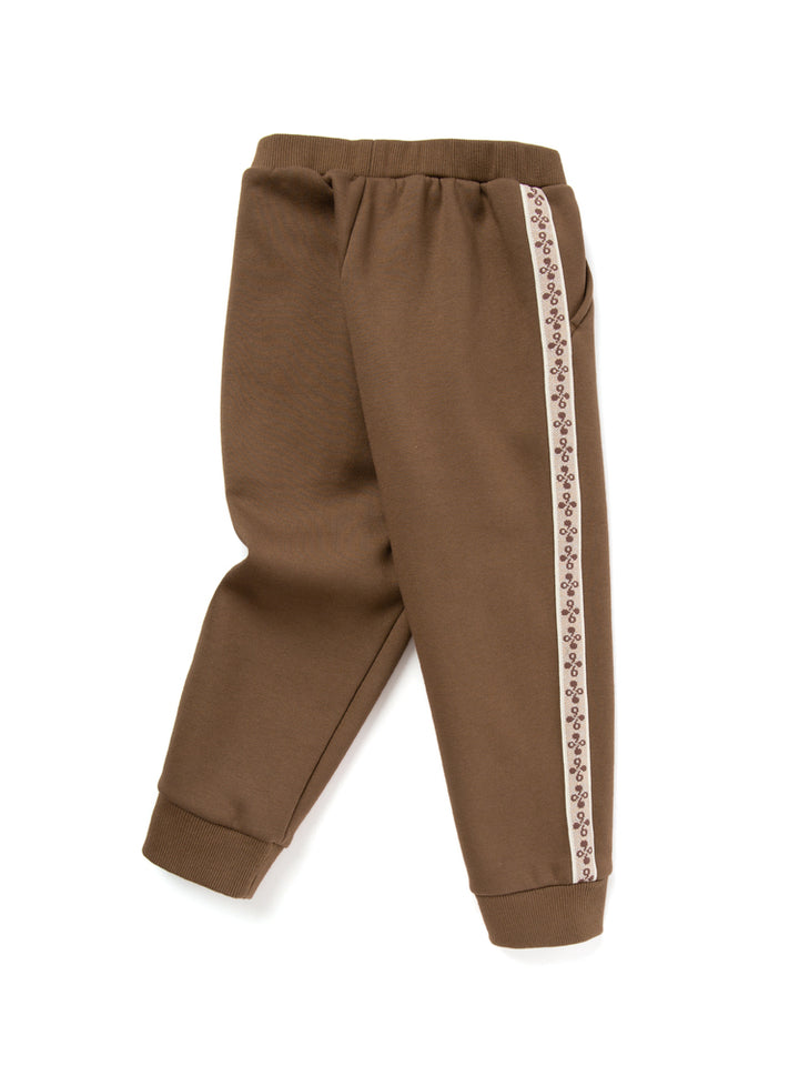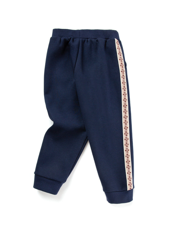 بنطلون رياضي بناتي، مزين بتفاصيل خطوط على جانب الساقين وتطريز صغيرة من الجهة الأمامية، يأتي بجيوب من الجهة الأمامية وبخصر مطاطي مريح