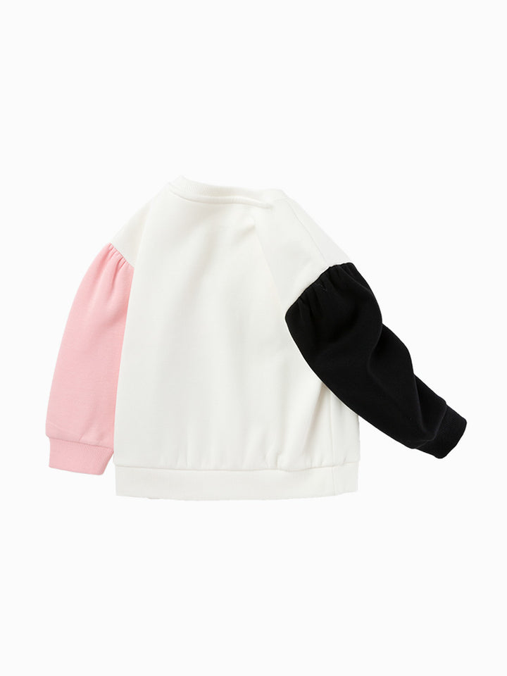 بلوزة سويت شيرت بناتي كاجوال بأكمام طويلة، مزينة بطبع من الجهة الأمامية وبأكمام متباينة اللون، تأتي بياقة مدورة الشكل