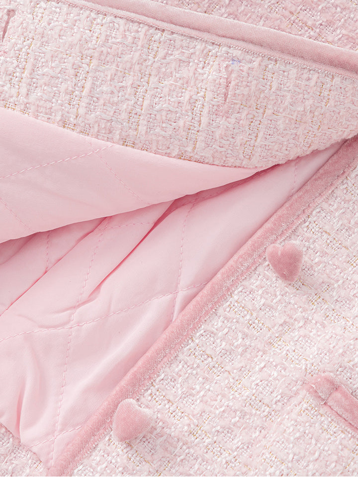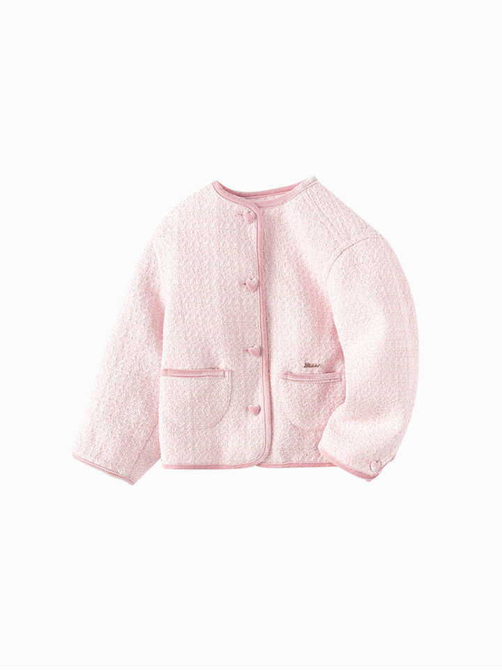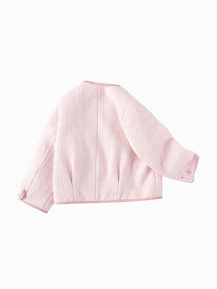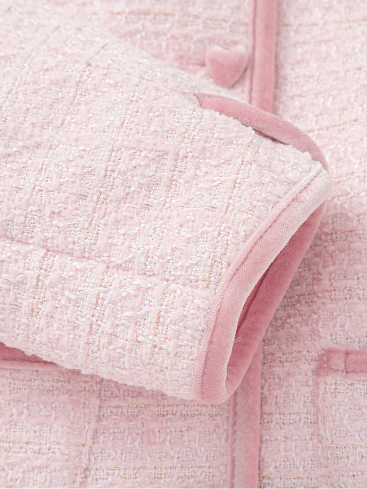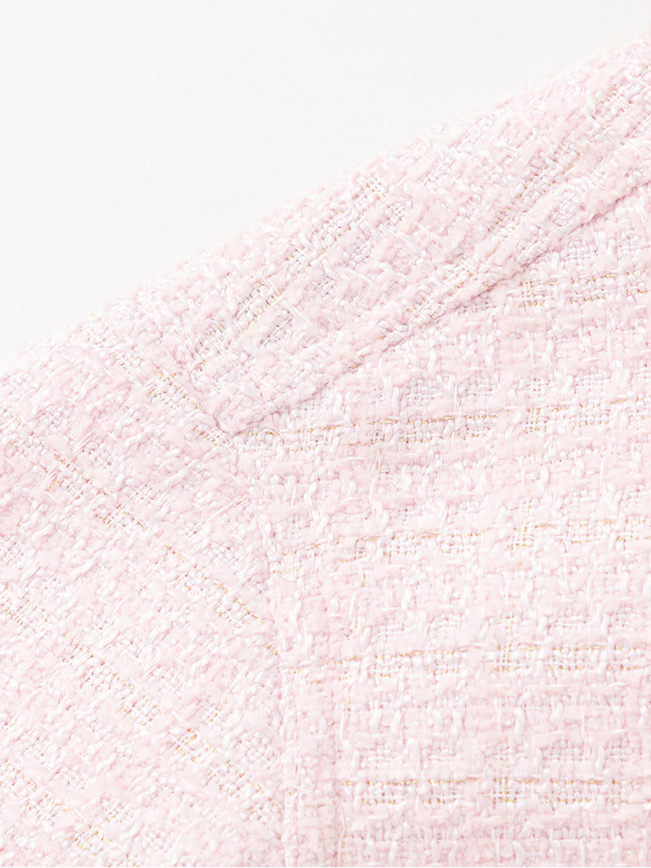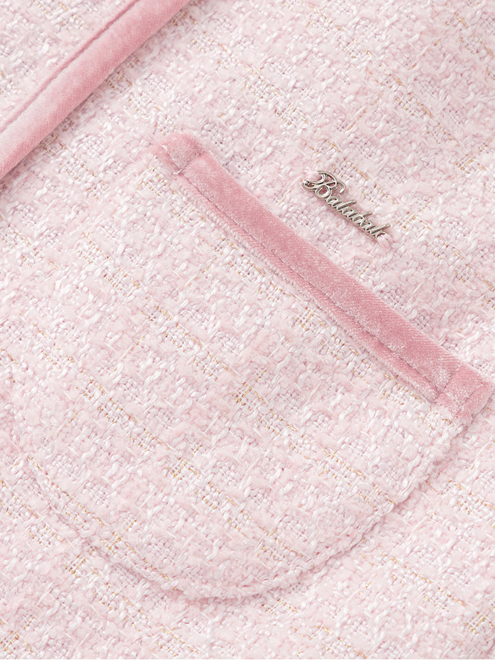 جاكيت بأكمام طويلة وبخامة نسيج تويد، يأتي بجيوب أمامية، أزرار أمامية للإغلاق وبياقة مدورة الشكل