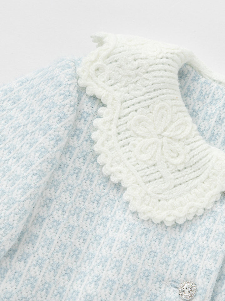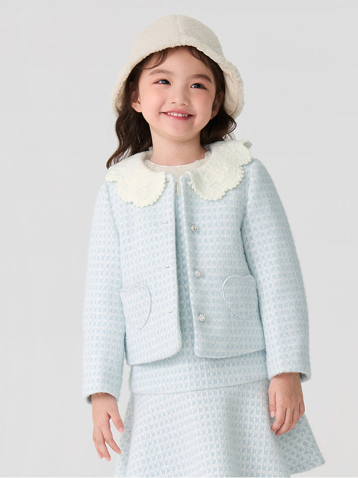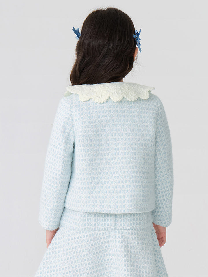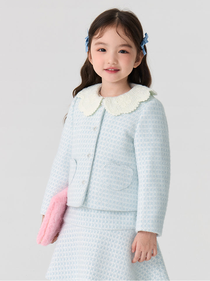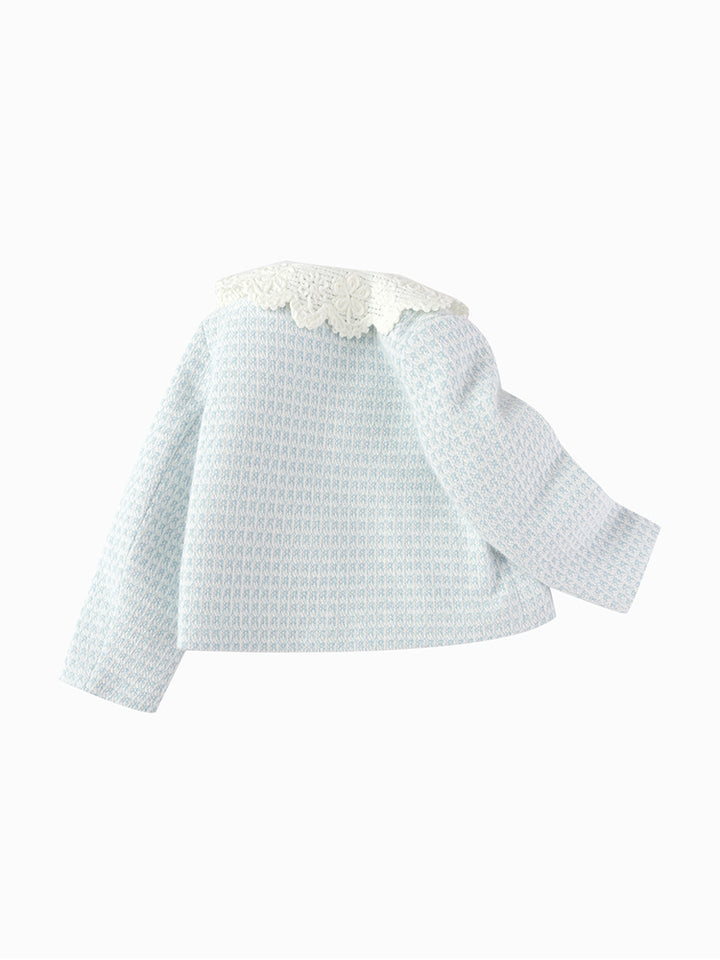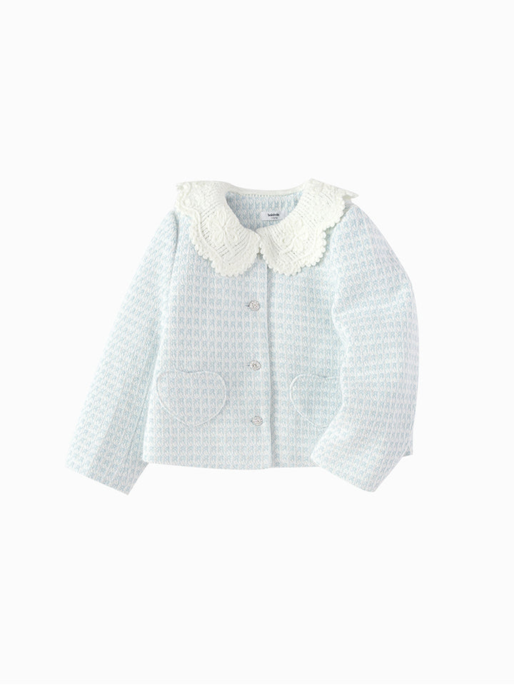 جاكيت بأكمام طويلة وبخامة نسيج تويد، يأتي بجيوب أمامية، أزرار أمامية للإغلاق وبياقة مطوية متباينة اللون بنسيج محبوك