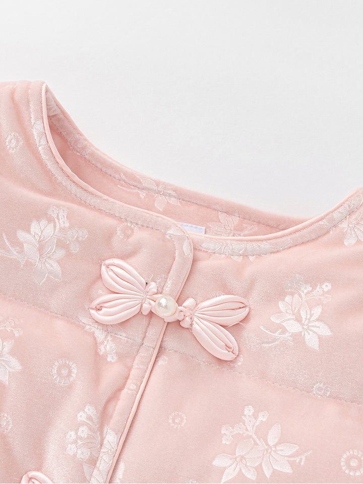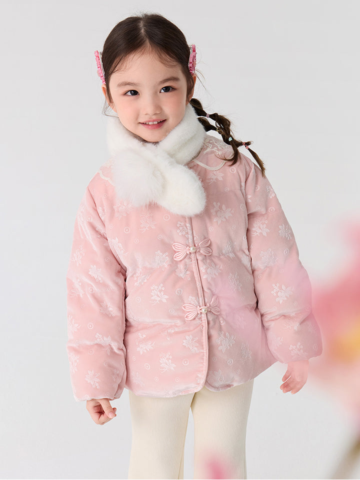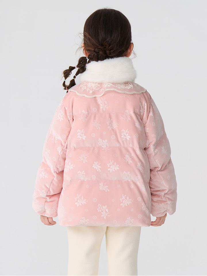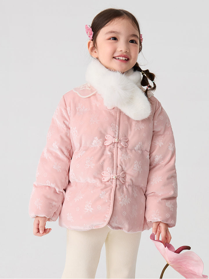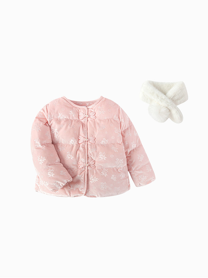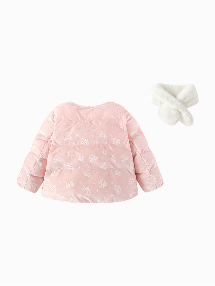 معطف شتوي بأكمام طويلة، مزين بنمط طبعات على كامل التصميم، يأتي أزرار للإغلاق، جيوب أمامية وياقة مدورة الشكل مع وشاح فرو للرقبة