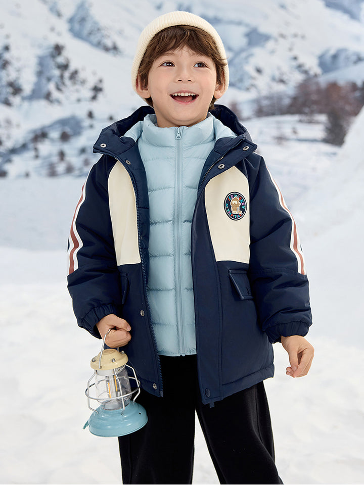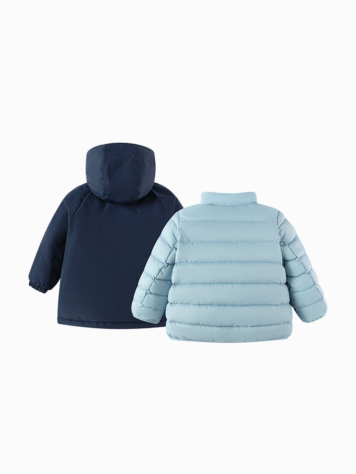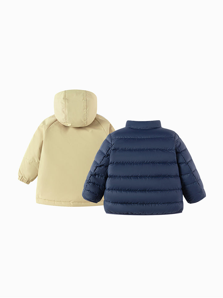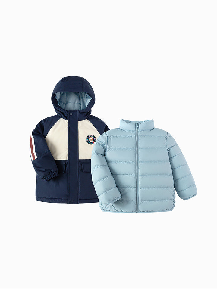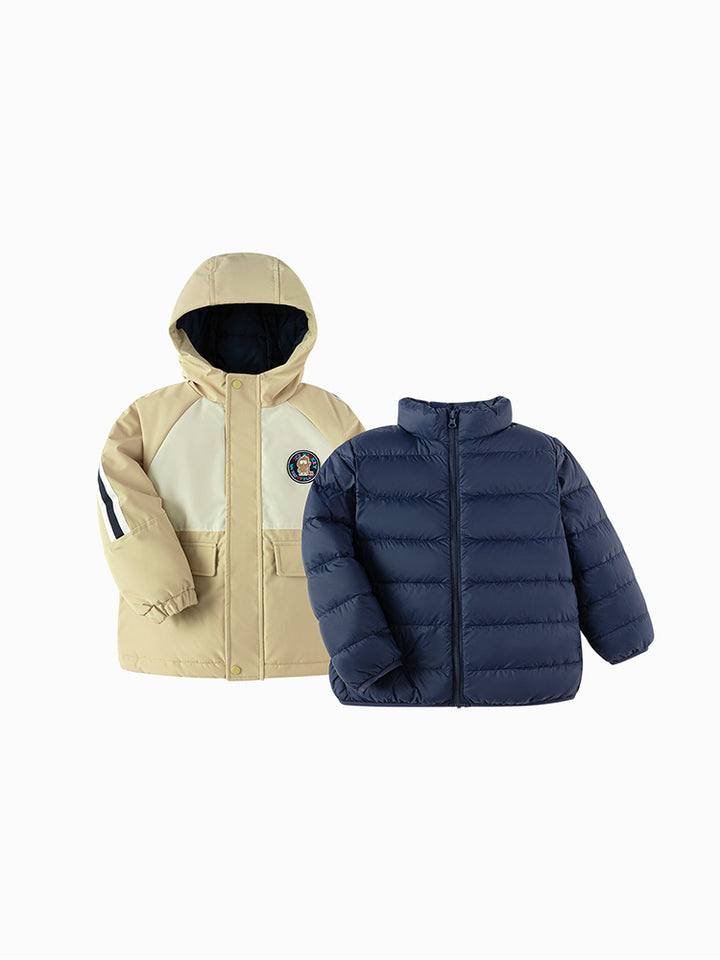 طقم جاكيت شتوي مكون من قطعتين، جاكيت داخلي بأكمام طويلة وخامة مبطنة بلون موحد، يأتي بسحاب للإغلاق من الجهة الأمامية وبياقة مرتفعة، وجاكيت شتوي خارجي بأكمام طويلة بستايل ذو تفاصيل ثنائية اللون، يأتي بسحاب أمامي للإغلاق، جيوب من الجهة الأمامية وبياقة هودي متصلة