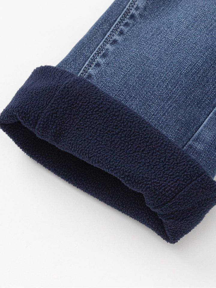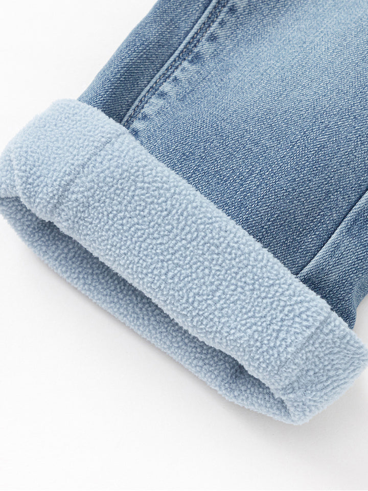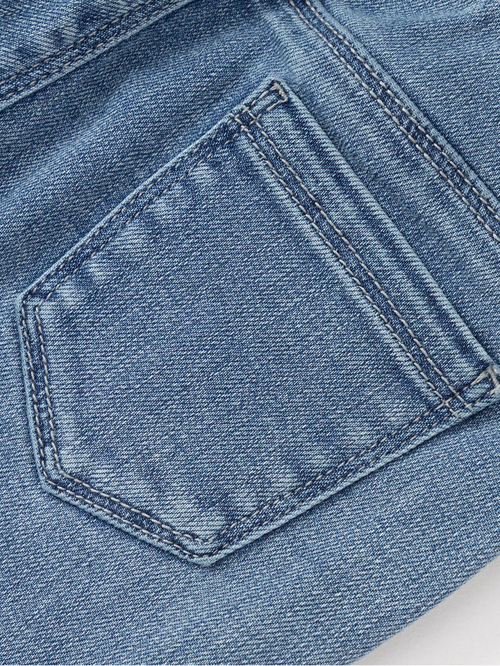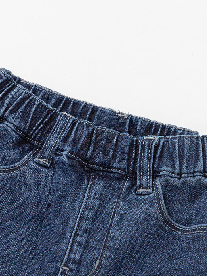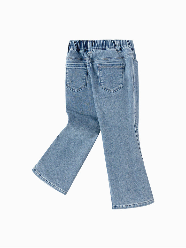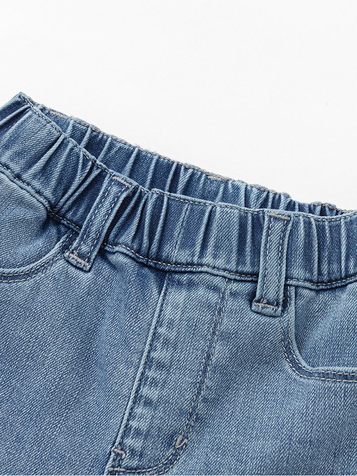 بنطلون جينز بنمط ذو مسحات باهتة، مزين بتفاصيل حجارة مرصعة أسفل الساقين، يأتي بجيوب أمامي وخلفية وبخصر مطاطي مريح