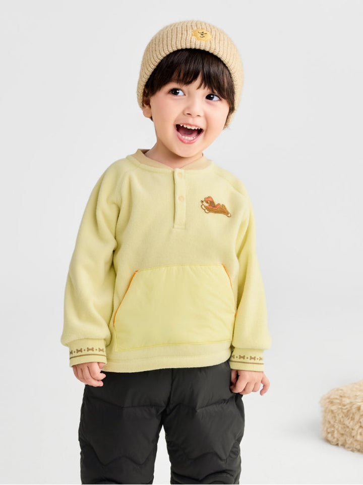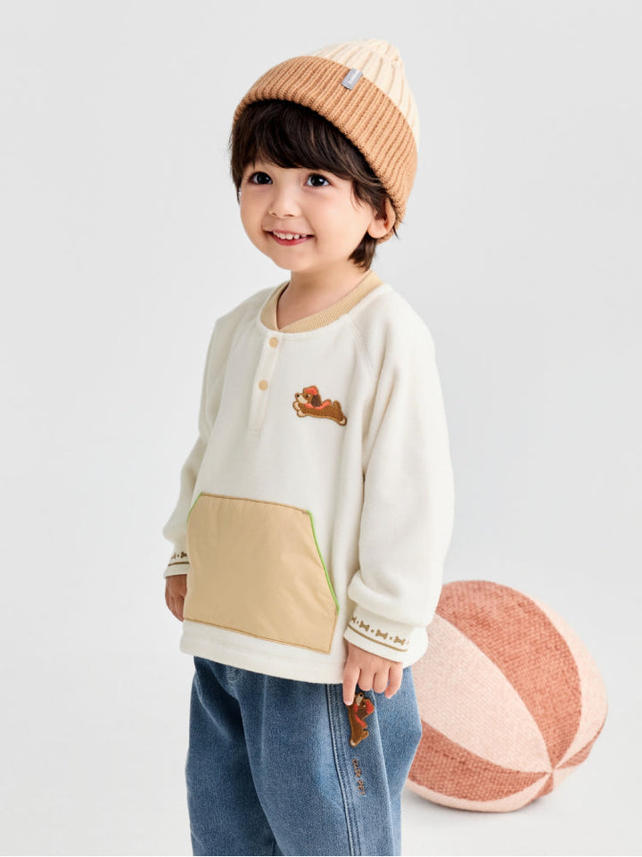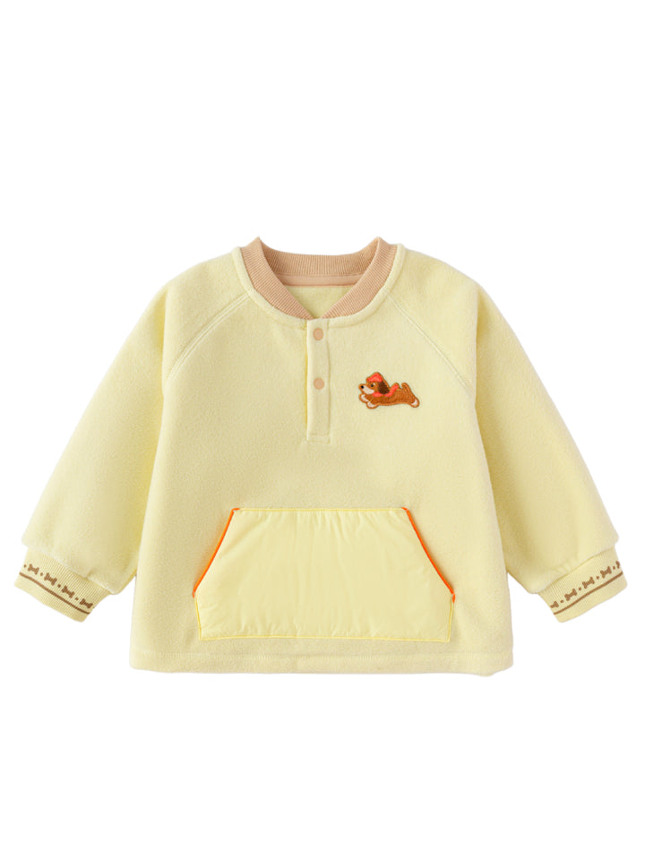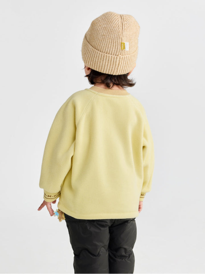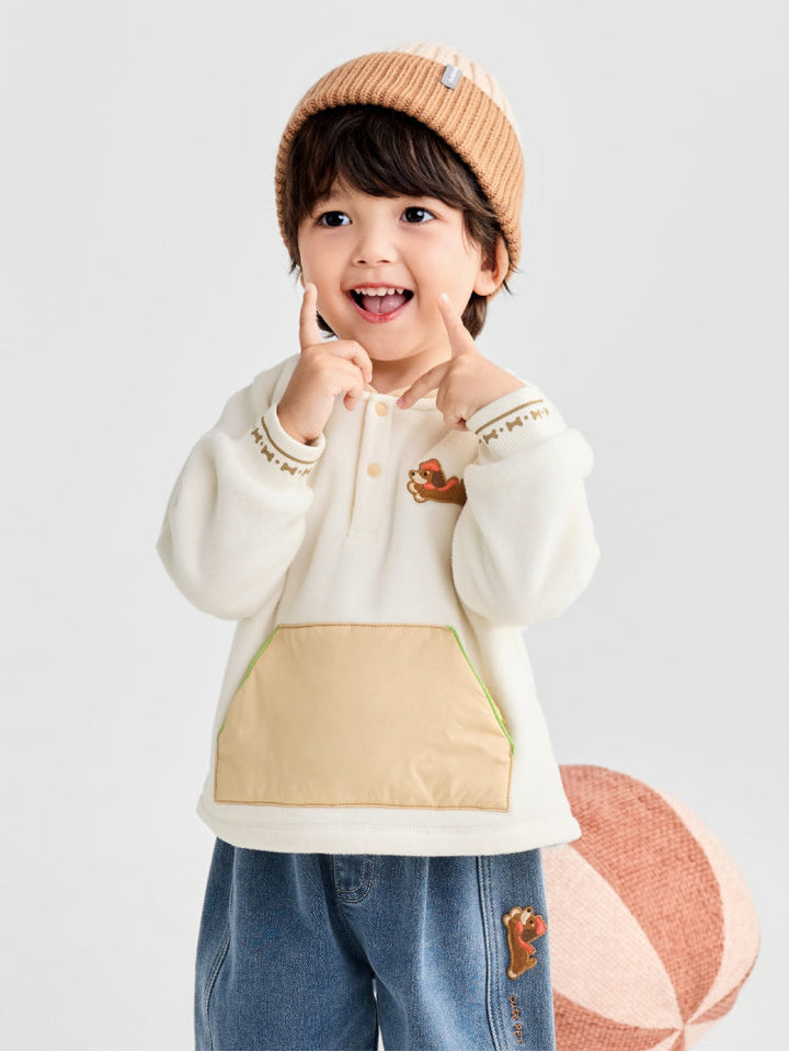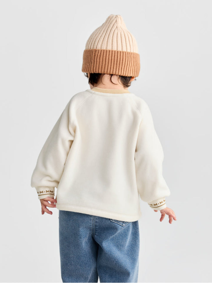 سويت شيرت دافئ للأطفال مصنوع من قماش فليس ناعم، بتصميم بأكمام طويلة وياقة بأزرار صغيرة. يتميز بجيب أمامي واسع مع تفاصيل زخرفية على الكم تمنحه لمسة مرحة. مثالي لإطلالة مريحة ودافئة في الأيام الباردة.