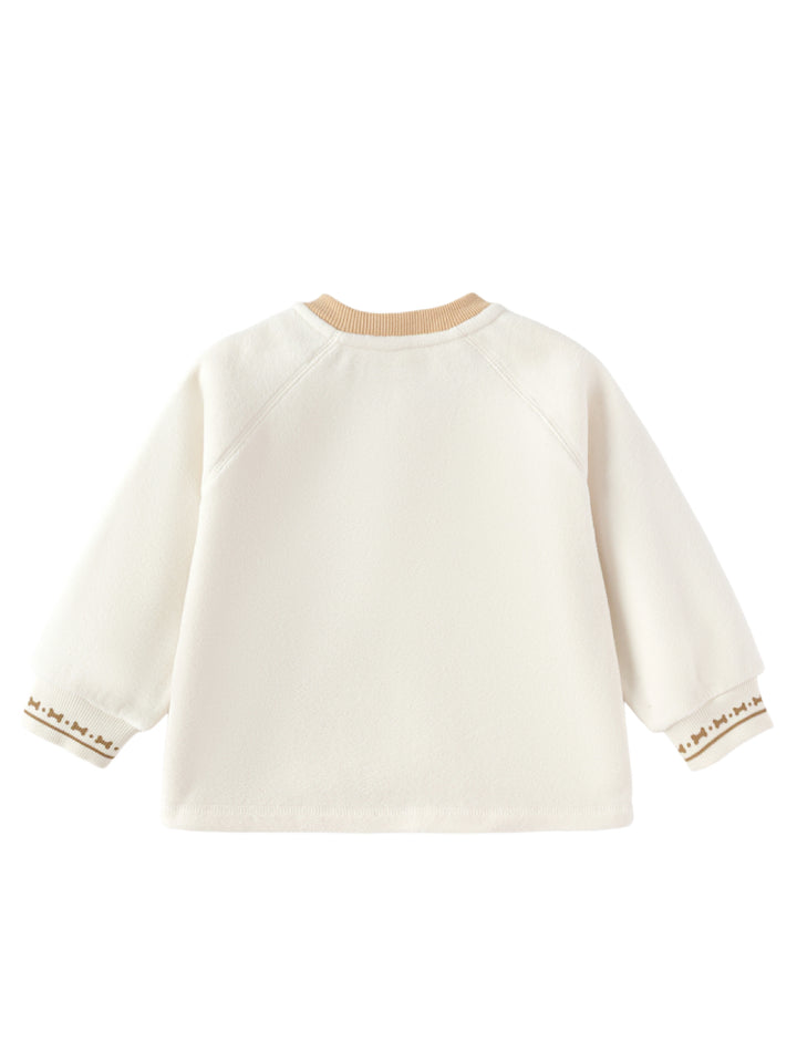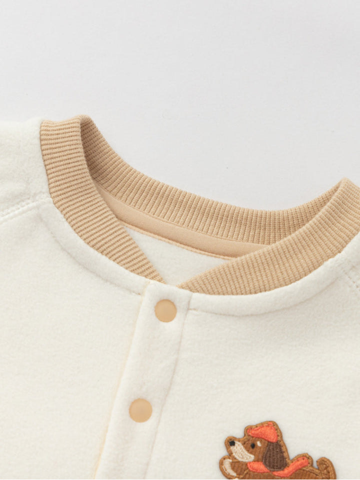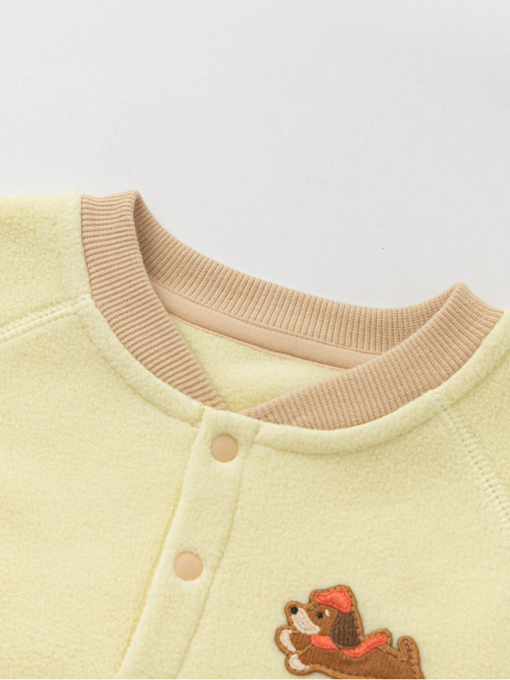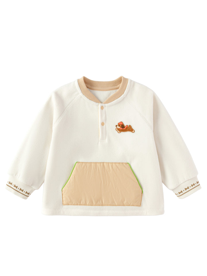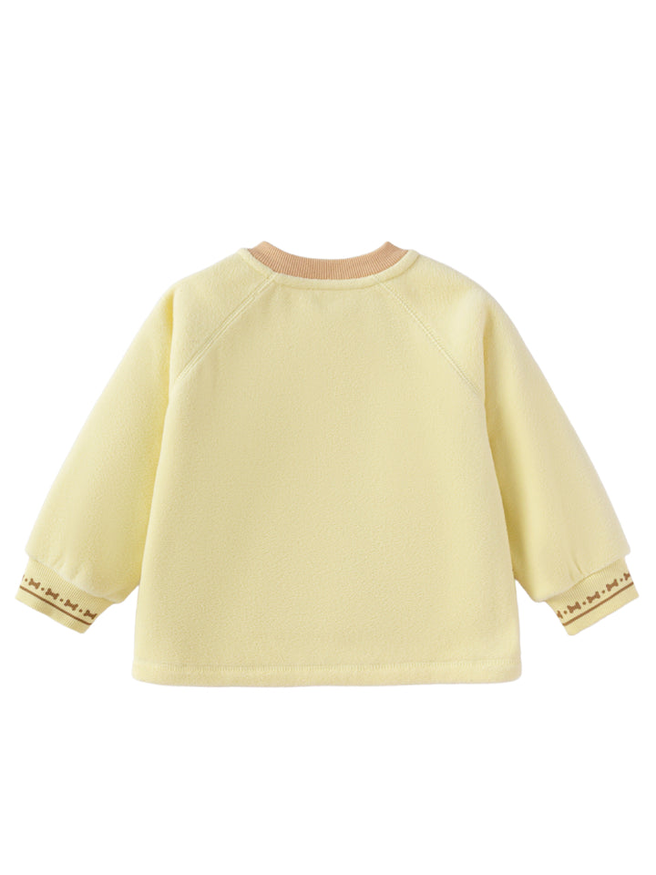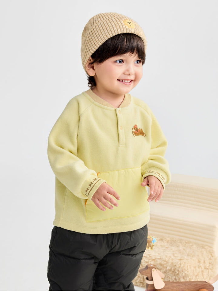 سويت شيرت دافئ للأطفال مصنوع من قماش فليس ناعم، بتصميم بأكمام طويلة وياقة بأزرار صغيرة. يتميز بجيب أمامي واسع مع تفاصيل زخرفية على الكم تمنحه لمسة مرحة. مثالي لإطلالة مريحة ودافئة في الأيام الباردة.