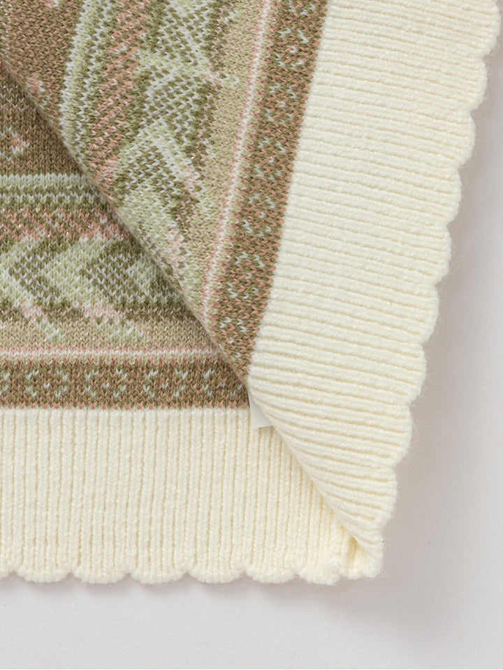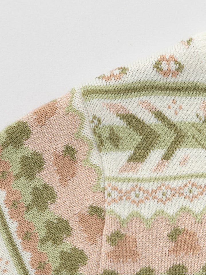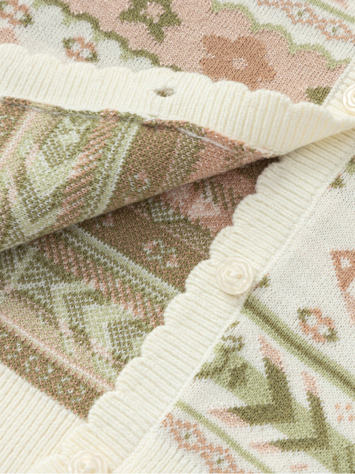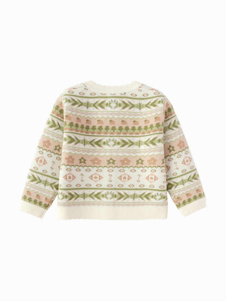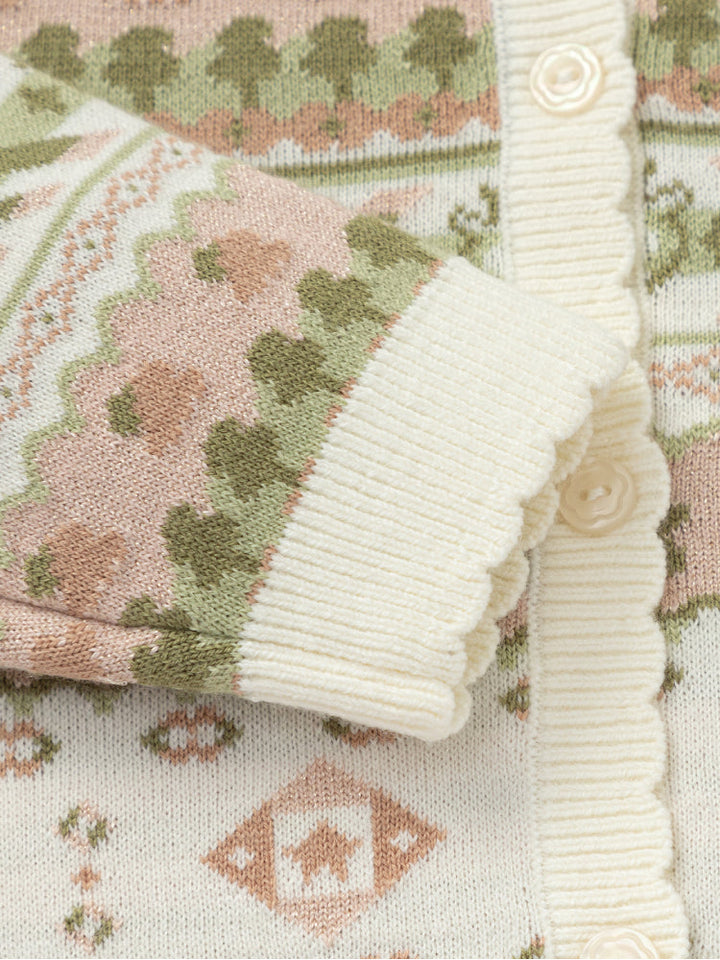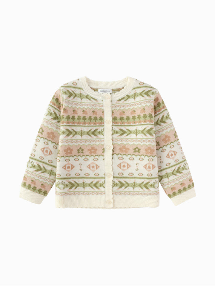 كارديغان ناعم للأطفال بتصميم محبوك وأكمام طويلة مع إغلاق أمامي بأزرار. يزدان بنقشات زخرفية بألوان هادئة تمنحه لمسة مميزة، مثالي للارتداء فوق الملابس في الأجواء الباردة.