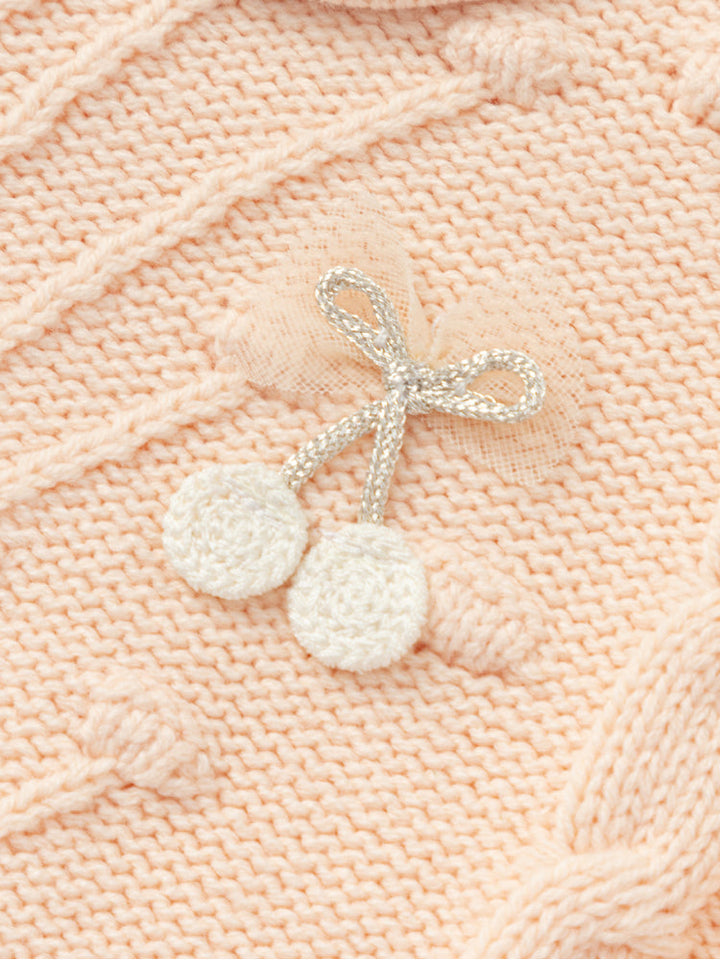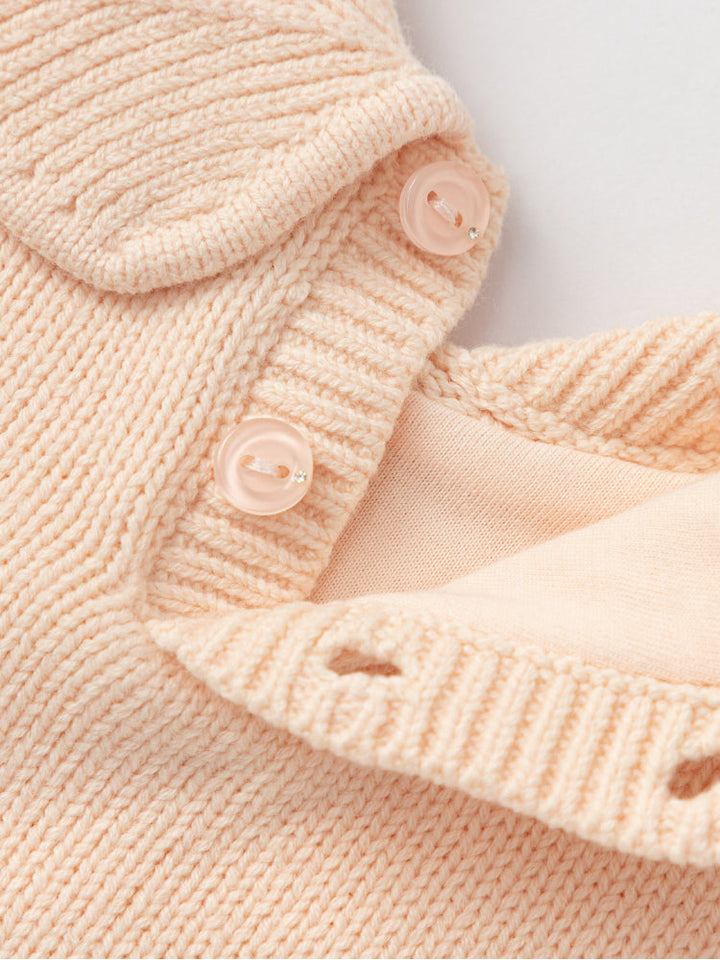 كنزة محبوكة أنيقة للأطفال بتصميم ناعم وأكمام طويلة، مزودة بياقة بتفصيلة مميزة وحياكة زخرفية على الأمام. تمنح مظهراً دافئاً وعملياً مع لمسة رقيقة تناسب الإطلالات اليومية.