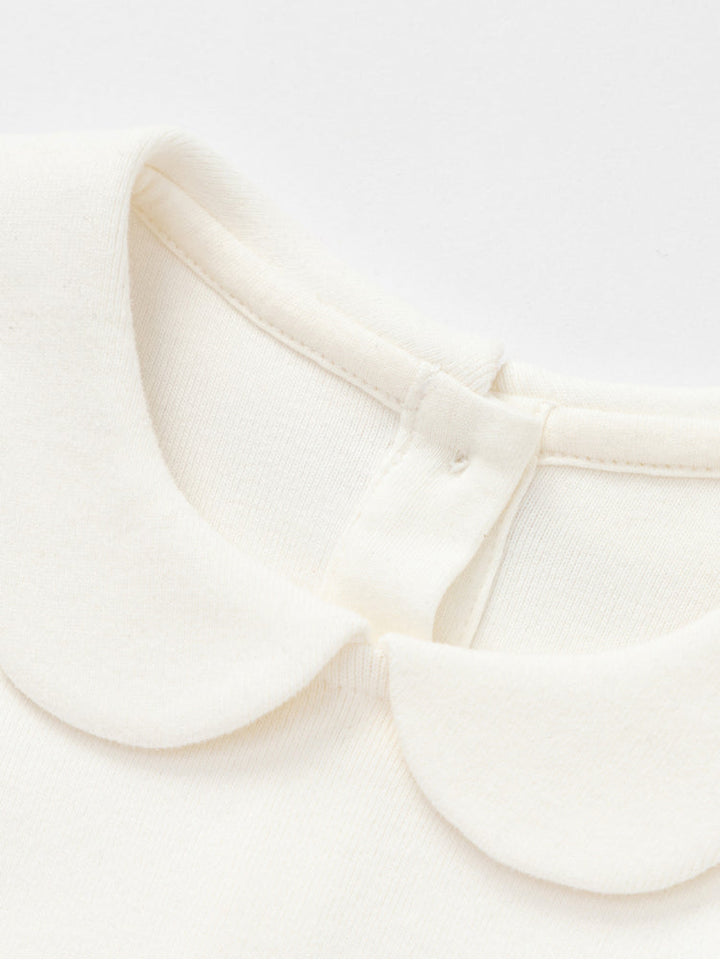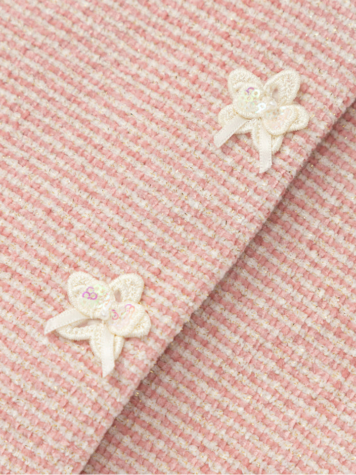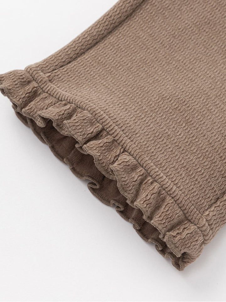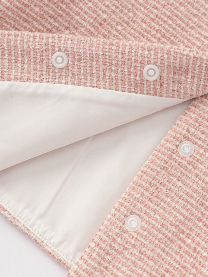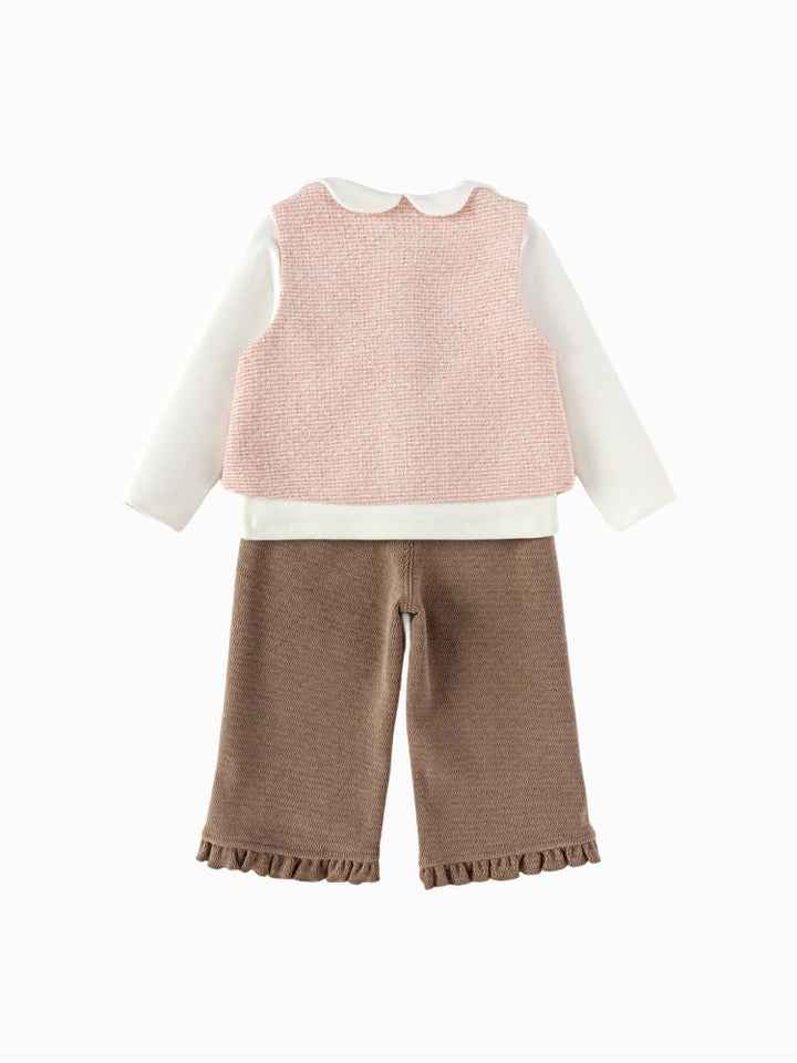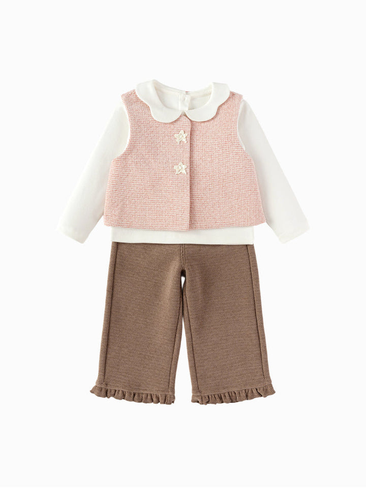طقم أنيق للأطفال يتكون من بلوزة ناعمة بأكمام طويلة وياقة بطرية، صديرية قصيرة بنقشة بارزة مع أزرار أمامية، وسروال واسع مزين بكشكش عند الحافة. مريح وعصري لإطلالة مميزة طوال اليوم.
