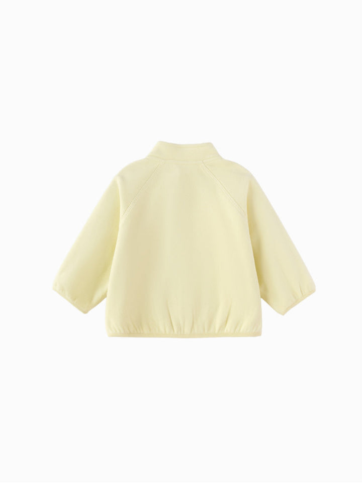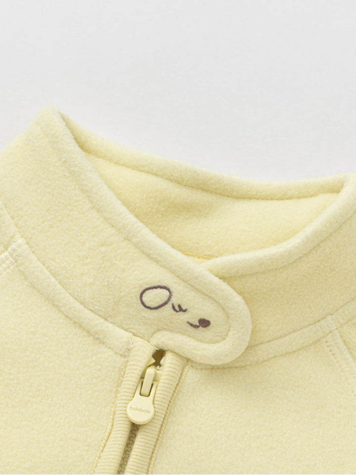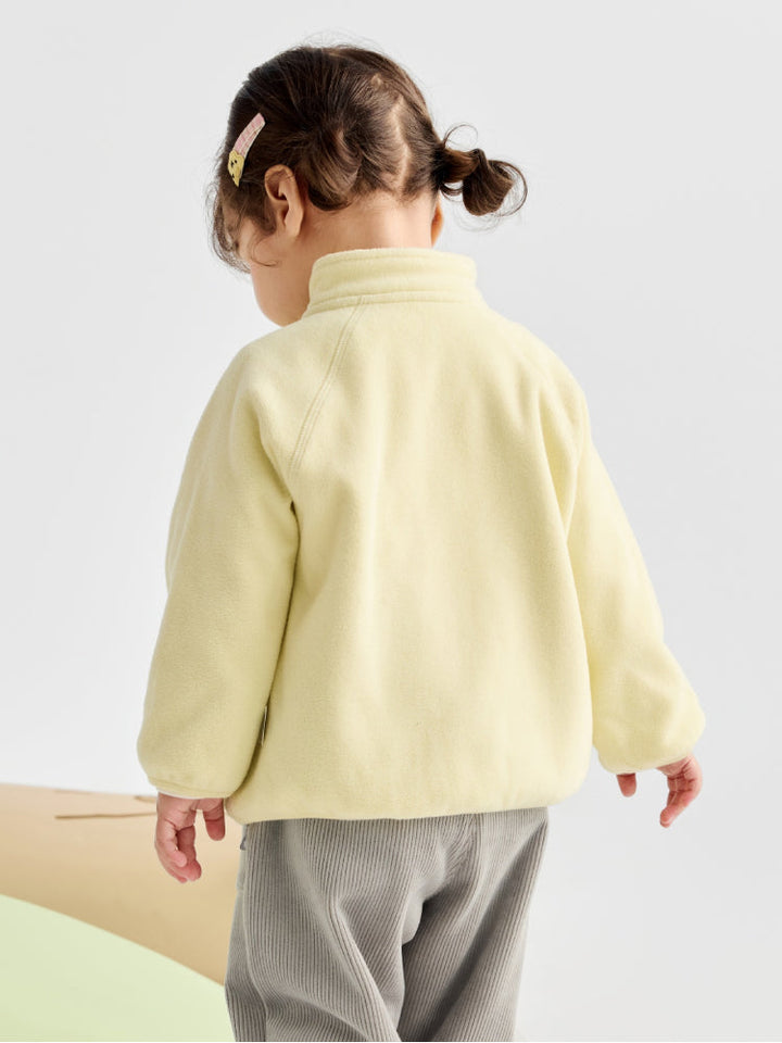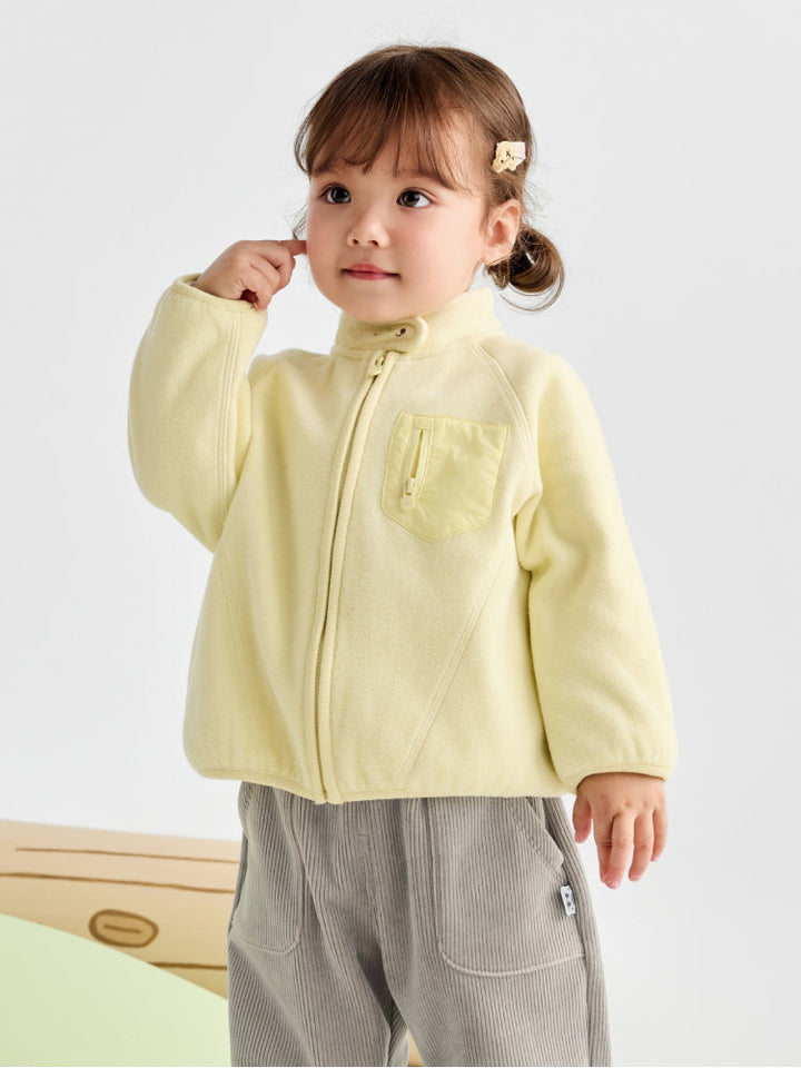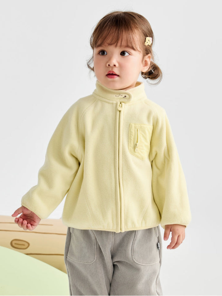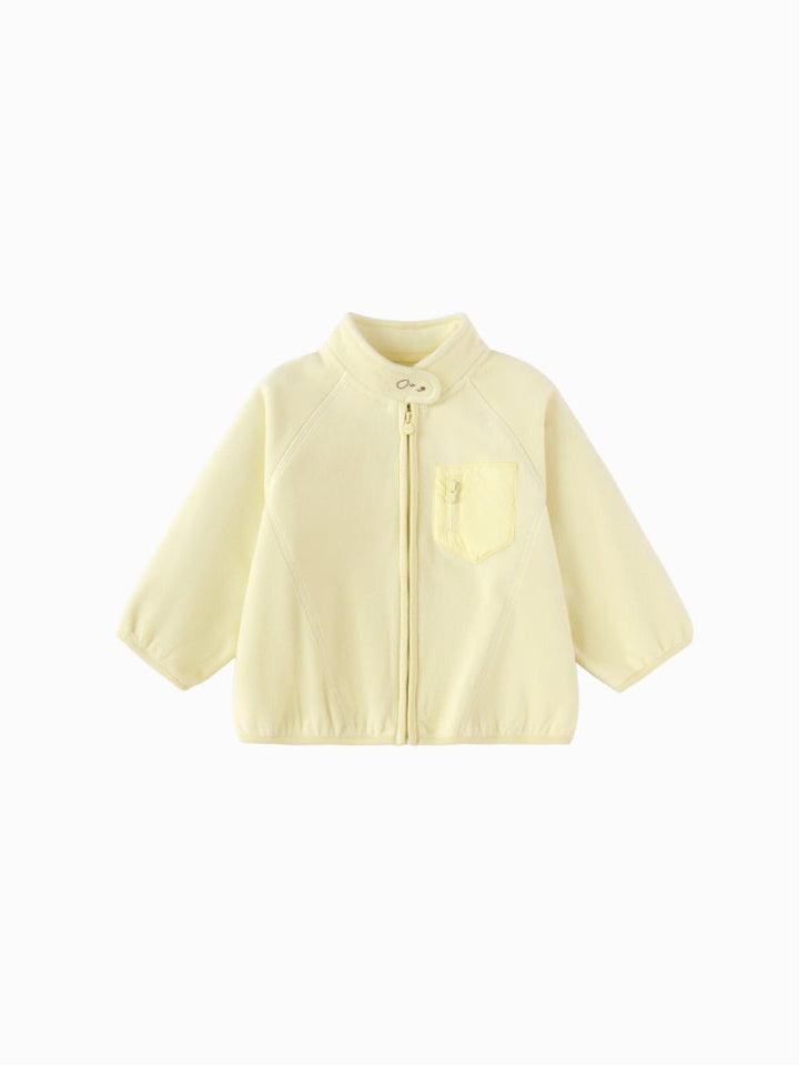 جاكيت أطفال مصنوع من قماش الفليس الناعم، مزود بسحاب أمامي وجيب على الصدر لمسة عملية. يتميز بأكمام طويلة بحواف مطاطية لراحة أكبر ودفء مثالي، مناسب للارتداء اليومي.