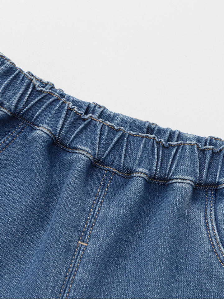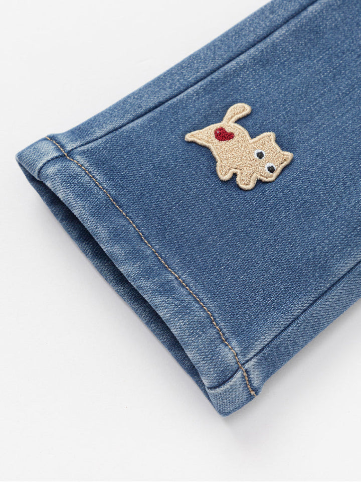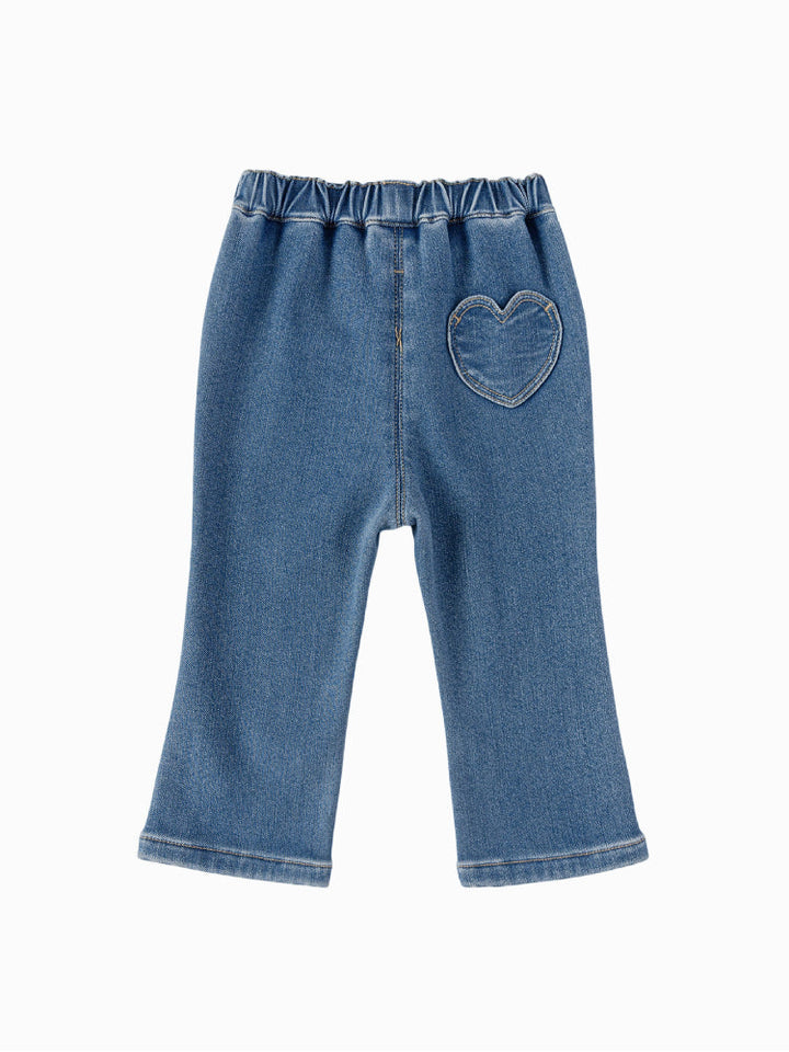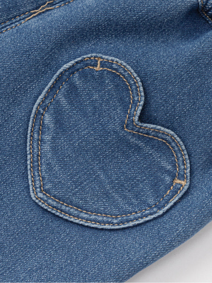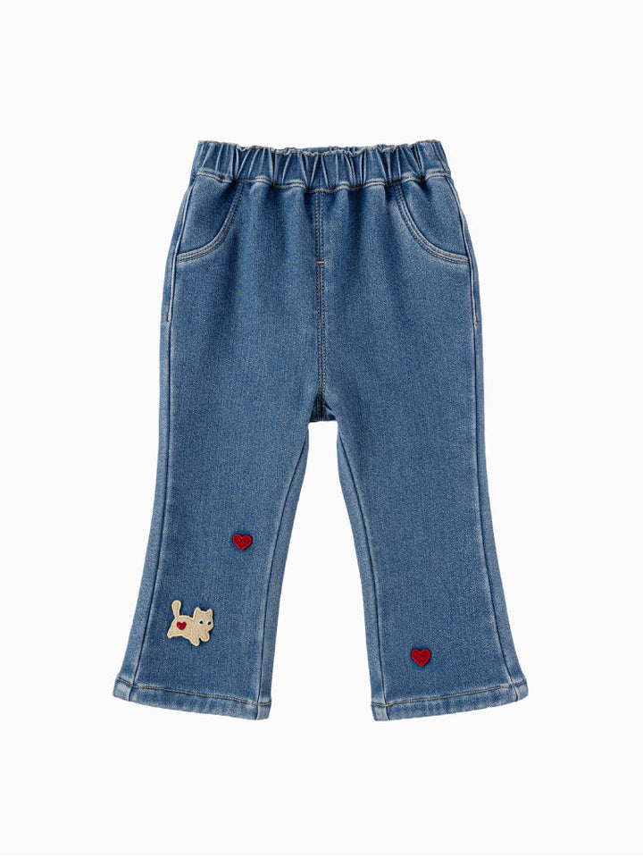 بنطلون دنيم للأطفال بتصميم عملي مع خصر مطاطي لارتداء سهل وراحة طوال اليوم. مزين بتطريز مرح لكلب وقلوب صغيرة في الأمام، بالإضافة إلى جيب خلفي بشكل قلب يضيف لمسة لطيفة. مثالي للإطلالات اليومية.