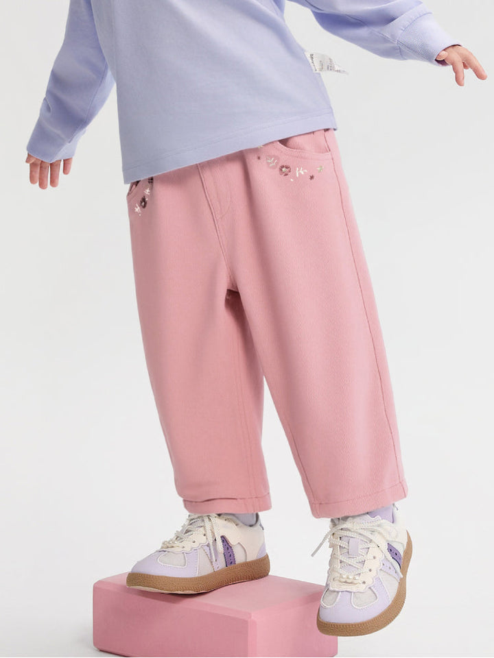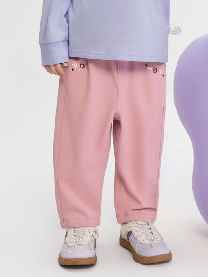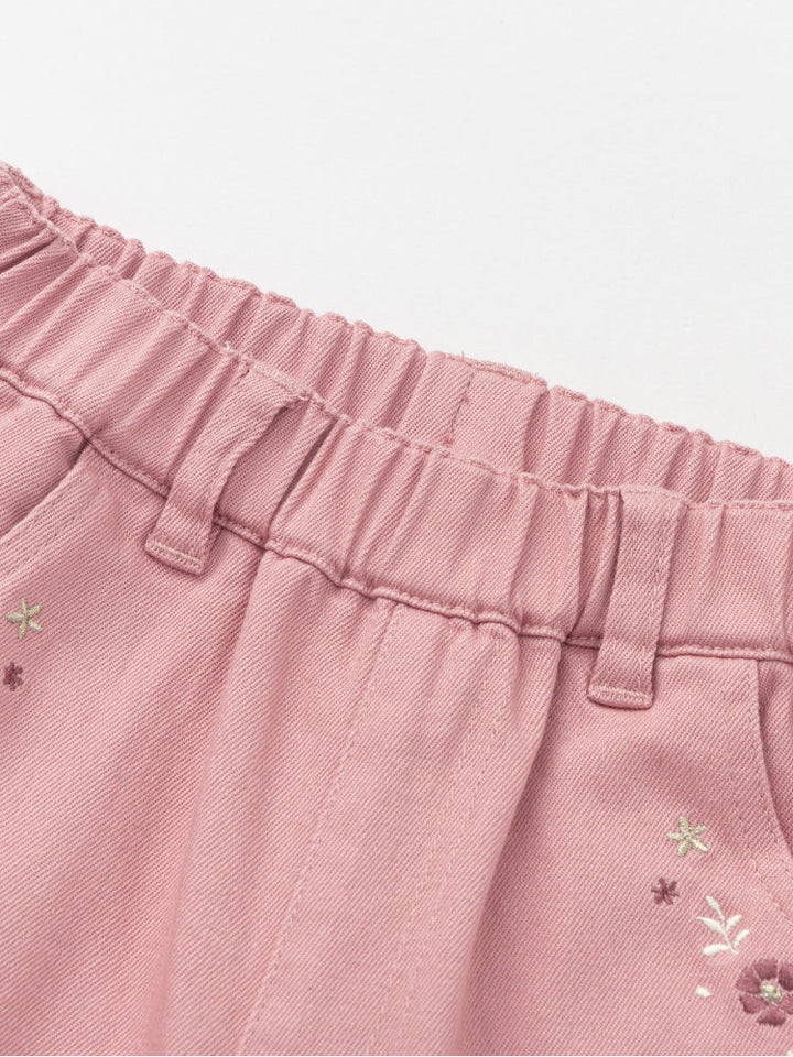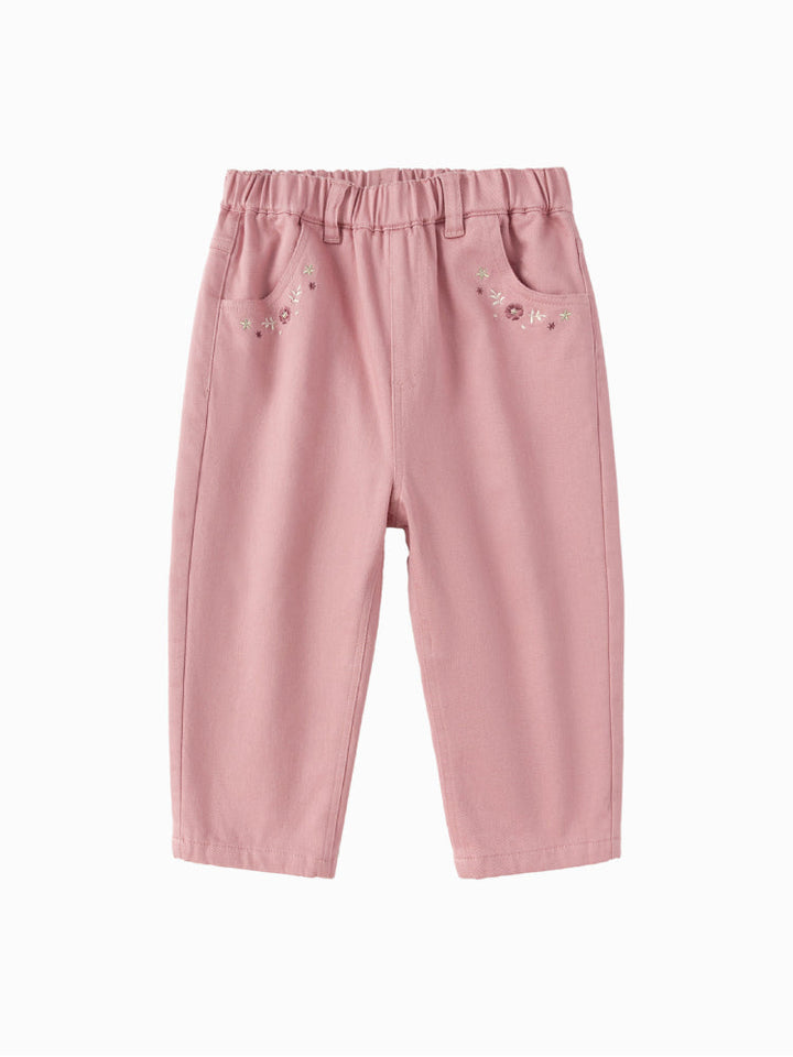 بنطلون مريح للأطفال بخصر مطاطي لارتداء سهل وثبات مريح. مزين بتطريزات ورود ناعمة قرب الجيوب الأمامية ليمنح لمسة أنيقة وجذابة للإطلالة اليومية البسيطة. يتميز بجيوب خلفية تضيف لمسة عملية وعصرية.