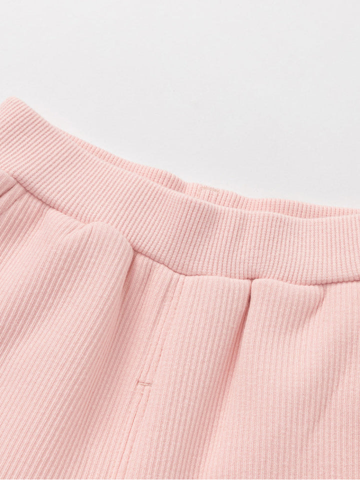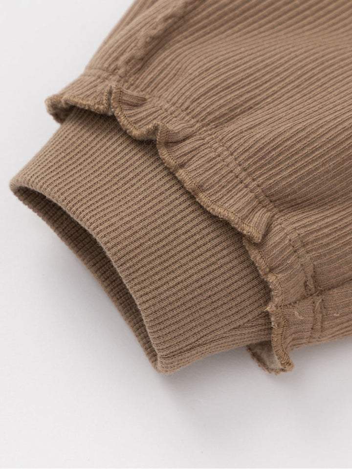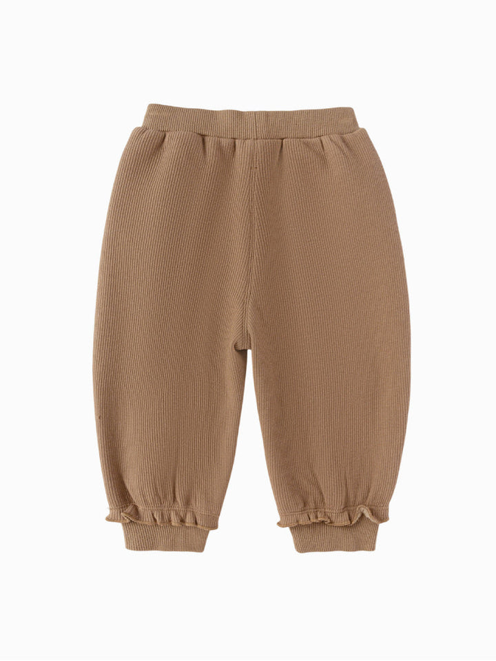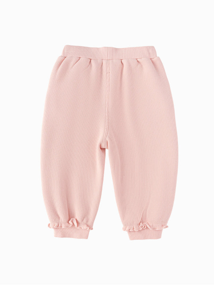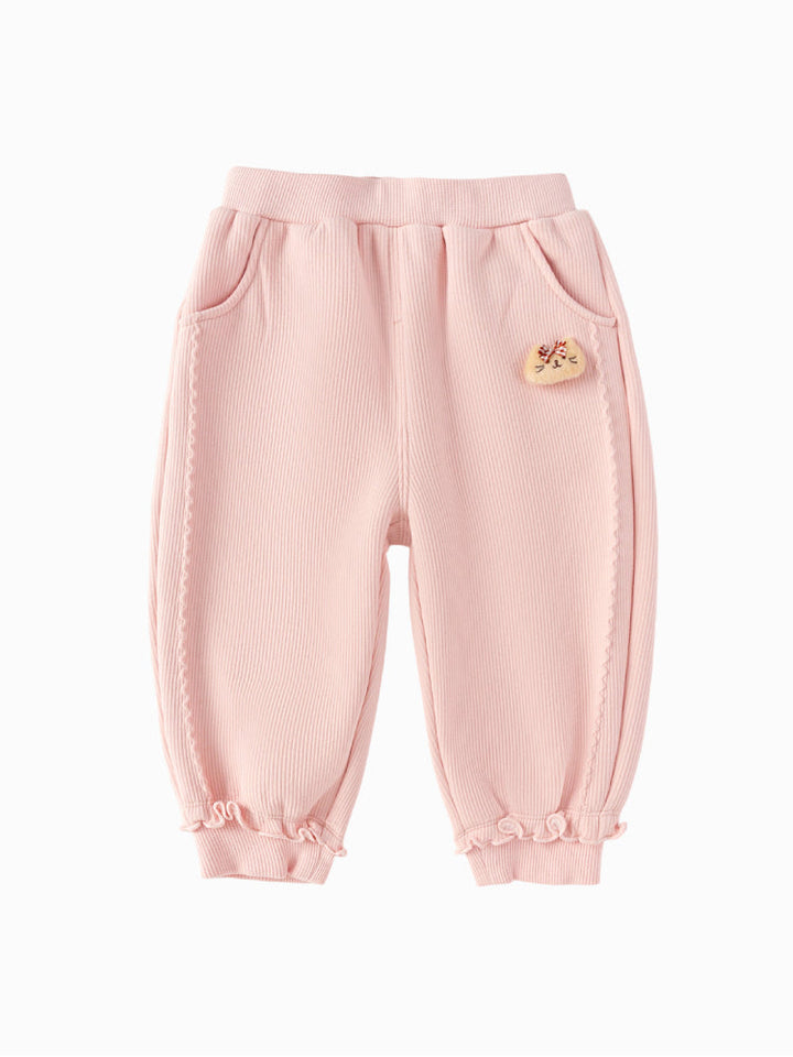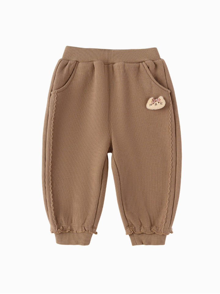 بنطلون أطفال مريح بتصميم مخطط مع خصر مطاطي لارتداء سهل وجيبين جانبيين. مزين برقعة قطة لطيفة في الأمام ويكتمل بحواف مكشكشة لإطلالة ناعمة ومرحة. مثالي للارتداء اليومي والمشاوير البسيطة.