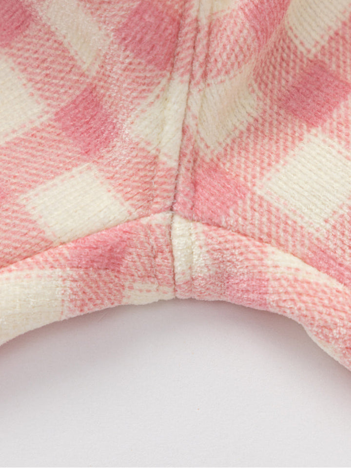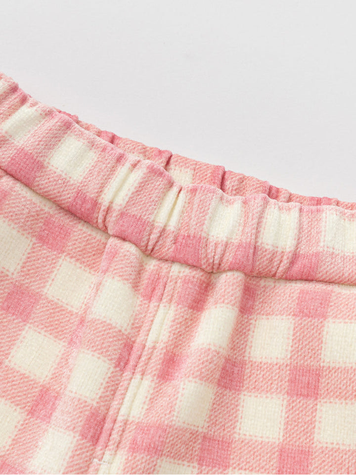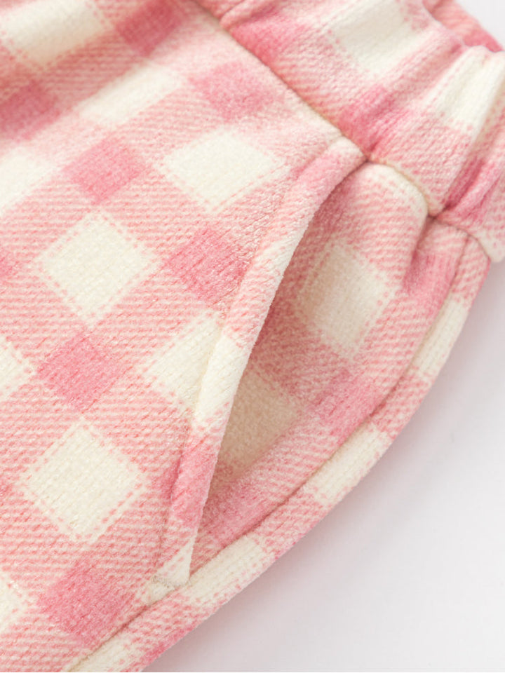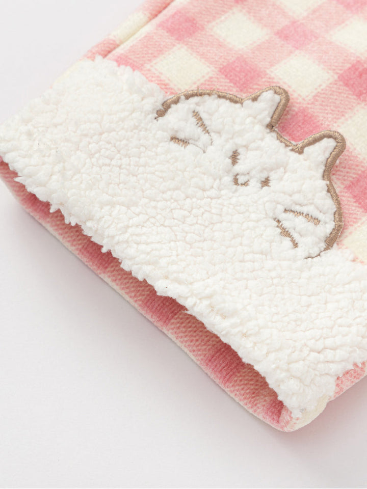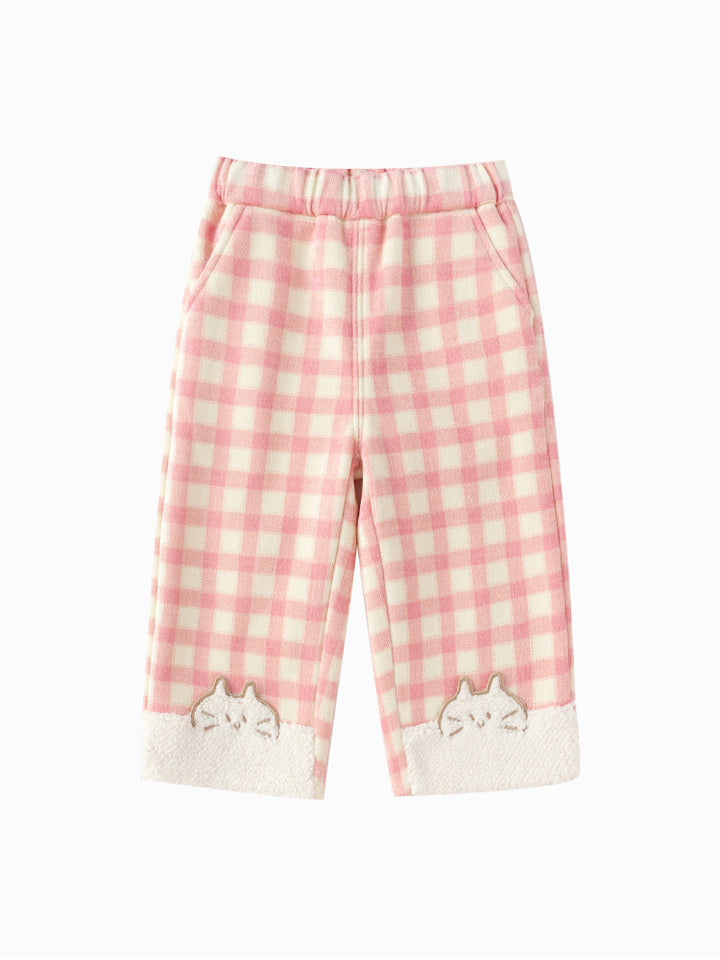 بنطلون أطفال دافئ مصنوع من قماش الفرو الناعم، يتميز بخصر مطاطي مريح وجيوب جانبية عملية. مصمم بنقشة مربعات لطيفة ومزين عند الحواف برقع قطة مرحة مع لمسة فرو ناعمة. خيار مثالي ودافئ للأيام الباردة.