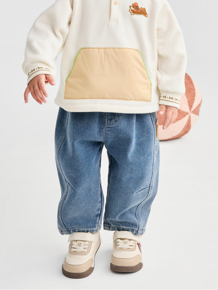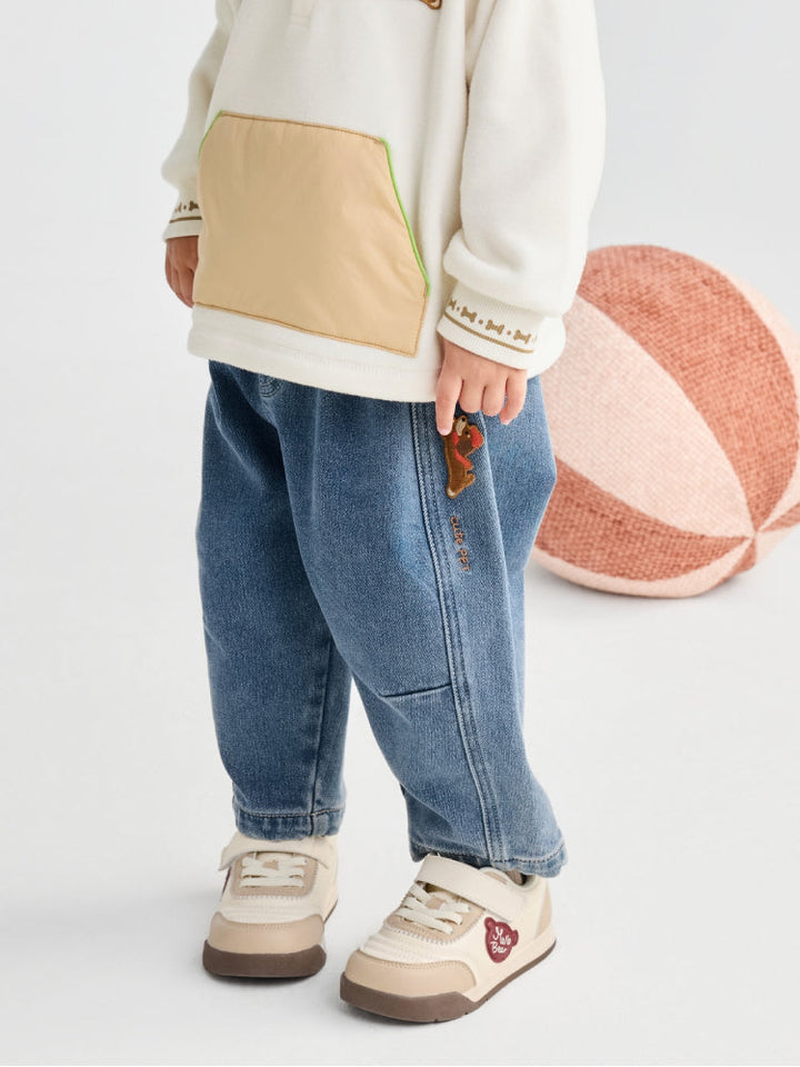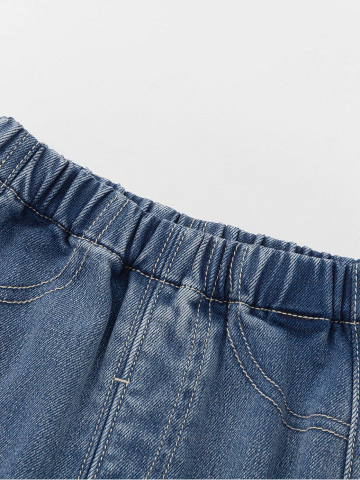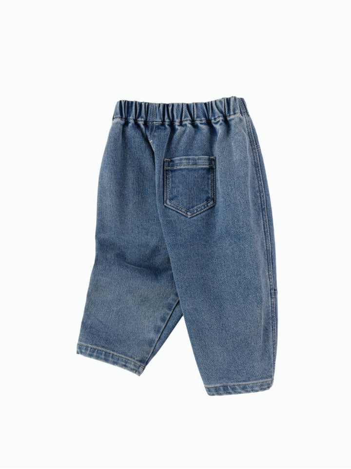 بنطلون جينز للأطفال بستايل يومي مريح مع خصر مطاطي وتطريز جانبي مرح. مزود بجيب خلفي لإطلالة عملية وأنيقة في آن واحد.