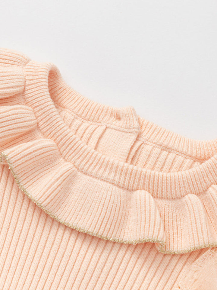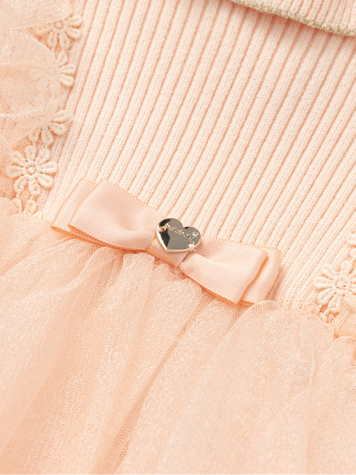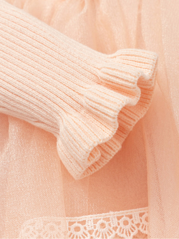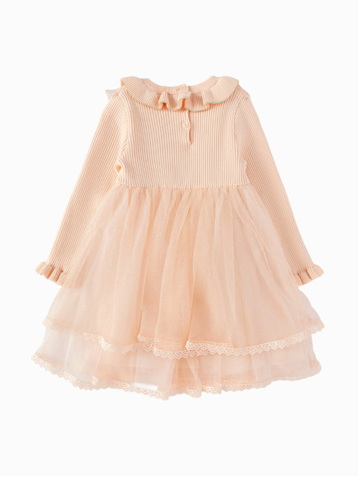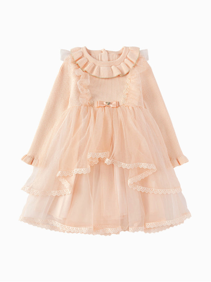 فستان أنيق للبنات بأكمام طويلة، يتميز بجزء علوي محبوك بياقة كشكش، وتنورة تول متعددة الطبقات مزينة بدانتيل ناعم، مع ربطة رقيقة عند الخصر. مثالي للمناسبات والاحتفالات.