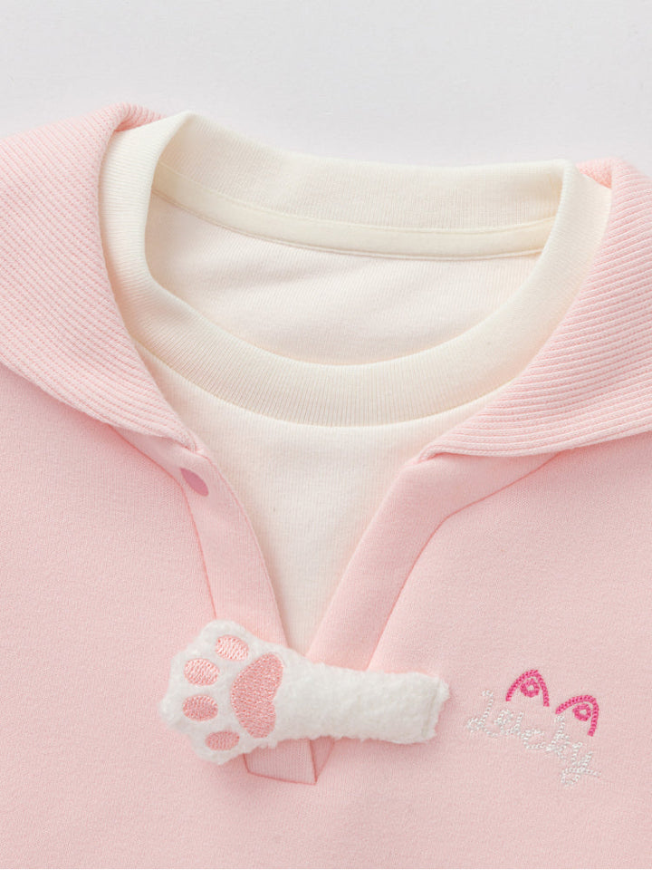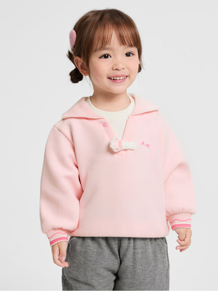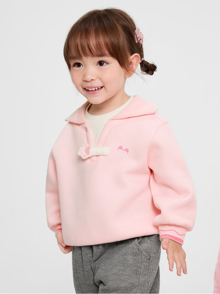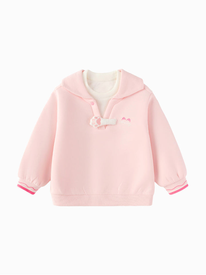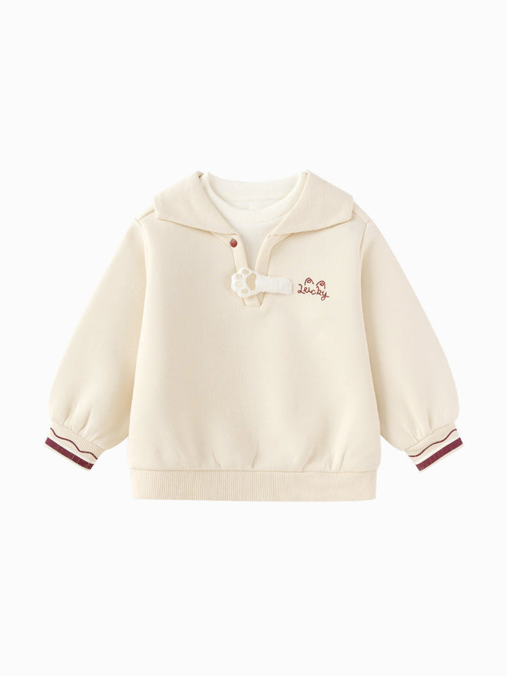 سويت شيرت أنيق للأطفال مزود بياقة بحرية وتصميم لطيف على شكل كف عند الرقبة. يأتي بأساور مطاطية وقماش ناعم يمنح الدفء والراحة، مثالي للارتداء اليومي.
