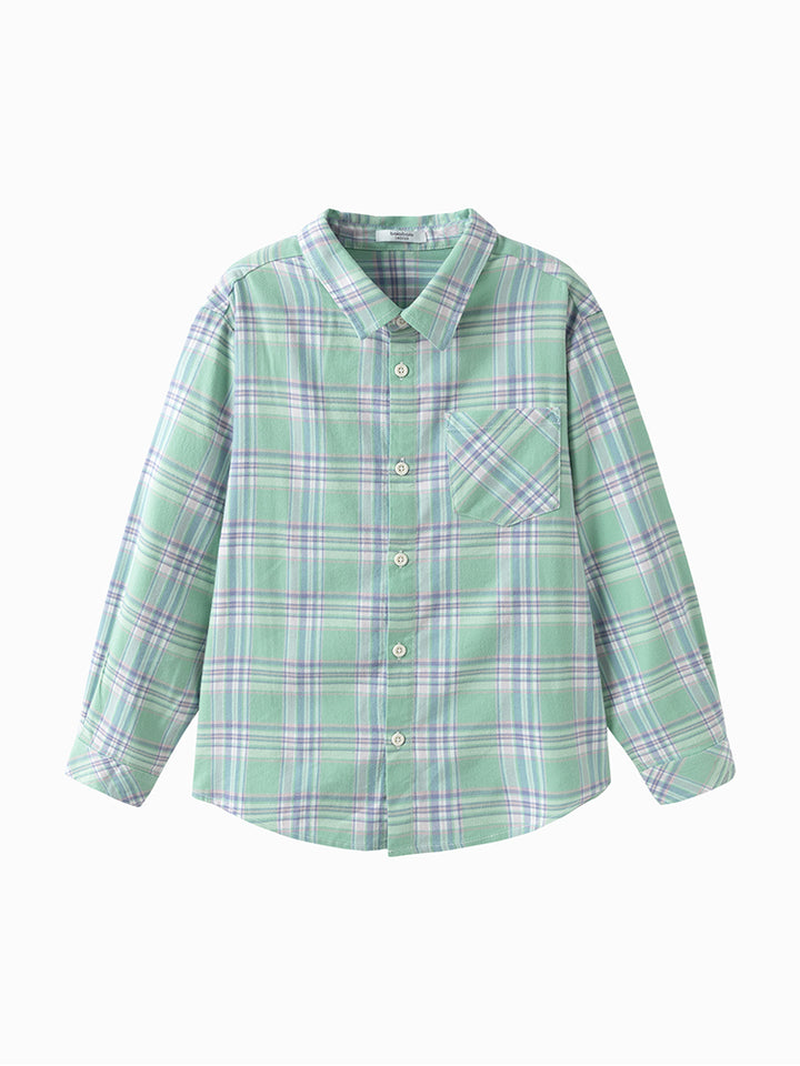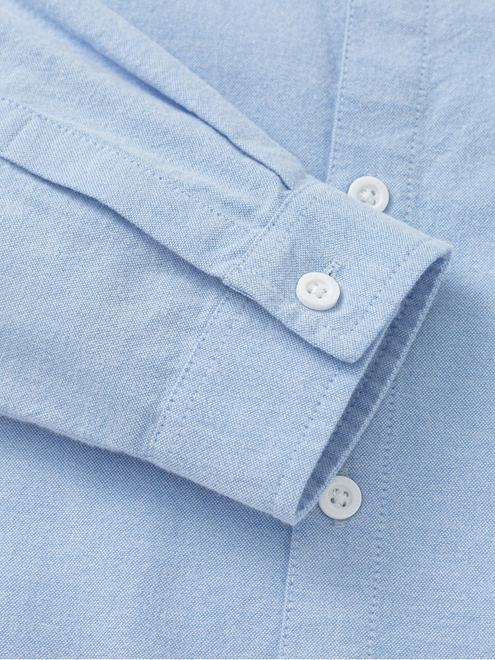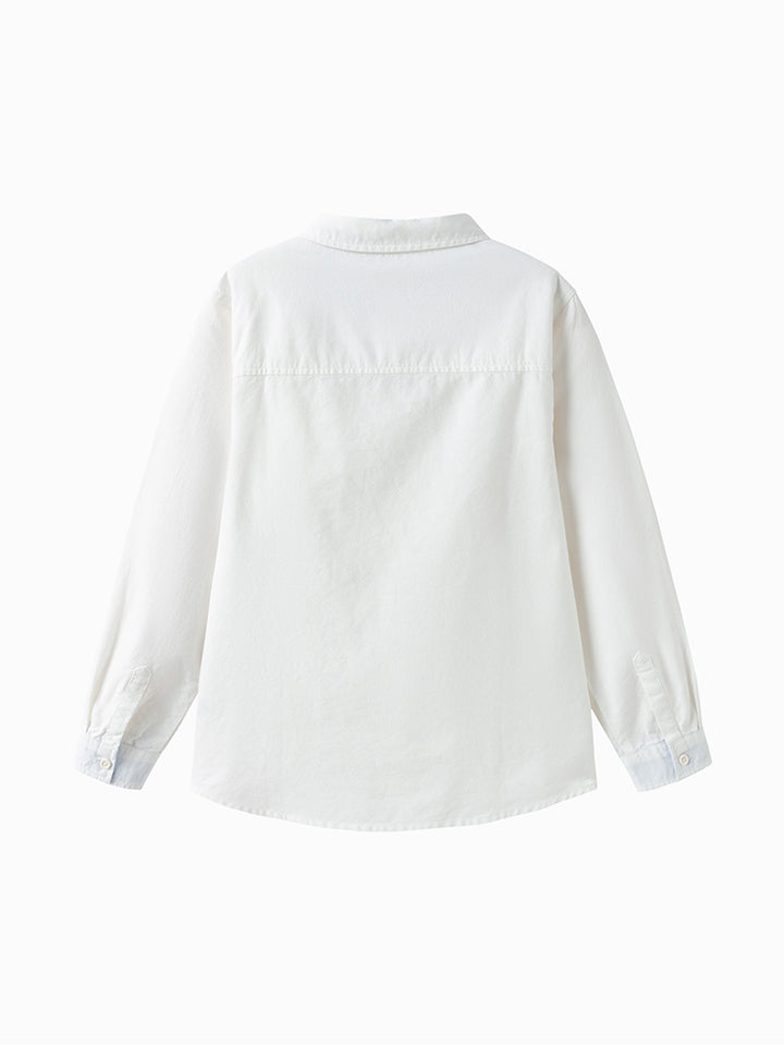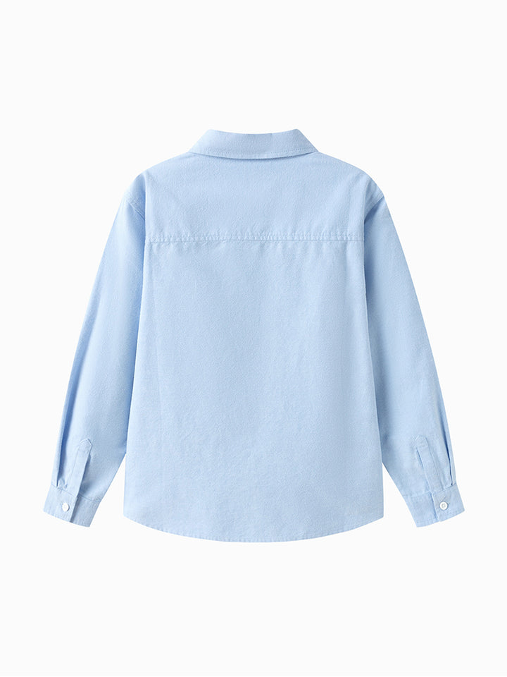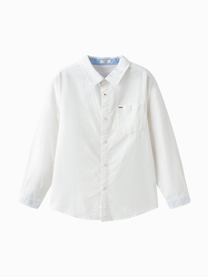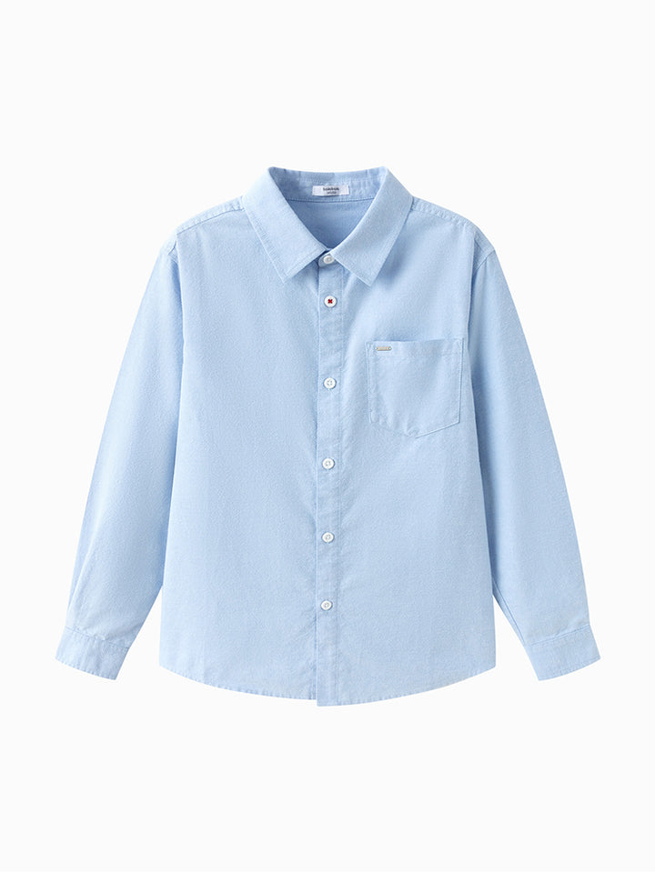قميص بأكمام طويلة بنمط ذو لون موحد سادة، يأتي بجيب أمامي، أزرار أمامية للإغلاق، وبياقة كلاسيكية مطوية