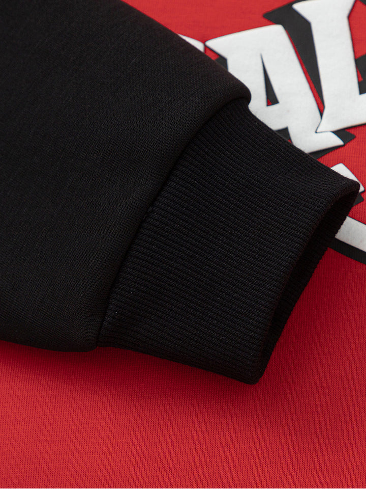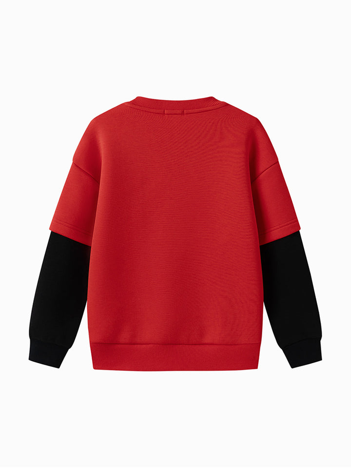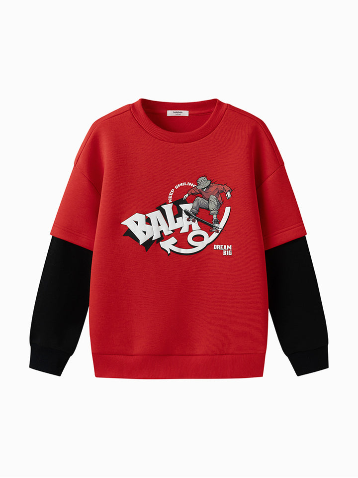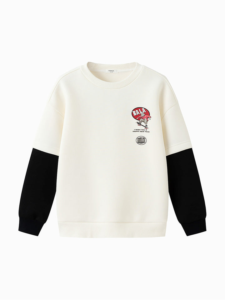 بلوزة سويت شيرت بأكمام طويلة، مزينة بطبع أمامية وخلفية وأكمام متباينة اللون وتأتي بياقة مدورة الشكل