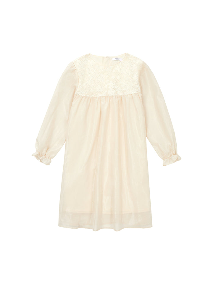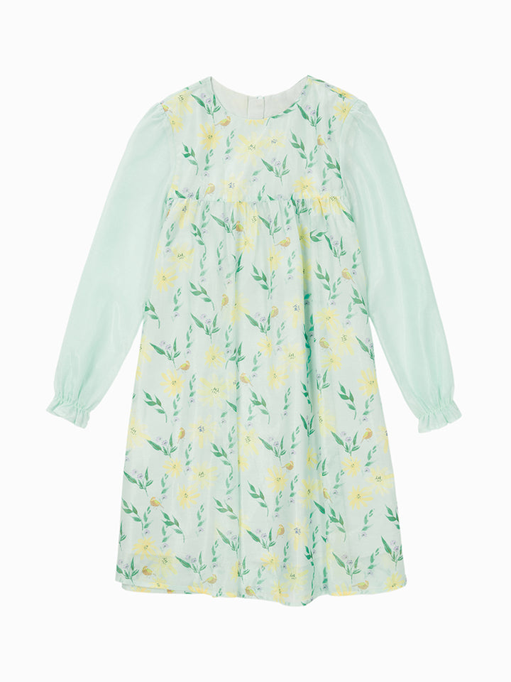 فستان بأكمام طويلة، مزين بستايل مطبع، يأتي بسحاب للإغلاق من الجهة الخلفية وبقبة مدورة الشكل