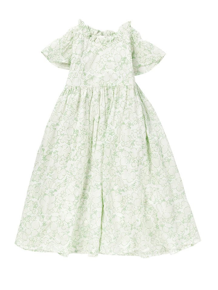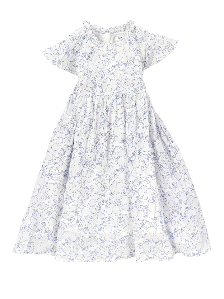 فستان بأكمام قصيرة، مزين بستايل مطبع ثنائي اللون وتفاصيل مكشكشة على الأكمام والقبة، يأتي بسحاب للإغلاق من الجهة الخلفية وبقبة مدورة الشكل