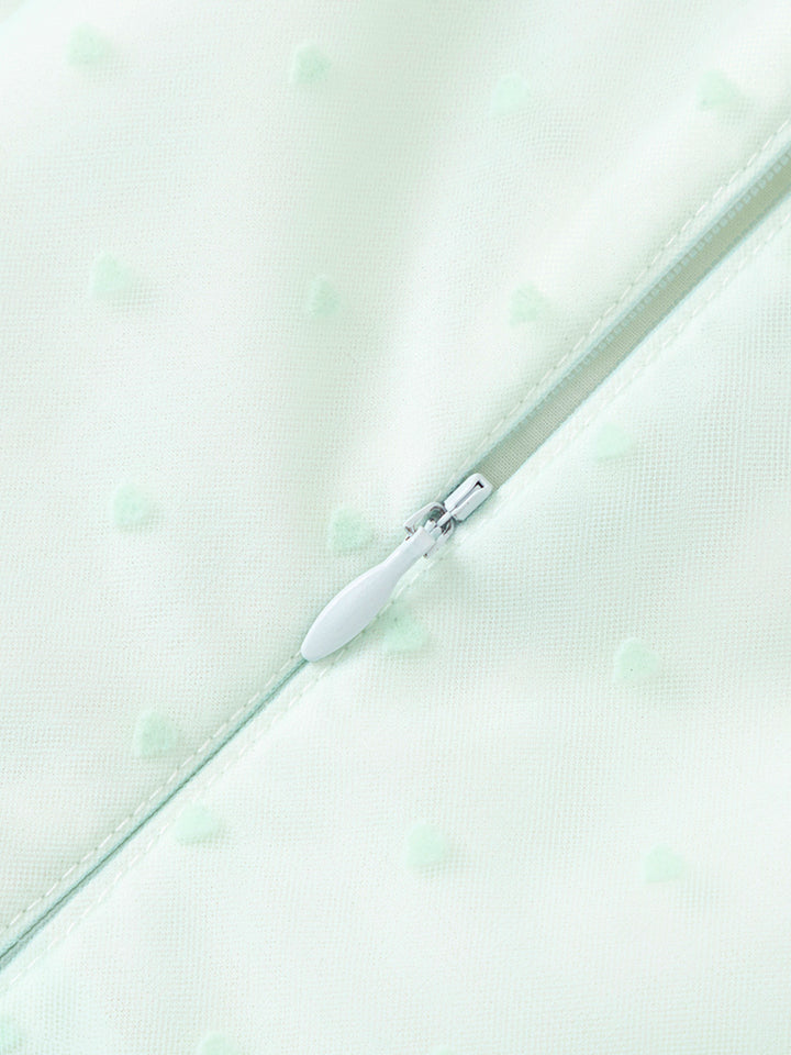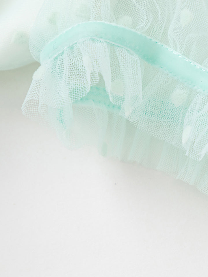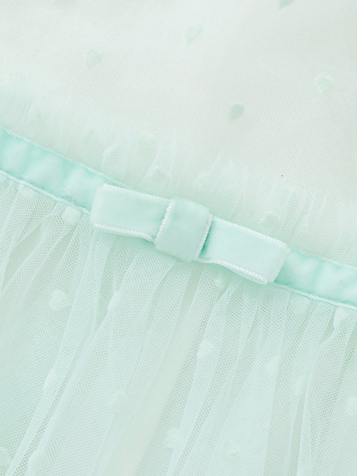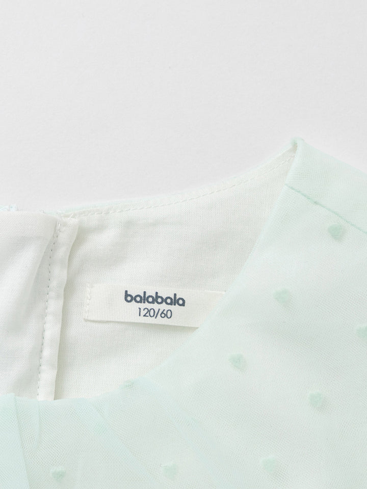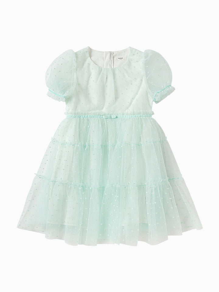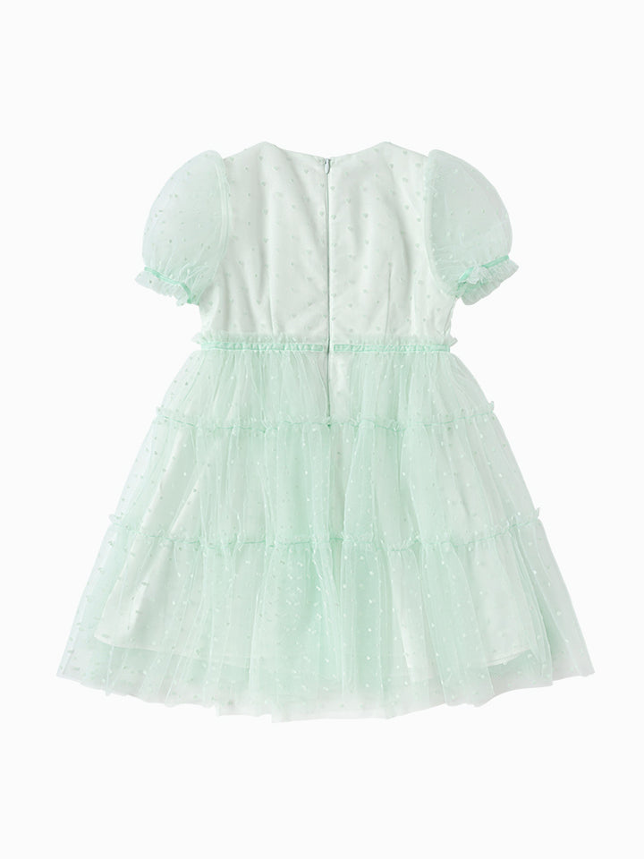 فستان بأكمام قصيرة بستايل طبقات مكشكش، يأتي بخامة نسيج شبك منقوشة، سحاب للإغلاق من الجهة الخلفية وبياقة مدورة الشكل