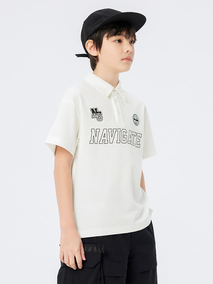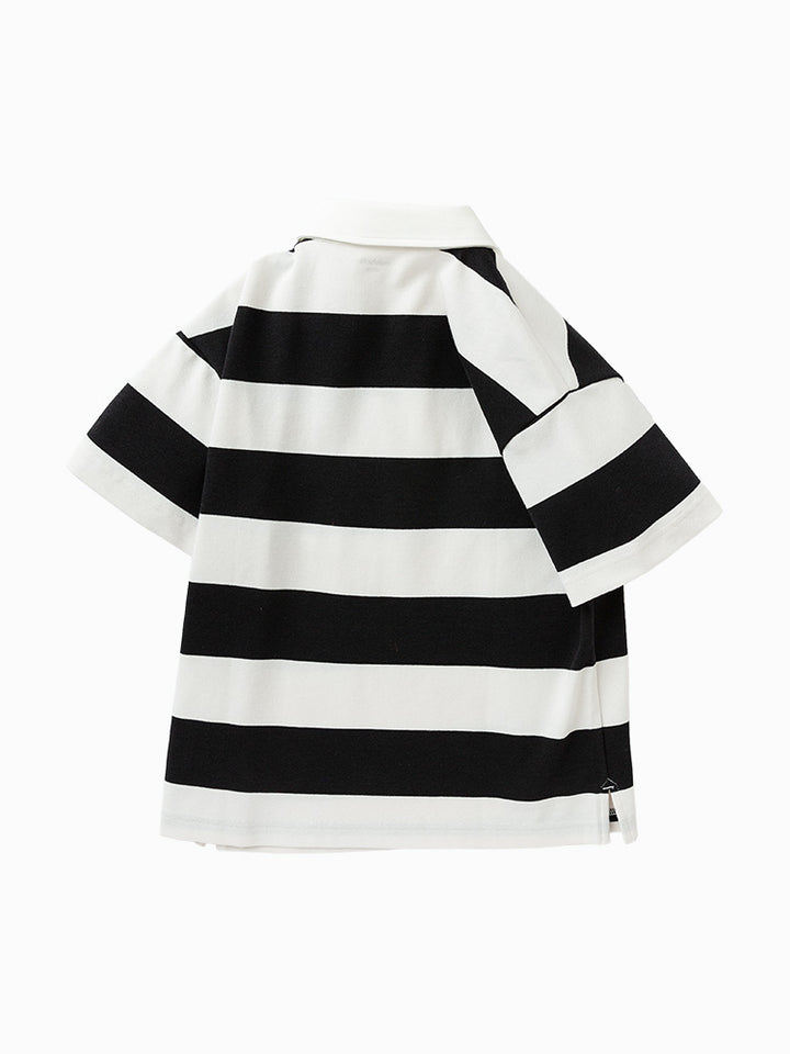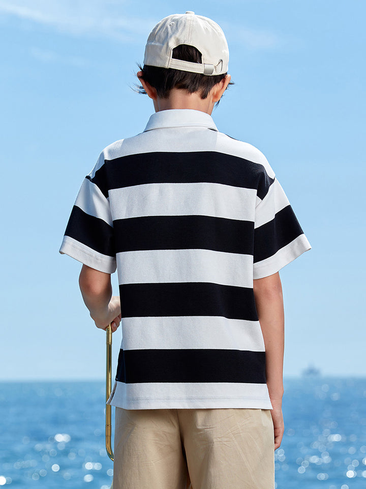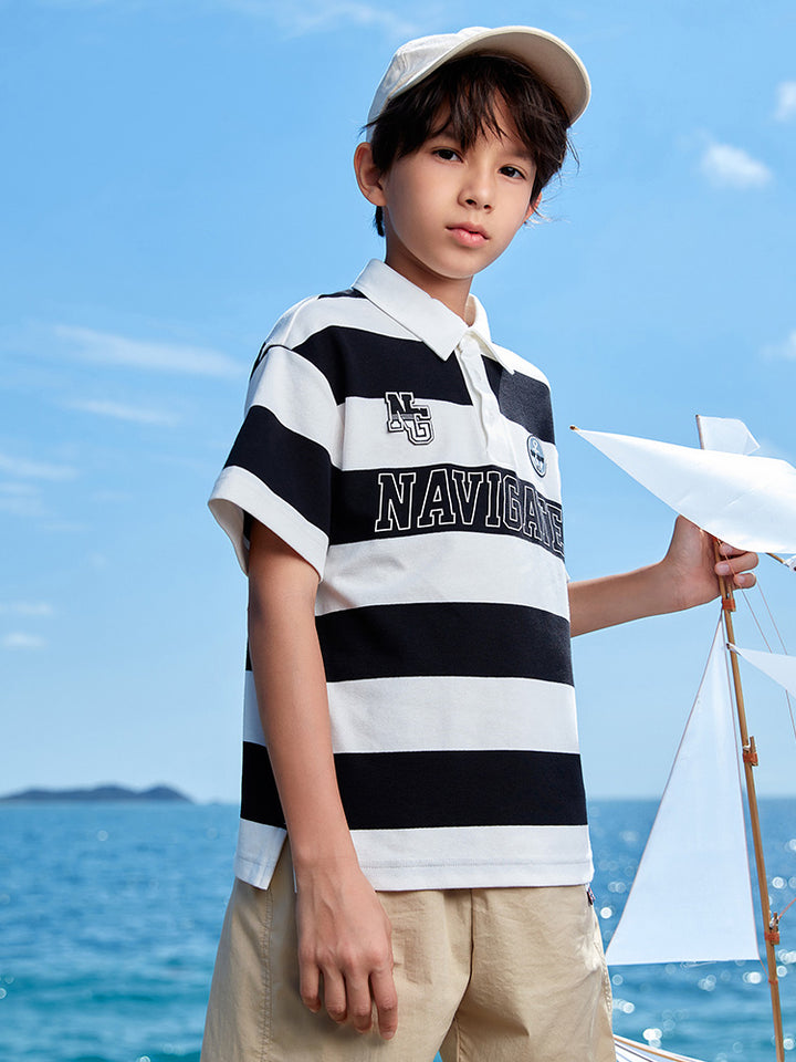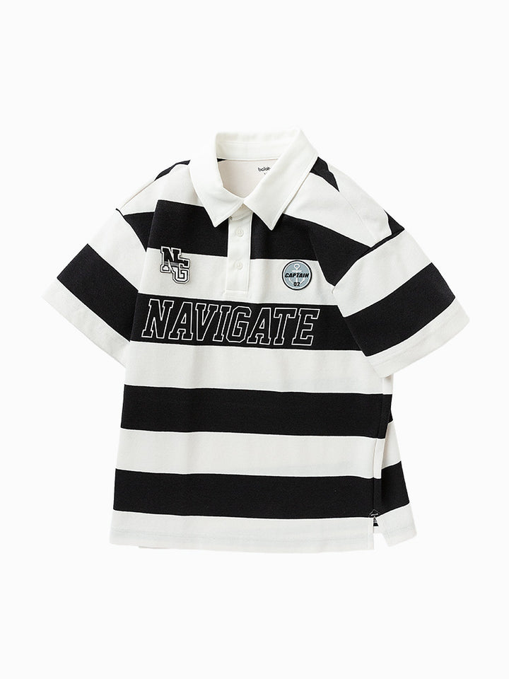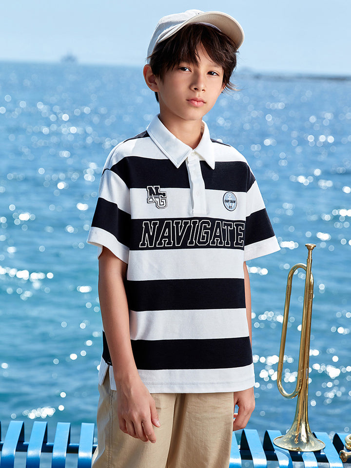 تيشيرت بولو بأكمام قصيرة، مزين بستايل مخطط وطبع من الجهة الأمامية، يأتي بأزرار عند جهة القبة وبياقة عادية