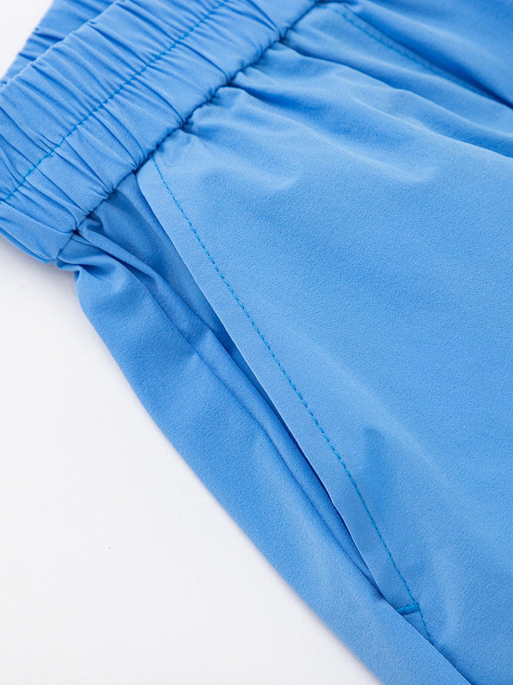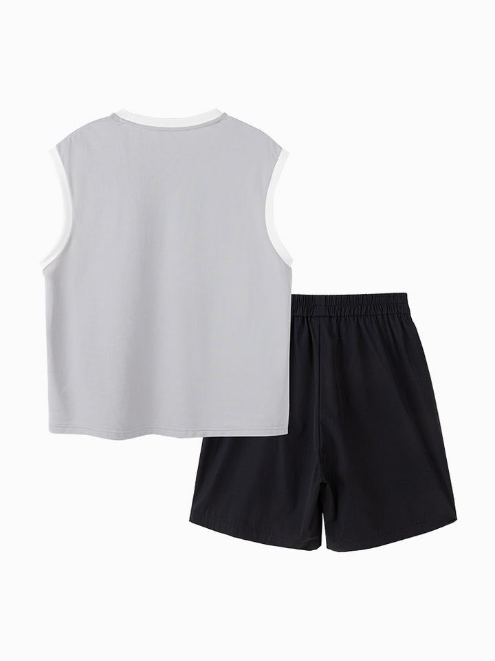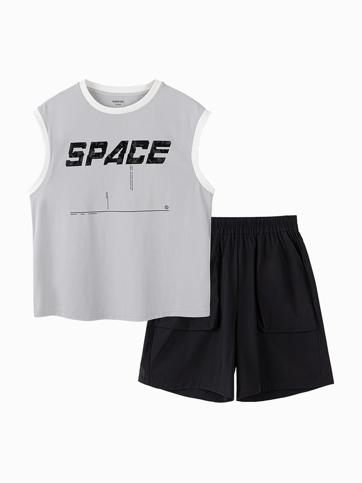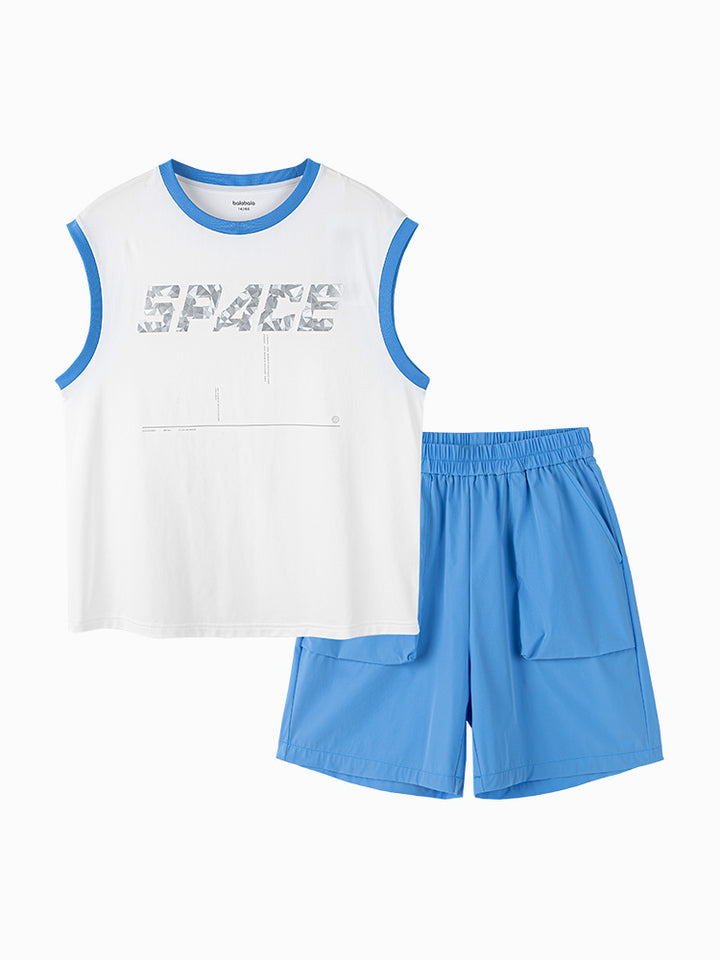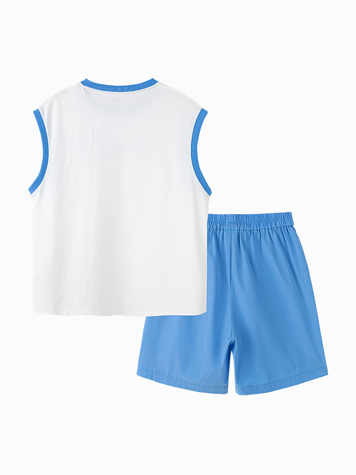 طقم ولادي مكون من قطعتين، تيشيرت بدون أكمام مزين بطبعة من الجهة الأمامية ويأتي بقبة مدورة الشكل، وشورت ذو لون موحد سادة، يأتي بجيوب من الجهة الأمامية وبخصر مطاطي مريح