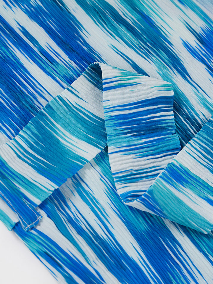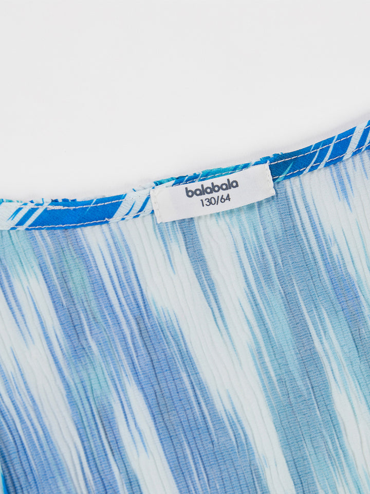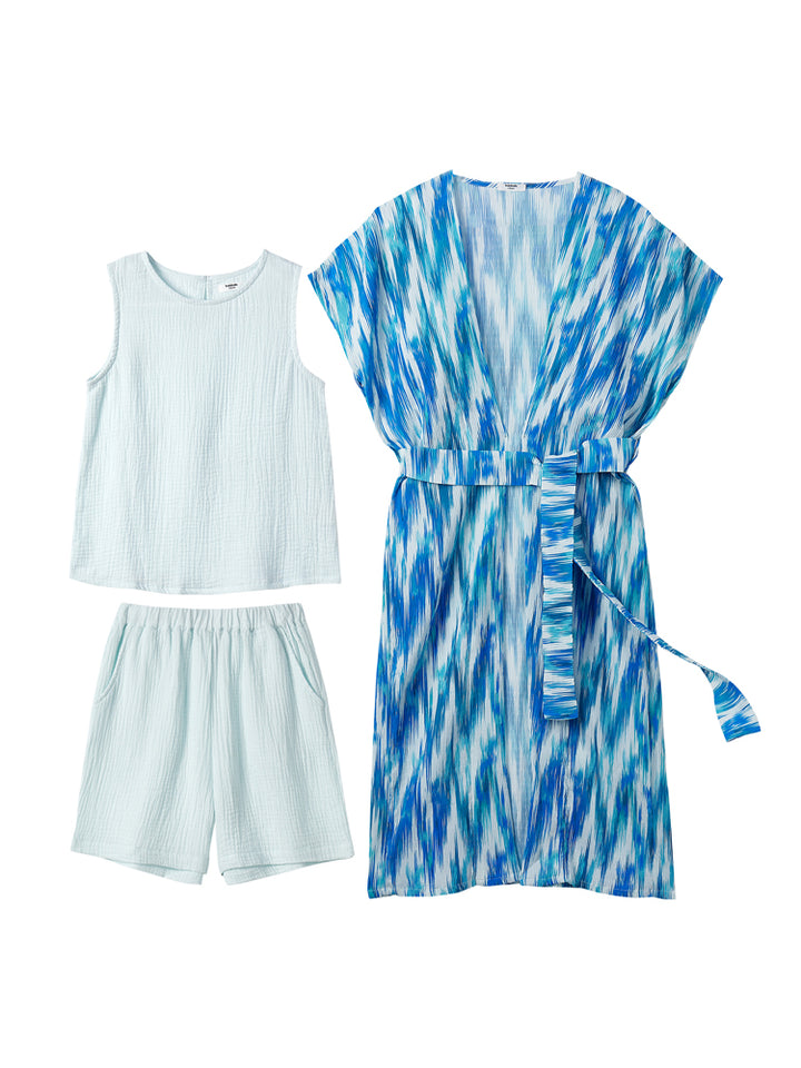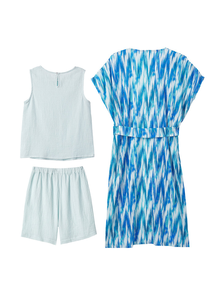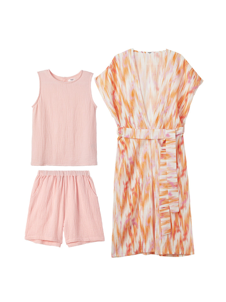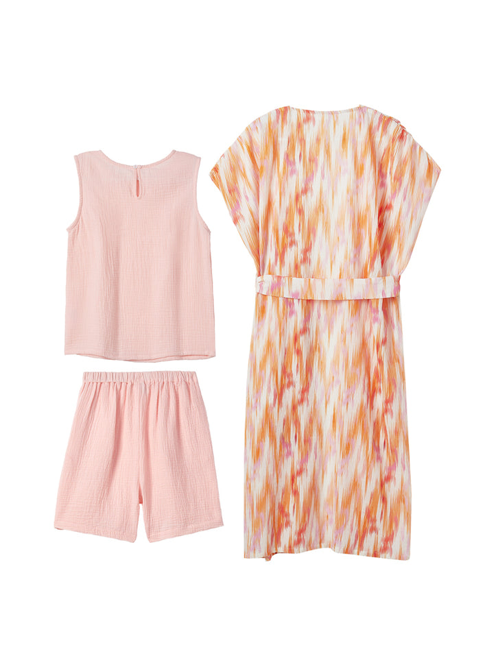 طقم بناتي مكون من 3 قطع، بلوزة بدون أكمام ذات لون موحد بخامة نسيج منقوشة، تأتي بزر للإغلاق من الجهة الخلفية وبياقة مدورة الشكل، وشورت فضفاض ذو لون موحد وبخامة نسيج منقوشة، يأتي بجيوب من الجهة الأمامية وبخصر مطاطي مرن ومريح، وقميص بستايل كيمونة بأكمام قصيرة، مزين بنمط طبعات متعدد الألوان، يأتي بحزام ربط على الخصر