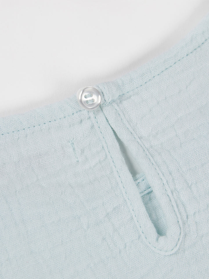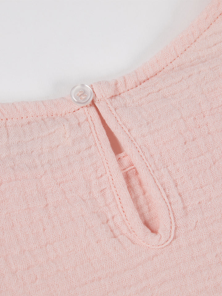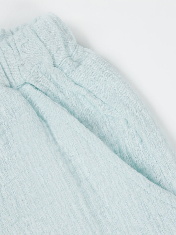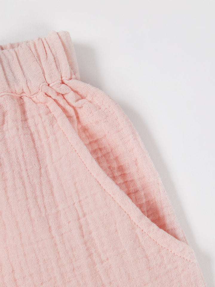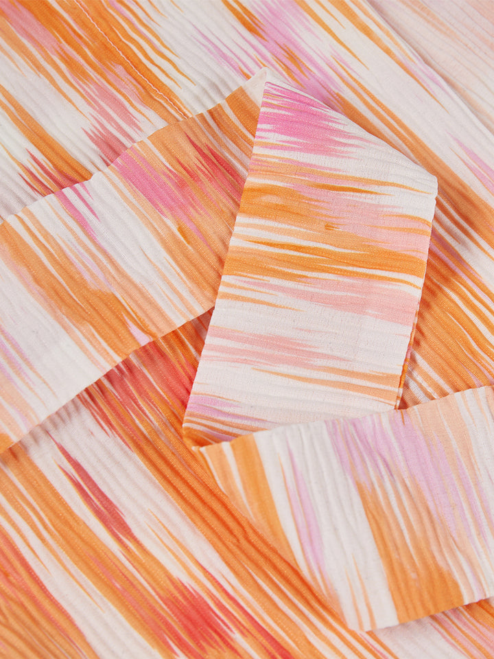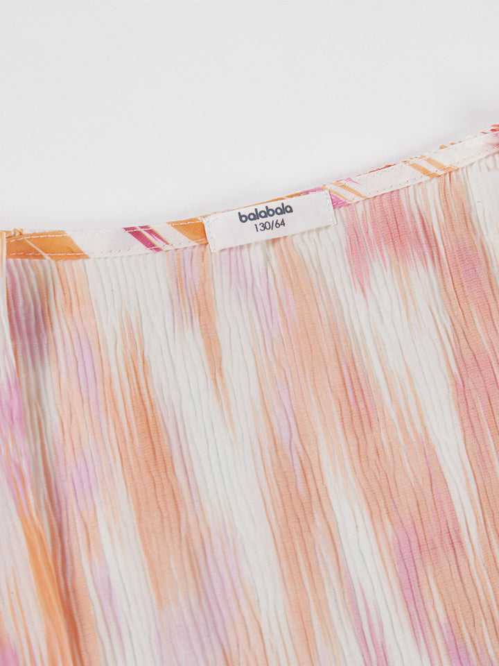 طقم بناتي مكون من 3 قطع، بلوزة بدون أكمام ذات لون موحد بخامة نسيج منقوشة، تأتي بزر للإغلاق من الجهة الخلفية وبياقة مدورة الشكل، وشورت فضفاض ذو لون موحد وبخامة نسيج منقوشة، يأتي بجيوب من الجهة الأمامية وبخصر مطاطي مرن ومريح، وقميص بستايل كيمونة بأكمام قصيرة، مزين بنمط طبعات متعدد الألوان، يأتي بحزام ربط على الخصر