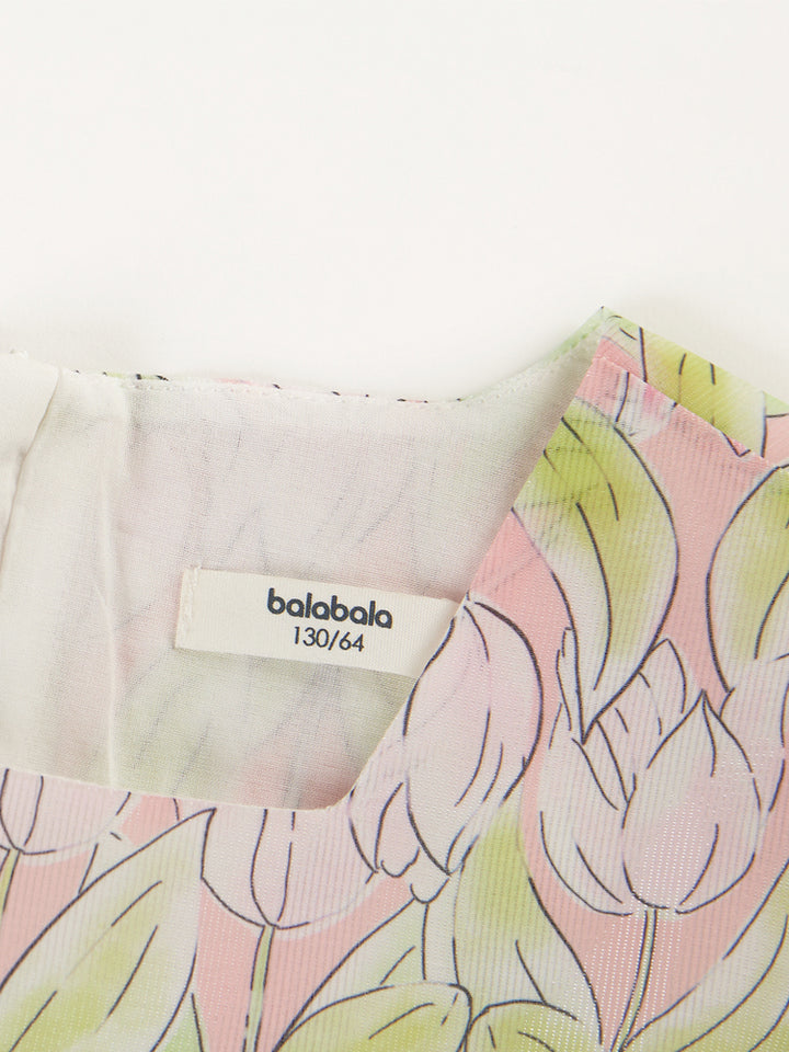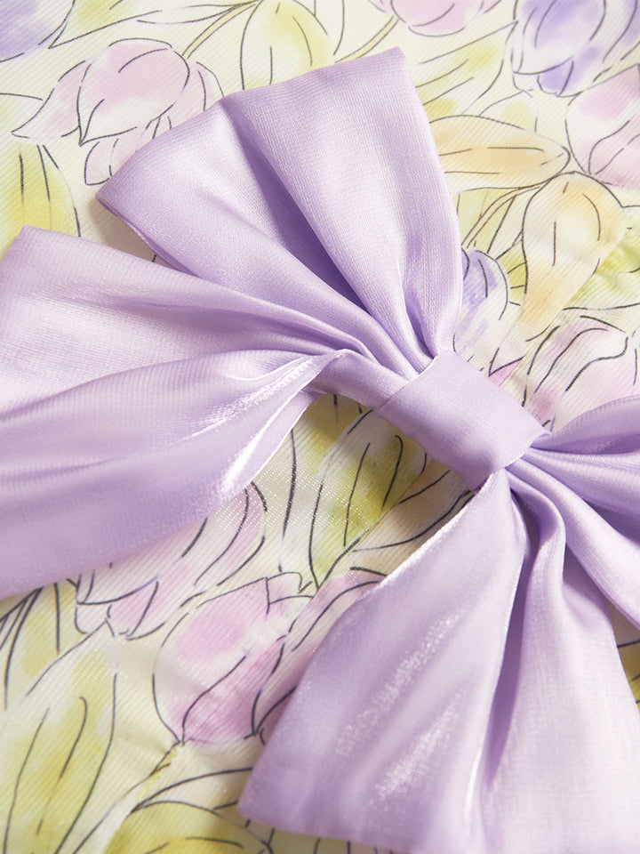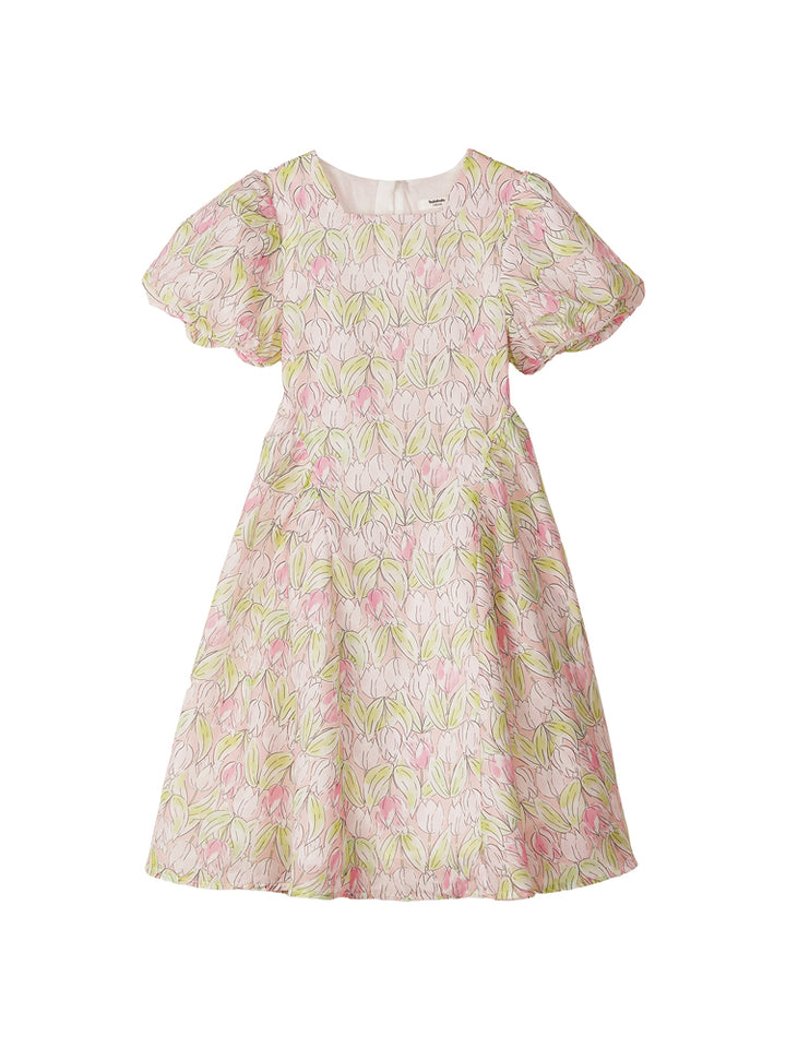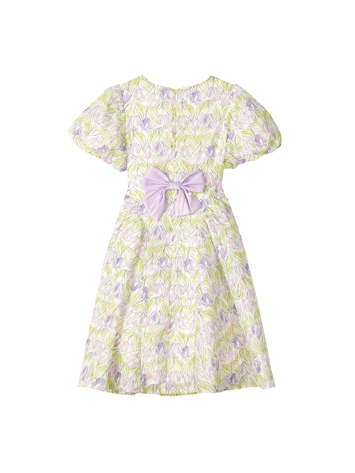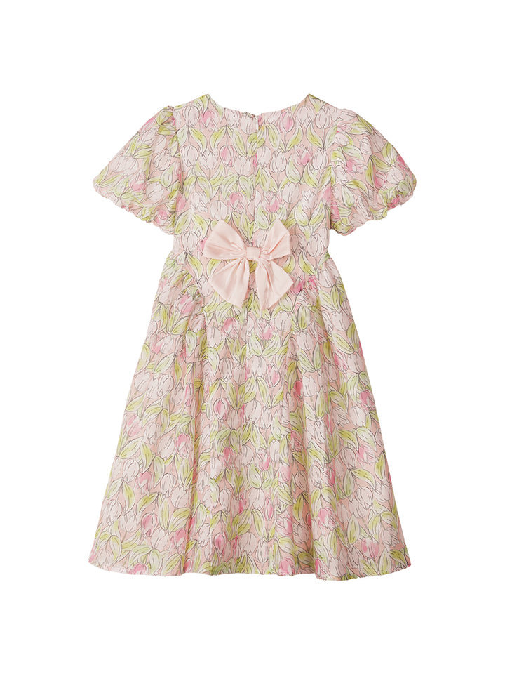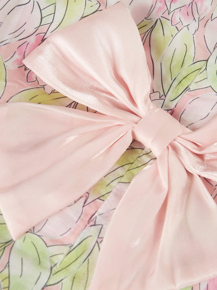 فستان بأكمام قصيرة، بخامة ناعمة وتصميم فضفاض، مزين بنمط طبعات ورود متعددة الألوان على كامل التصميم وببيونة على الجهة الخلفية، يأتي بسحاب للإغلاق من الجهة الخلفية وبياقة مستقيمة الشكل