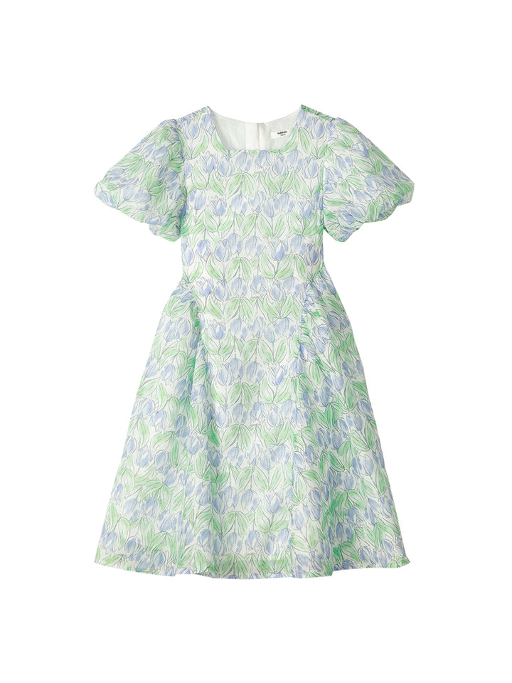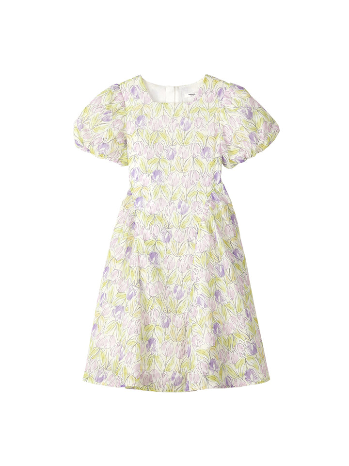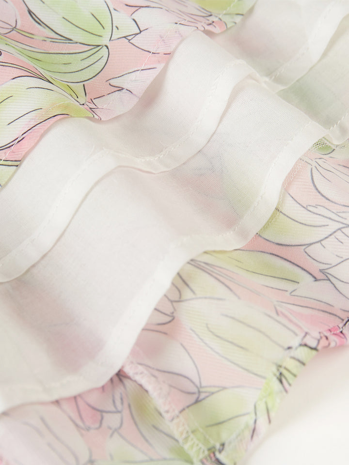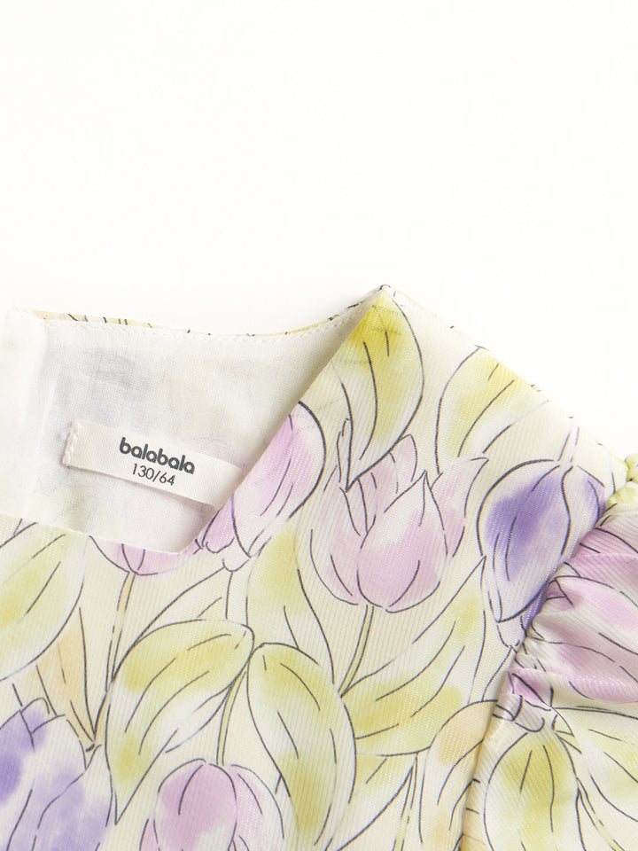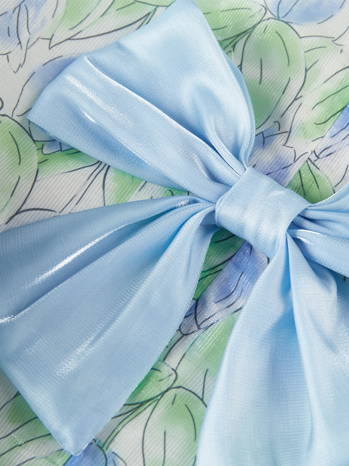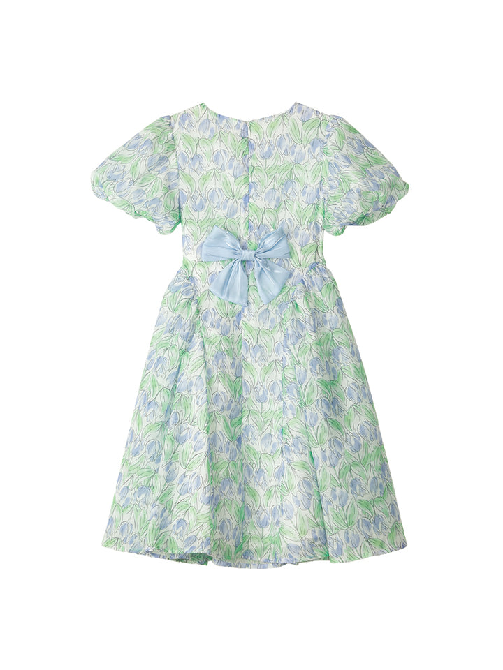 فستان بأكمام قصيرة، بخامة ناعمة وتصميم فضفاض، مزين بنمط طبعات ورود متعددة الألوان على كامل التصميم وببيونة على الجهة الخلفية، يأتي بسحاب للإغلاق من الجهة الخلفية وبياقة مستقيمة الشكل