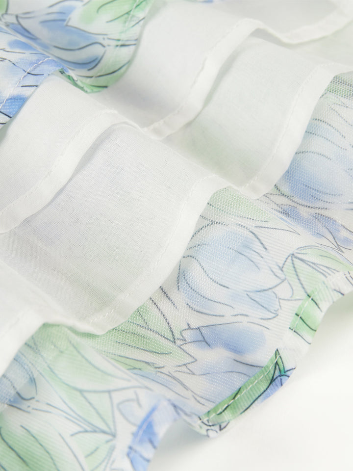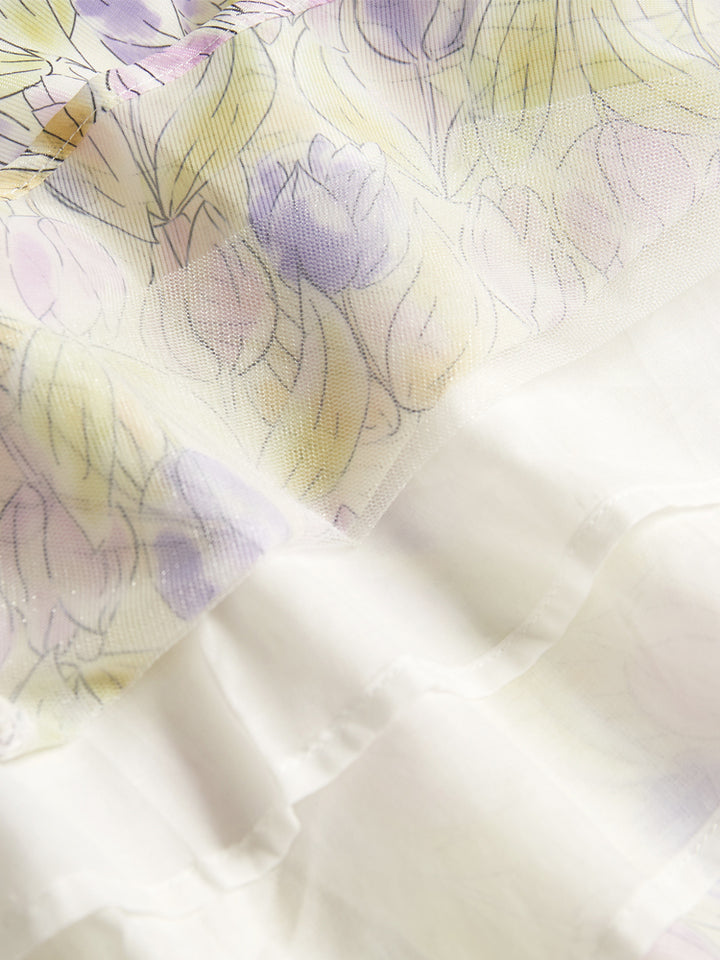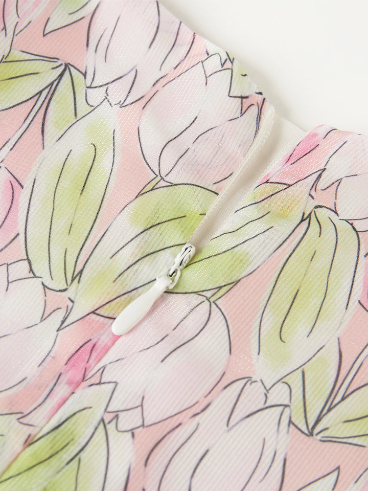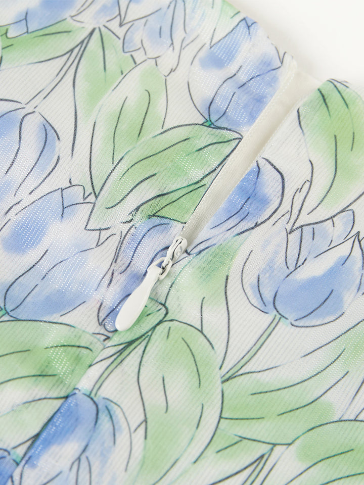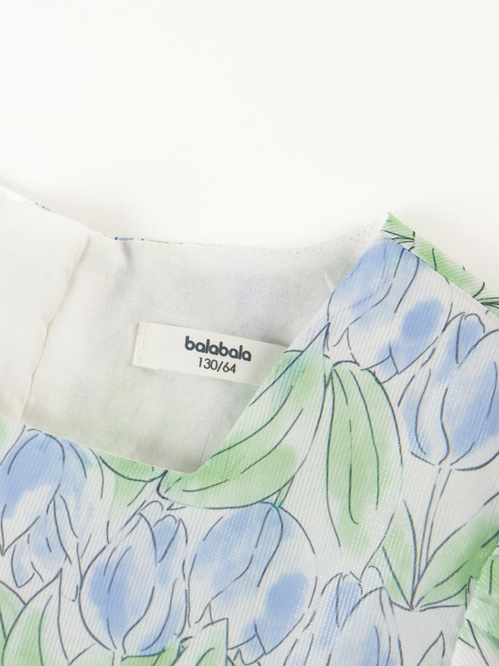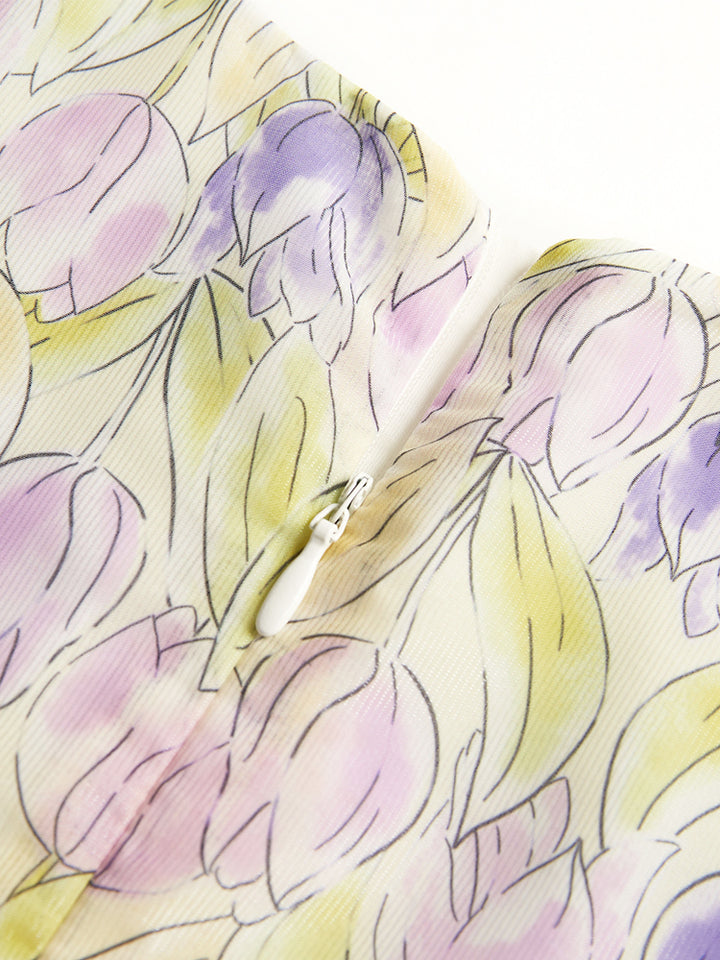 فستان بأكمام قصيرة، بخامة ناعمة وتصميم فضفاض، مزين بنمط طبعات ورود متعددة الألوان على كامل التصميم وببيونة على الجهة الخلفية، يأتي بسحاب للإغلاق من الجهة الخلفية وبياقة مستقيمة الشكل