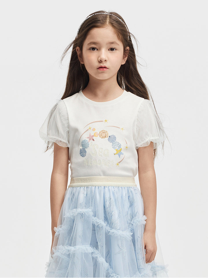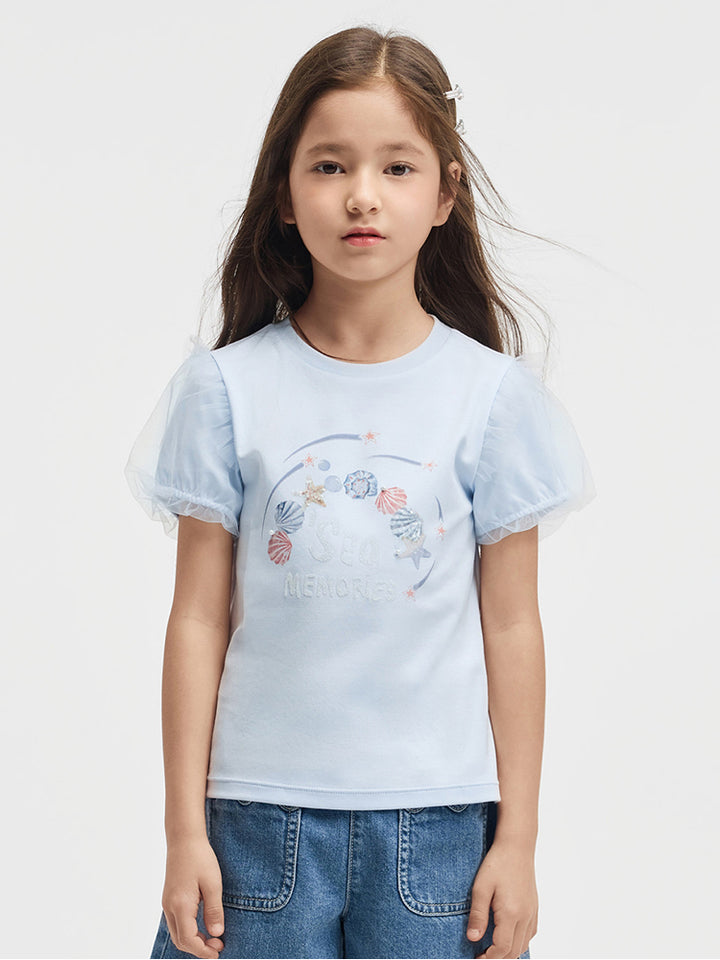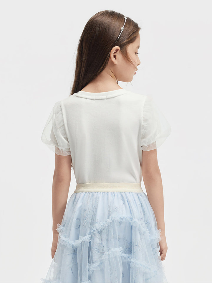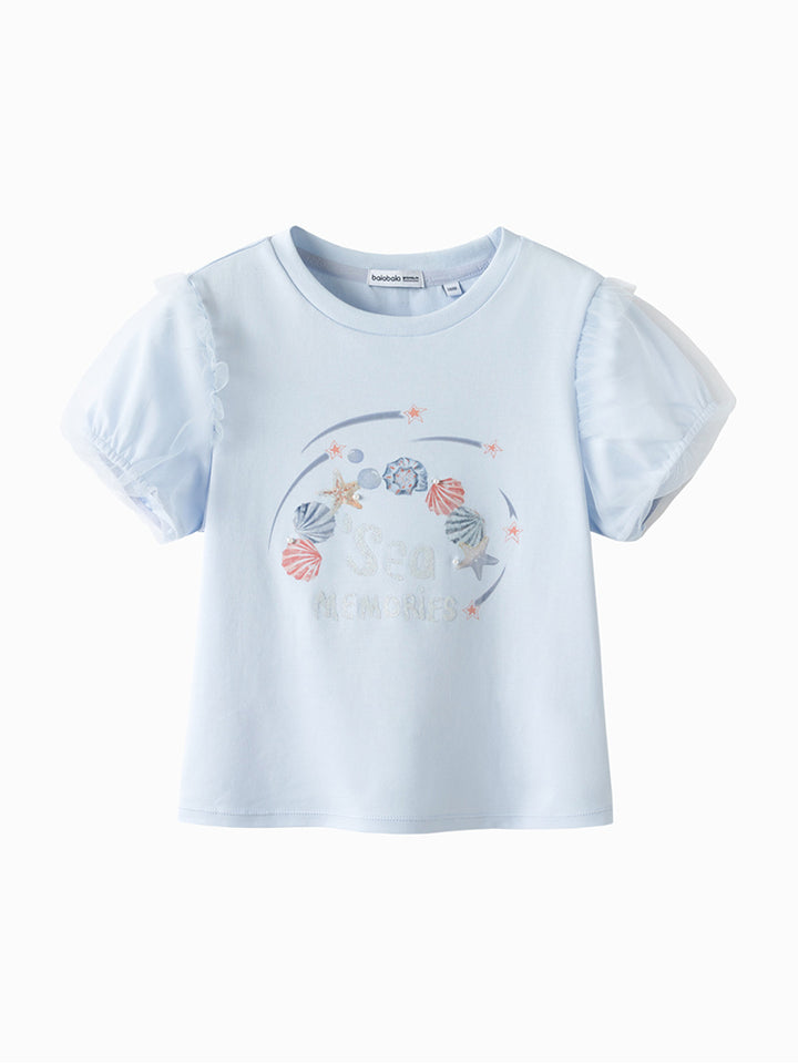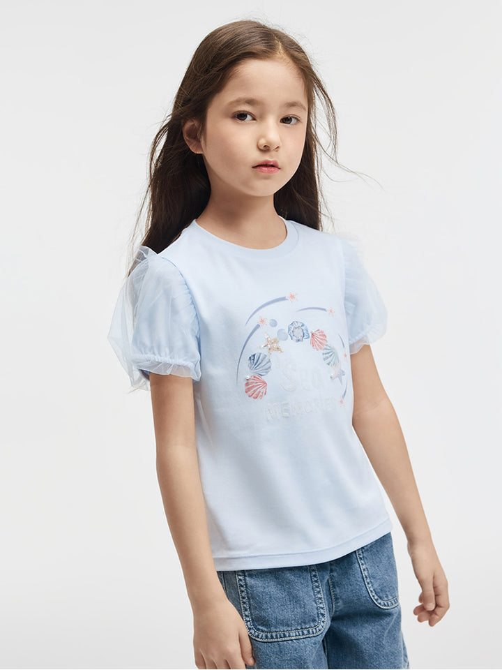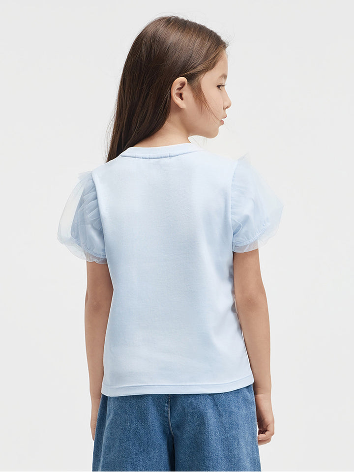 تيشيرت بناتي كاجوال بأكمام قصيرة، مزين بطبعة من الجهة الأمامية وخامة نسيج تل شبك على الأكمام، يأتي بياقة مدورة الشكل