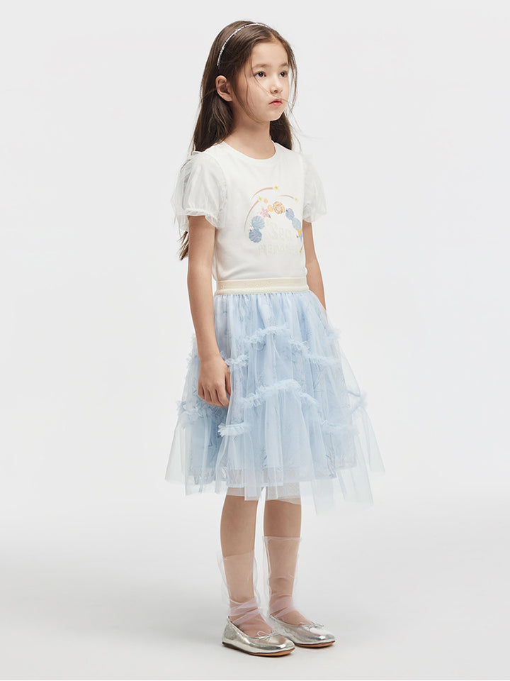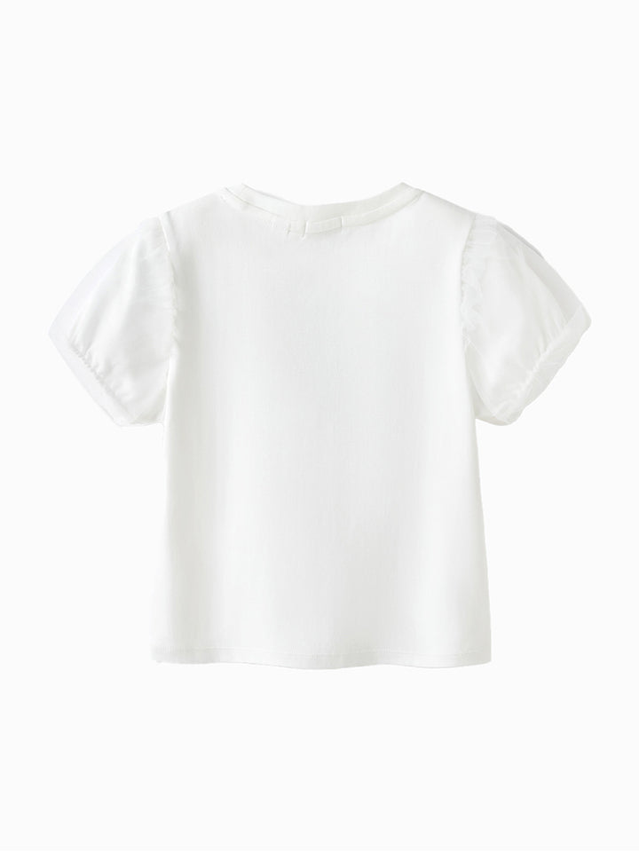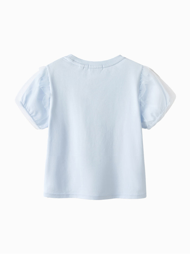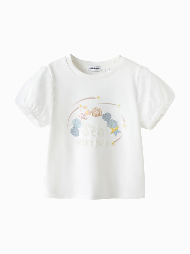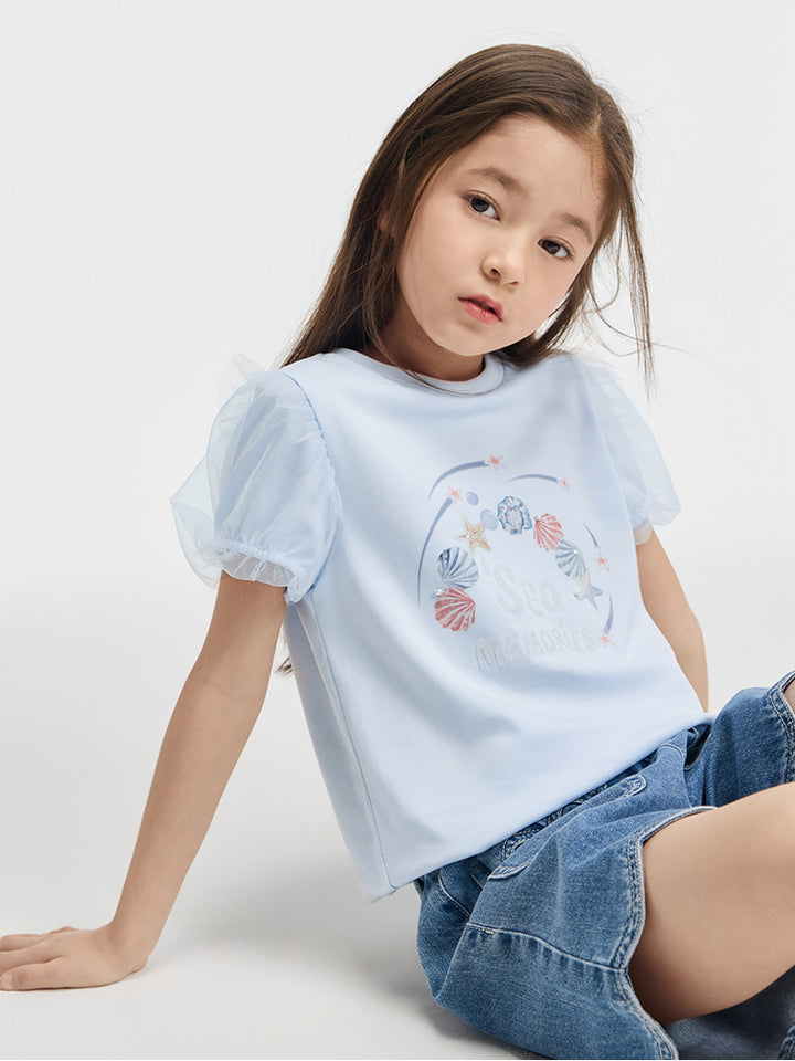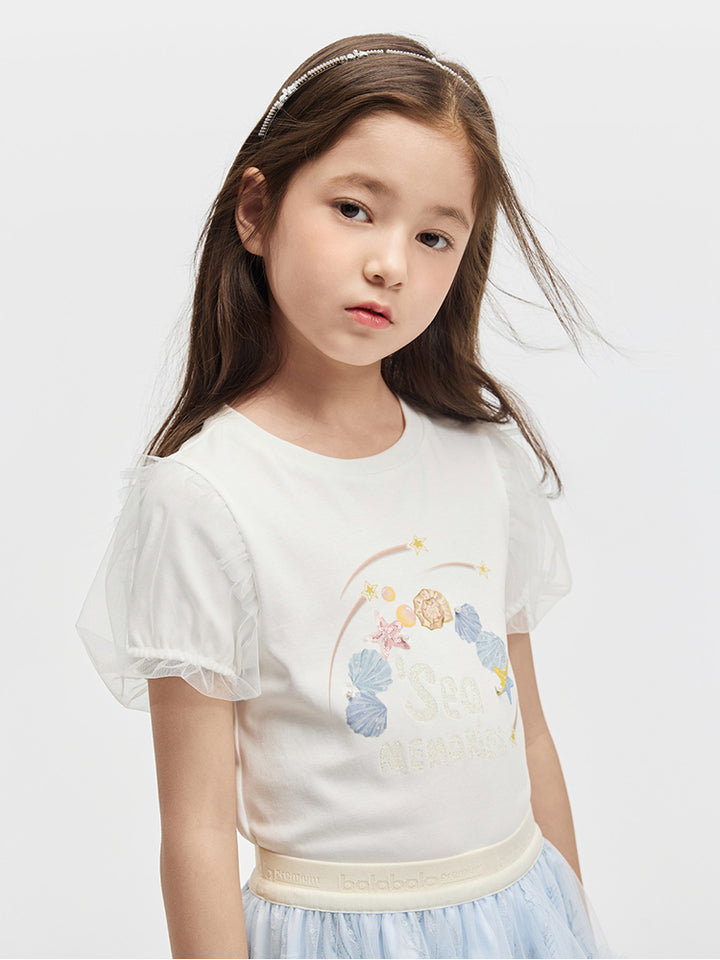تيشيرت بناتي كاجوال بأكمام قصيرة، مزين بطبعة من الجهة الأمامية وخامة نسيج تل شبك على الأكمام، يأتي بياقة مدورة الشكل