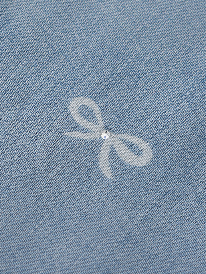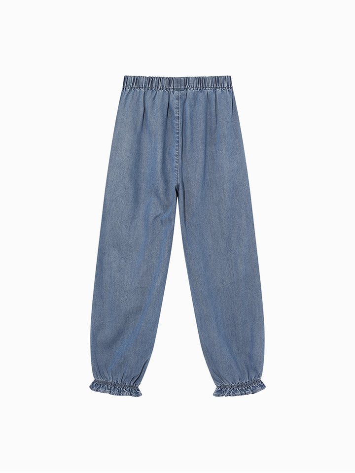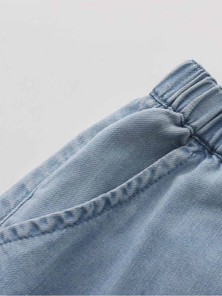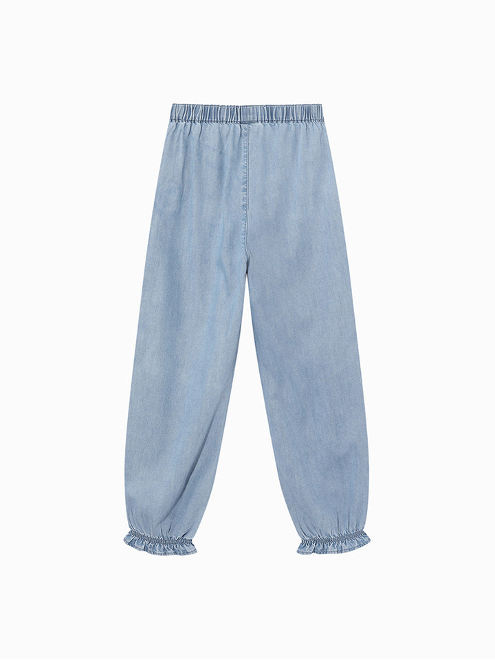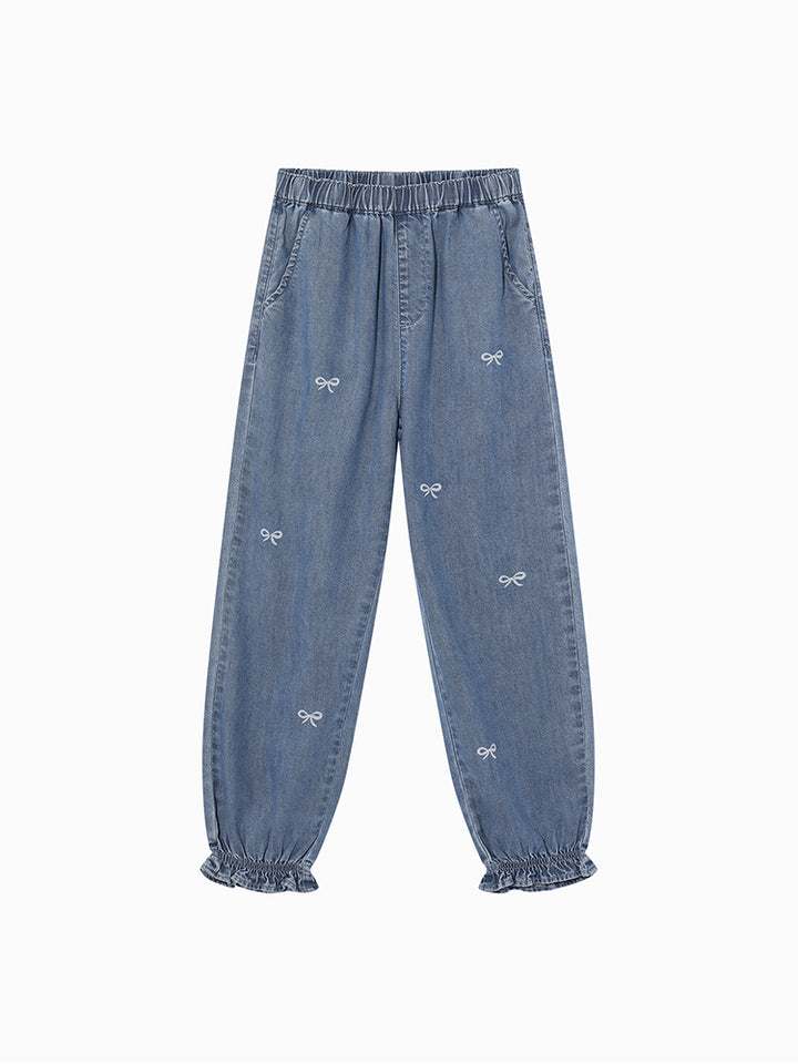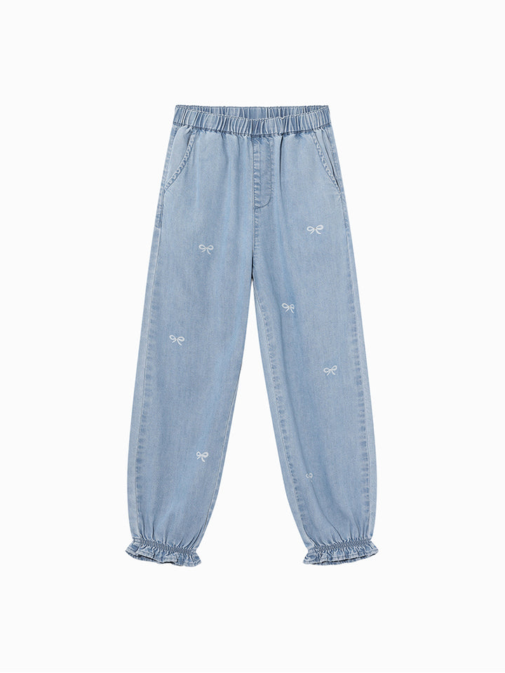 بنطلون جينز مزين بنمط طبعات من الجهة الامامية، يأتي بجيوب أمامية وخصر مطاطي مريح