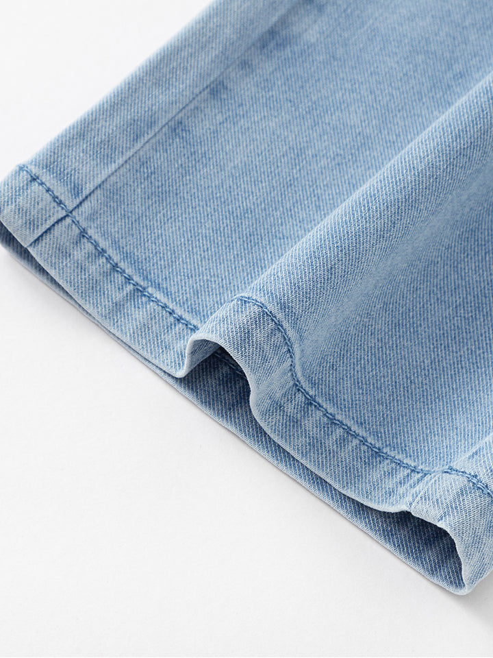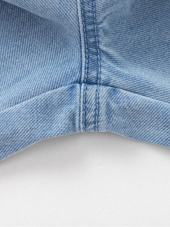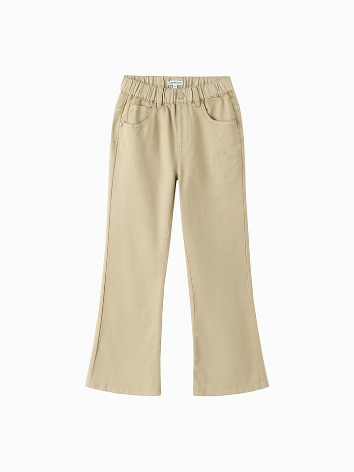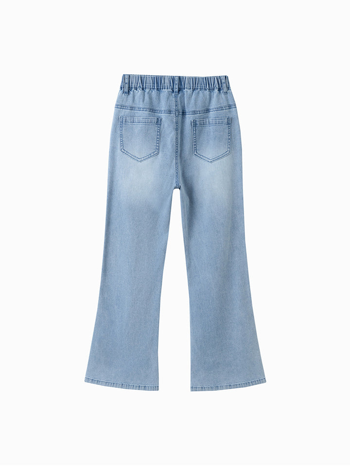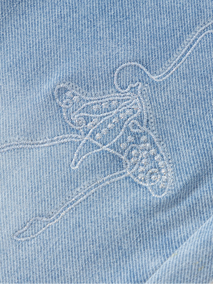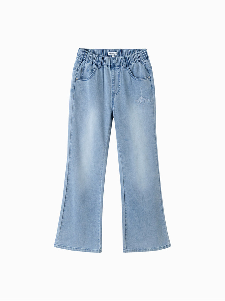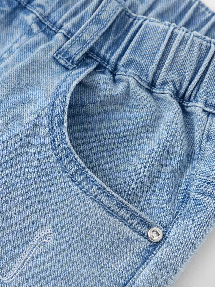 بنطلون جينز كاجوال، مزين بتفاصيل مسحات باهتة وتطريز على أحد الساقين من الجهة الأمامية، يأتي بجيوب أمامية وخلفية وبخصر مطاطي مريح