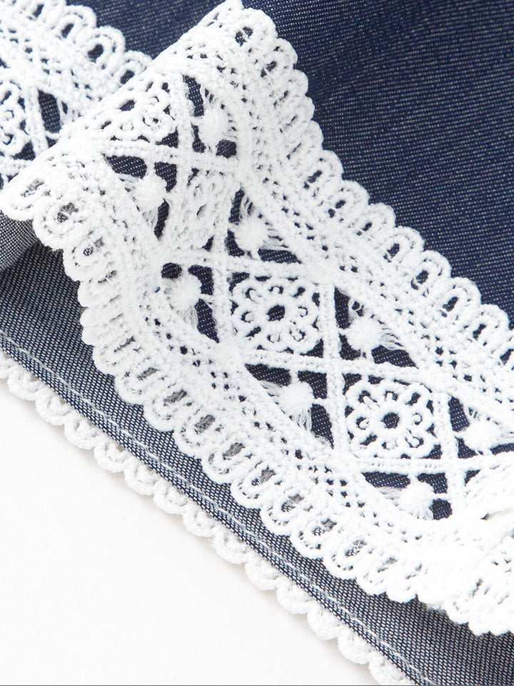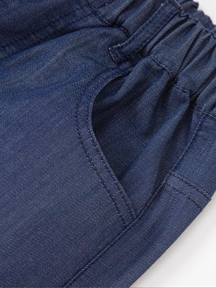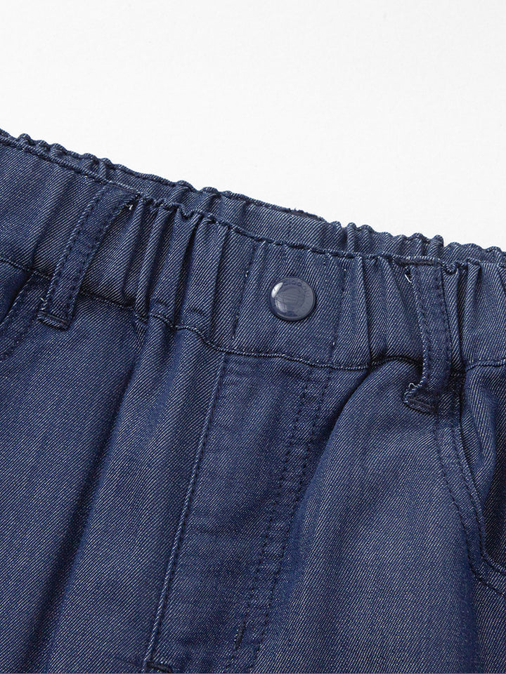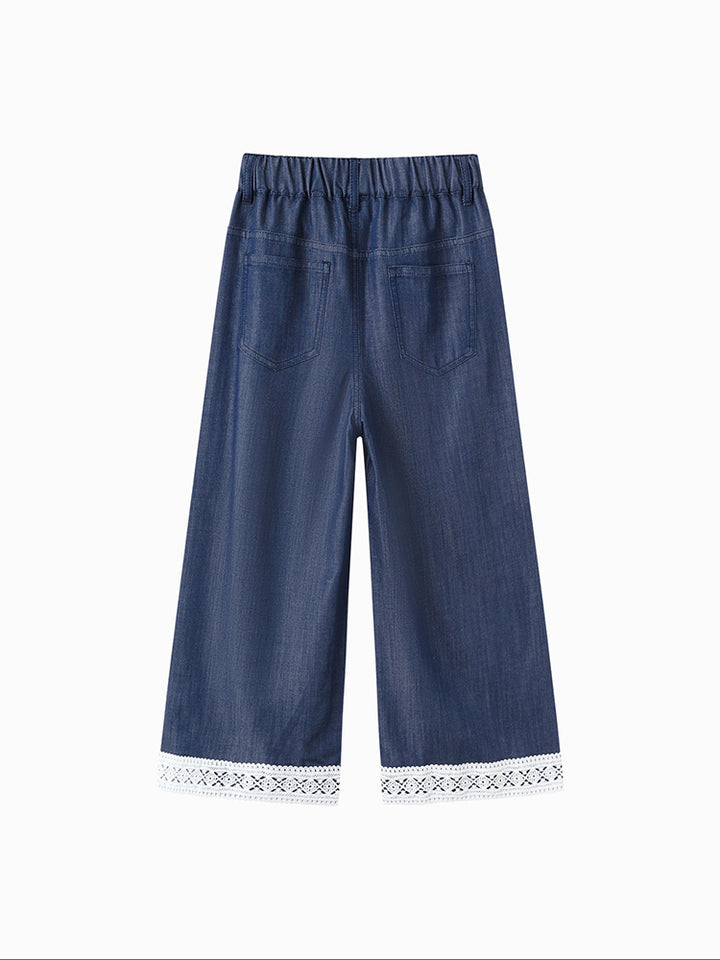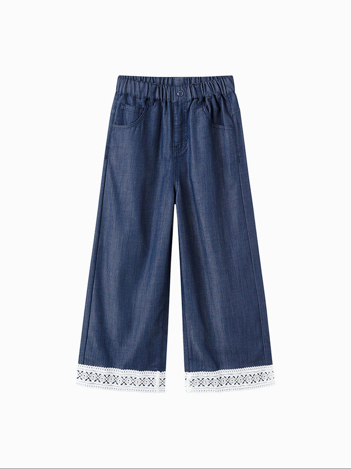 بنطال جينز أنيق للأطفال بتصميم بلون ثابت، جيوب أمامية وخلفية، وتفاصيل كروشيه عند أسفل الأرجل. مع خصر مطاطي لراحة مثالية، ليكون إضافة مميزة لأي خزانة ملابس