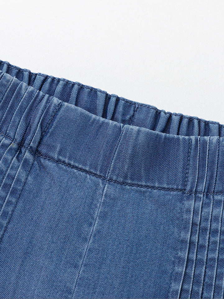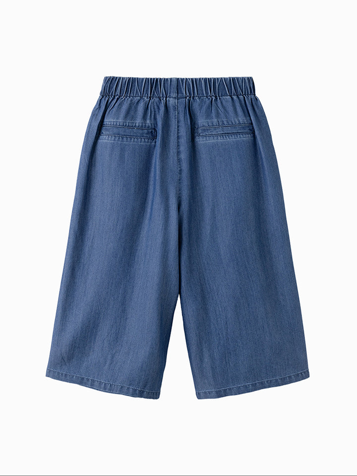 بنطال جينز كولوت عصري للأطفال بتصميم بلون ثابت، مع جيوب أمامية وخلفية. الخصر المطاطي يضمن راحة وملاءمة مثالية، مما يجعله خيارًا أنيقًا وسهل الارتداء للمغامرات اليومية